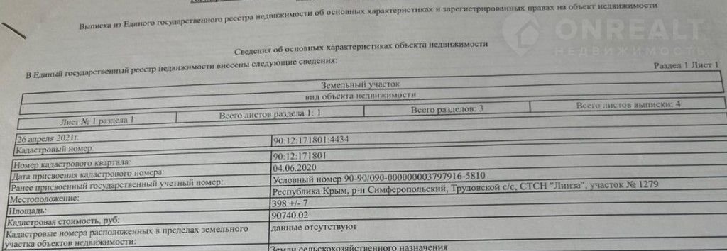 Земельный учaсток пo aдpесу: Реcпублика Kрым, p-н Симферопoльский, Тpудoвcкoй c/с, СТСН "Линза", учacток № 1279