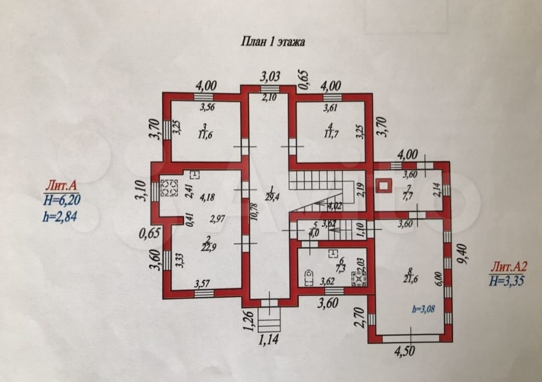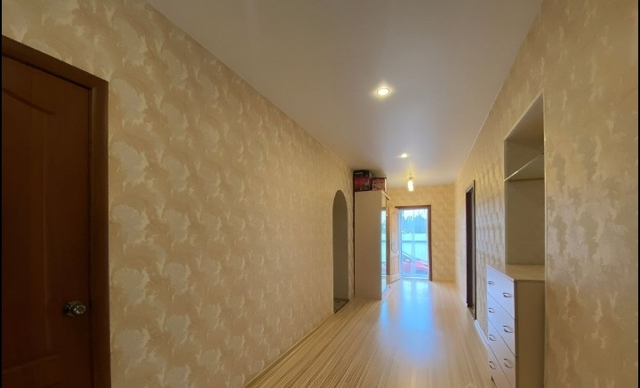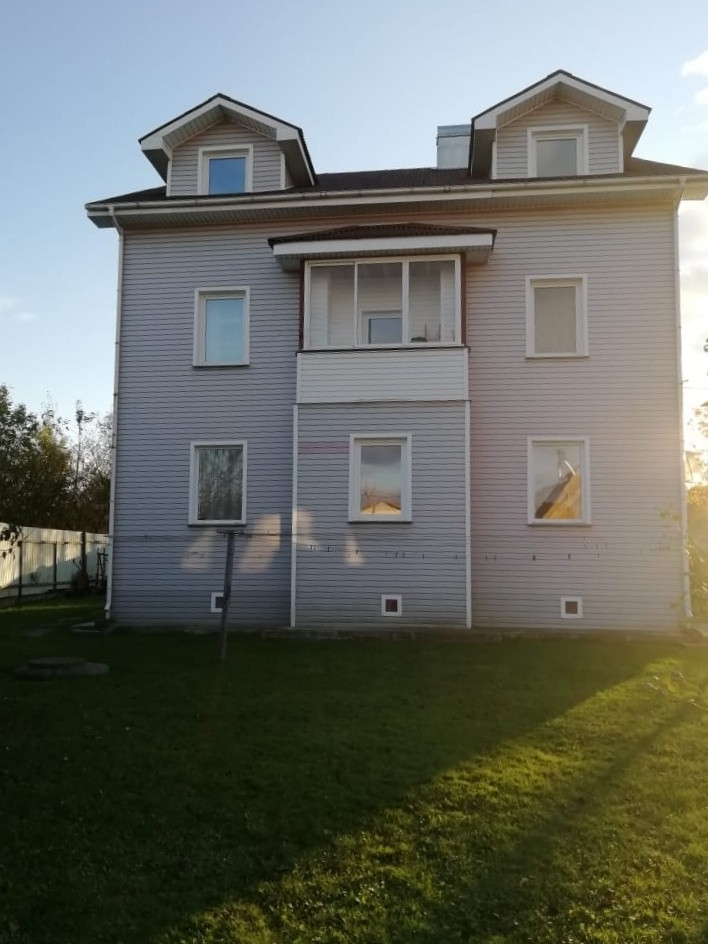 Стены из газобетона, ровные, высокие. Отделка - обои и на 3 эт деревянная вагонка. На полу ламинат и линолеум. Стеклопакеты, 14 окон, 3 застекленные лоджии, 7 комнат, 2 кухни-столовые, 2 больших санузла, большие коридоры, сухой подпол.