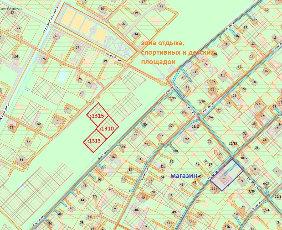 У участка выставлены границы на местности. Получен градостроительный план. Есть возможность выкупить смежный участок 12 соток 78:42:0018503:1310 (в собственности) чтобы получить расширенный участок на 24 сотки.