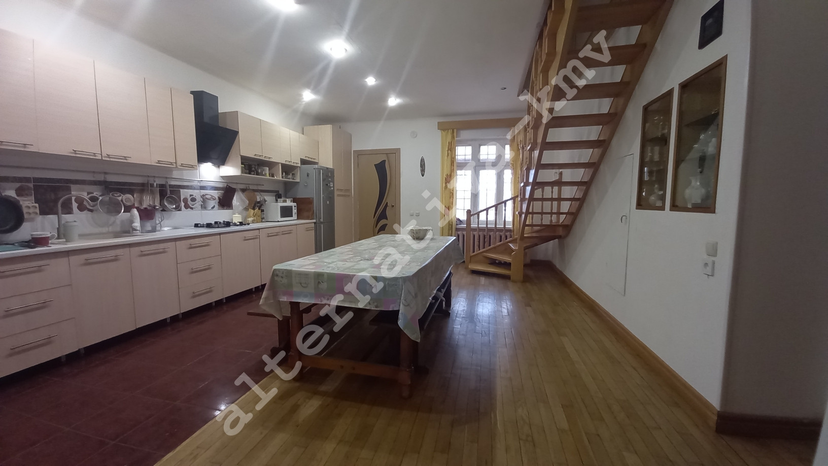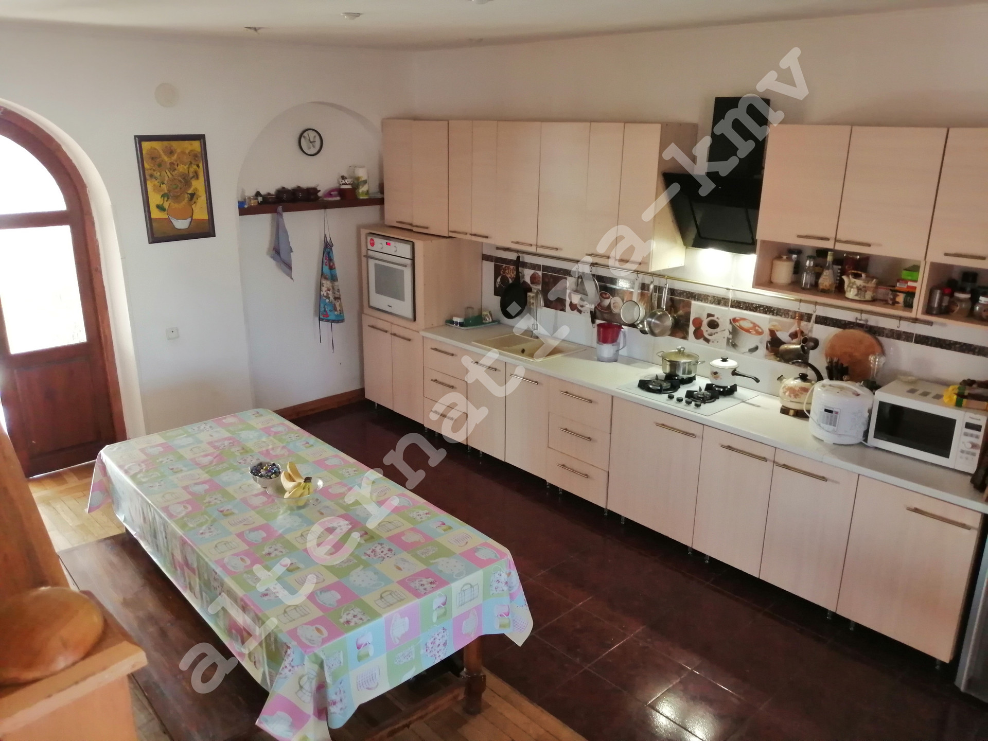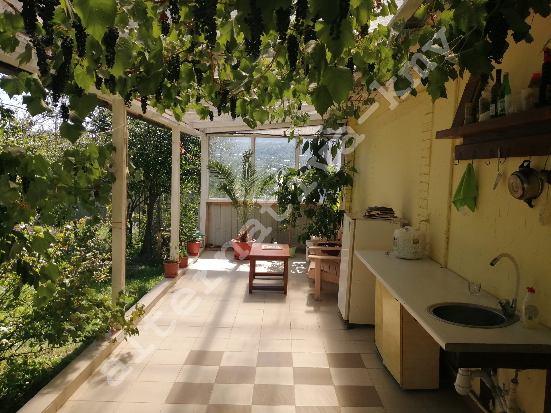 В доме просторная гостиная, уютный зал большая и светлая кухня-столовая, пять комфортных спальных комнат, три сан-узла,  две бытовых комнаты,  а так же сауна на дровах, большая лоджия с великолепным видом на горы. Имеется гараж на одну машину. Оптоволоконный интернет и 3-х фазная система электроснабжения.