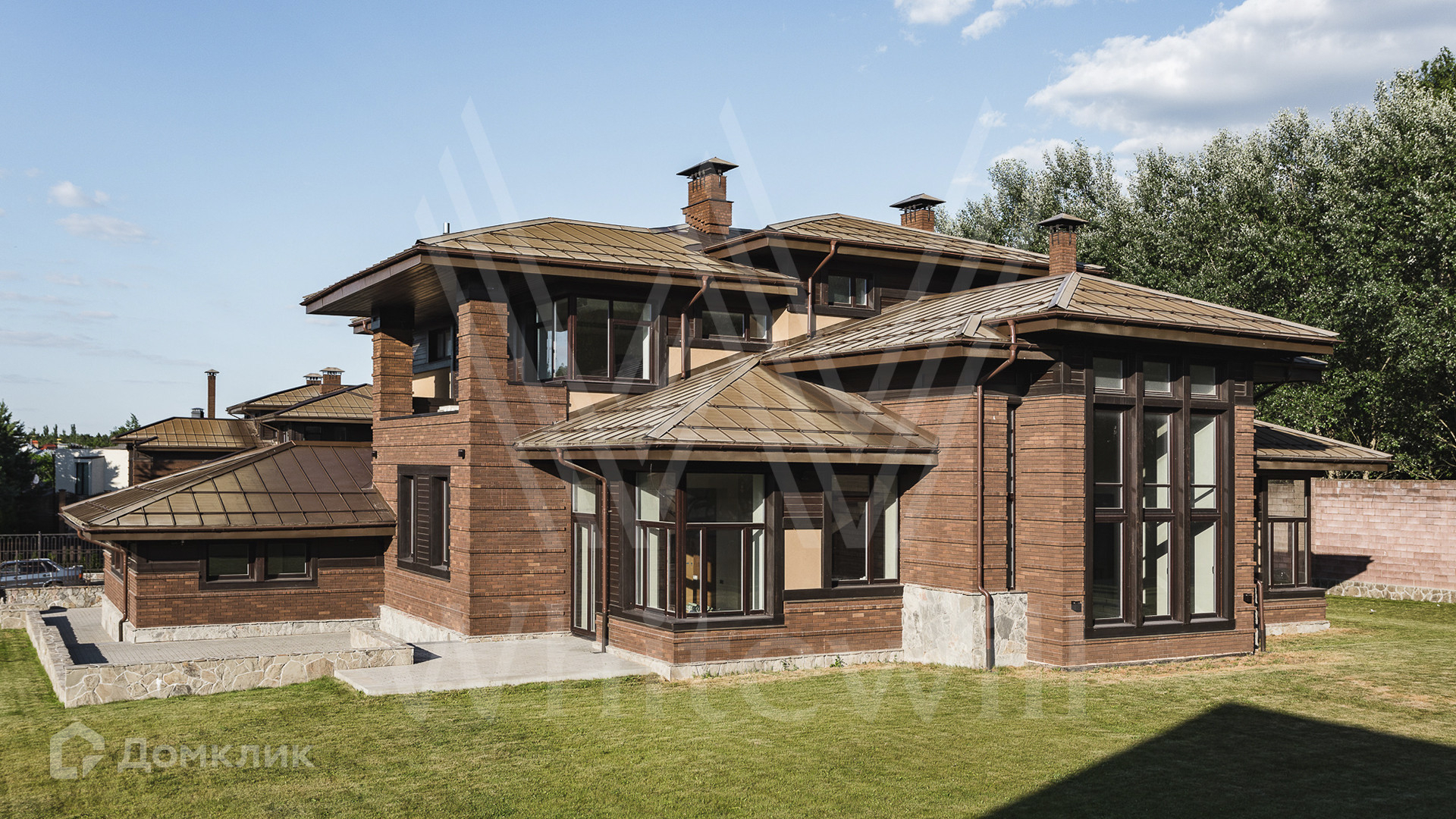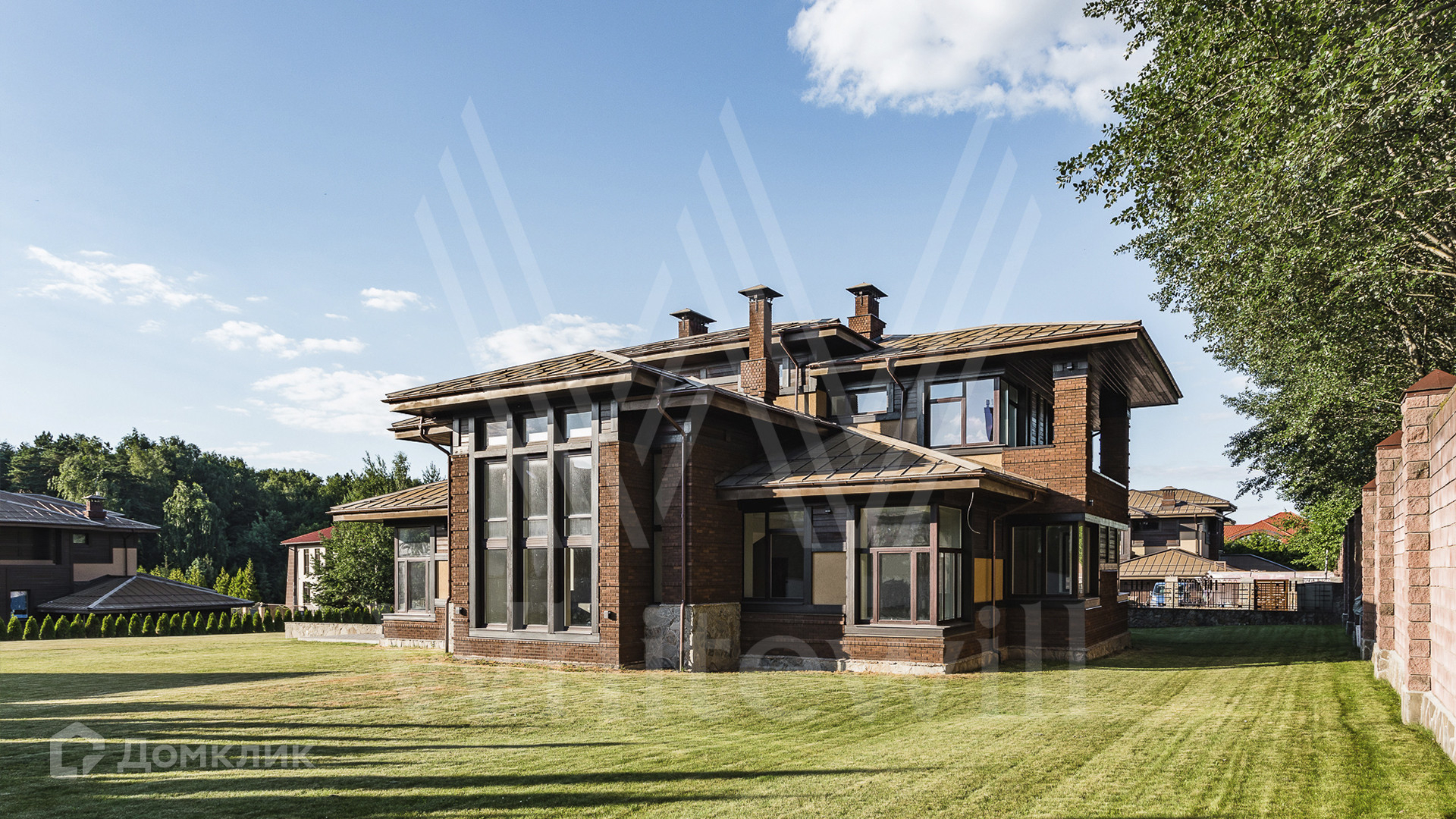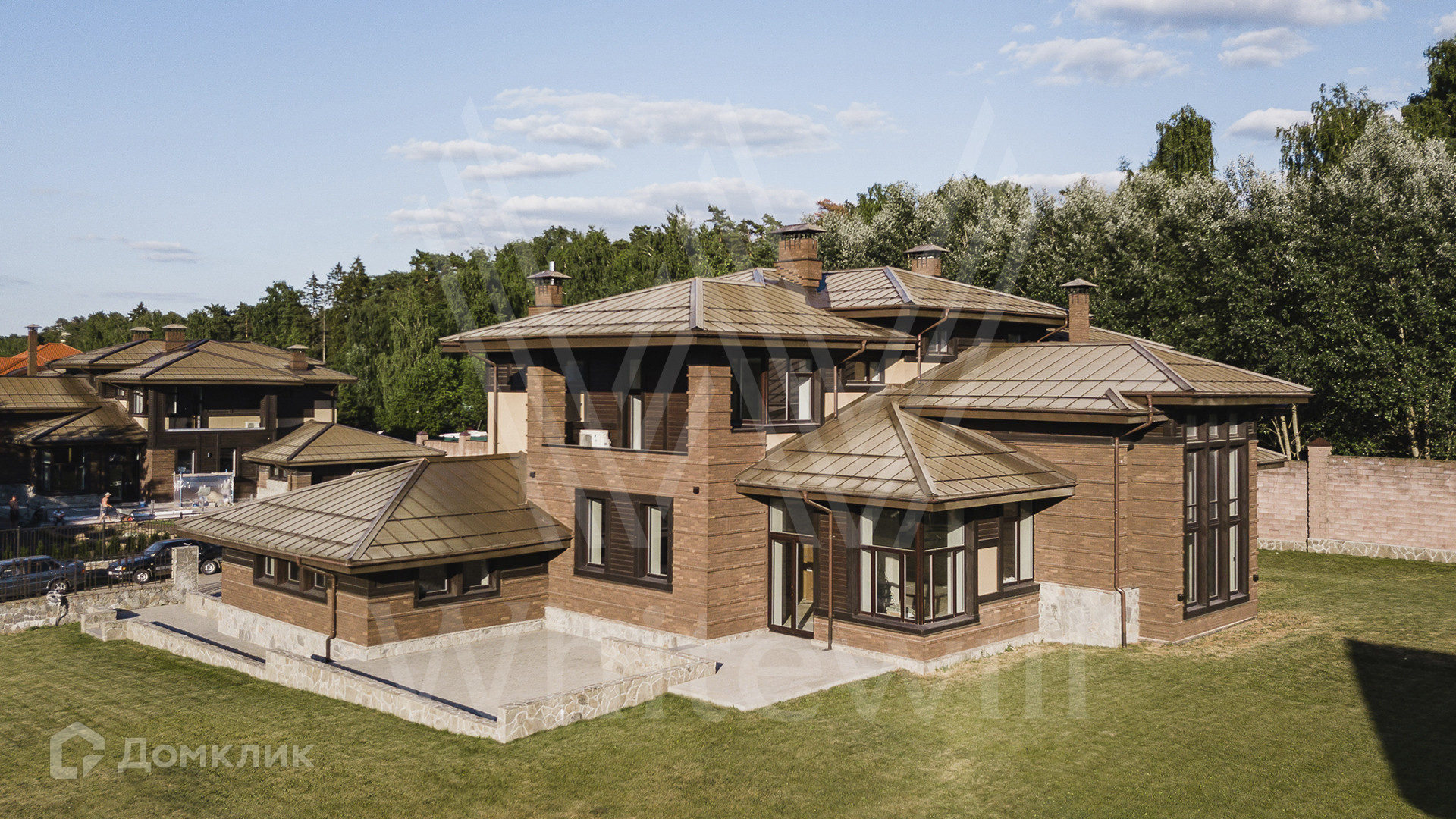ID 10 690. Архангельское. Новый двухэтажный коттедж площадью 500 м² на участке 27 соток. Крыша выполнена из меди, фасад облицован декоративным кирпичом, натуральным камнем и деревом.  В отделке дома использованы натуральные материалы — мрамор, керамогранит и инженерная доска из дуба.   В просторной гостиной с камином много света благодаря панорамному окну.  В каждой спальне 2-го этажа имеются выходы на террасы.  Дом оборудован современной бытовой техникой, установлена эксклюзивная сантехника.  На первом этаже дома спроектирован гараж на 2 автомобиля.  На участке засеян дренажный газон и высажены туи.