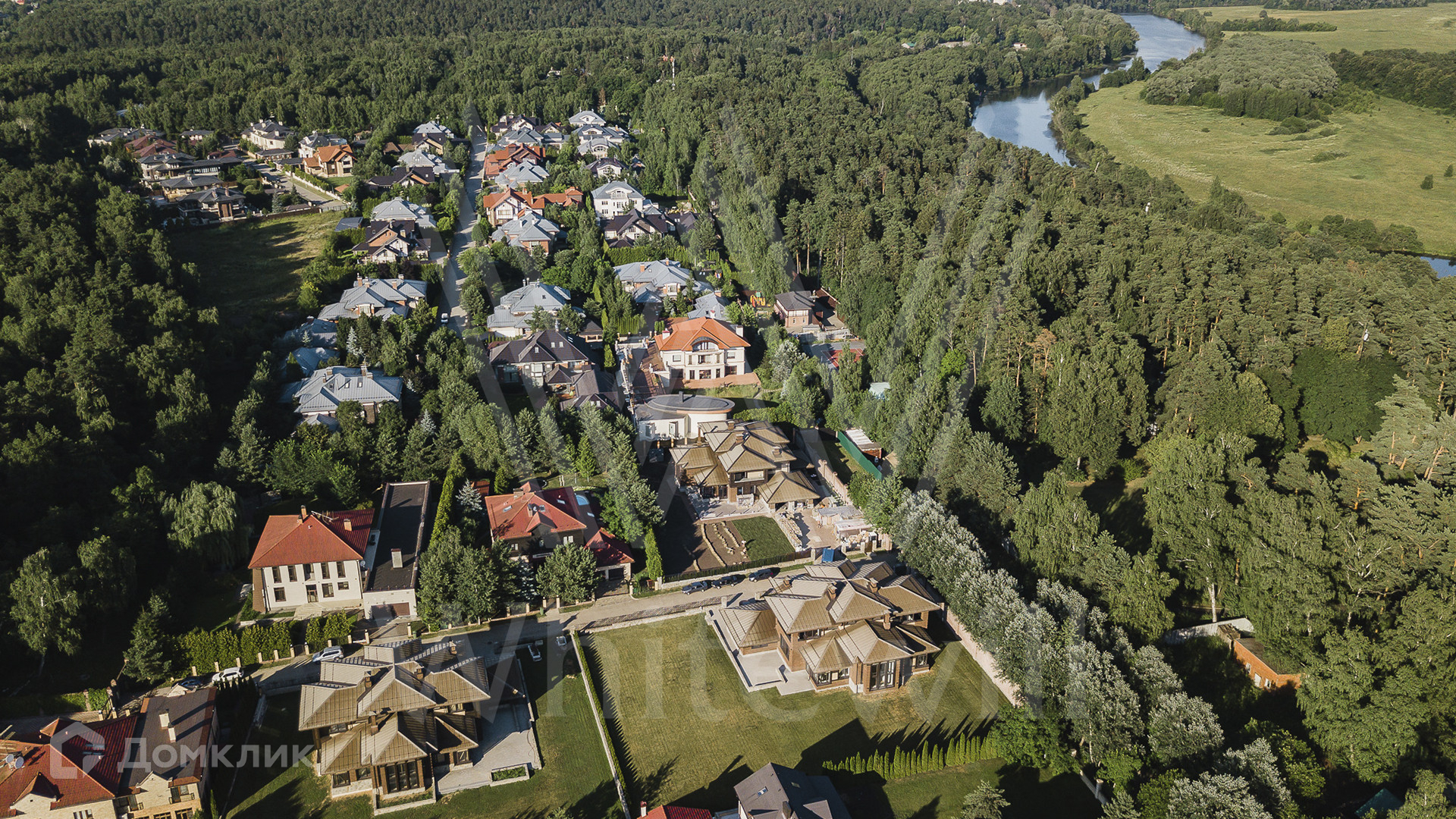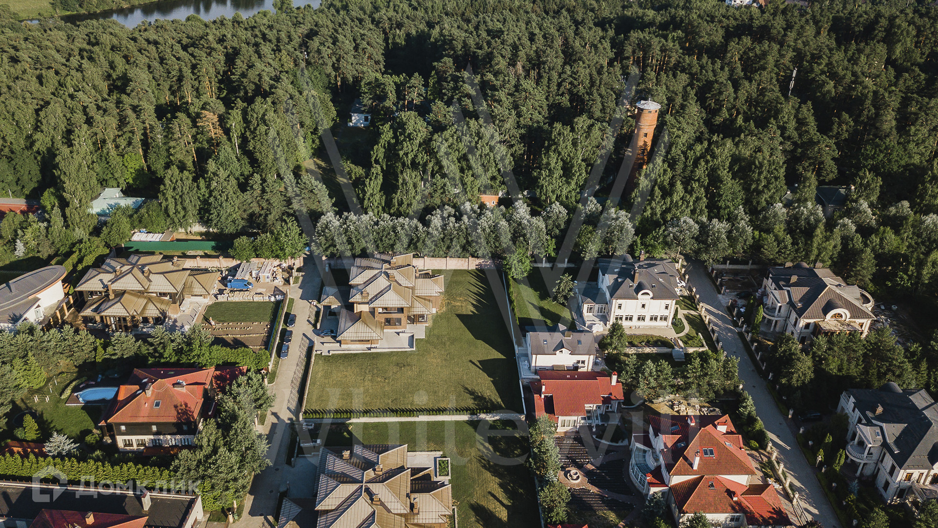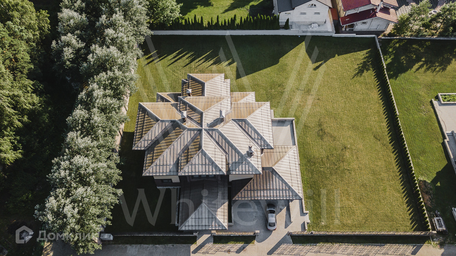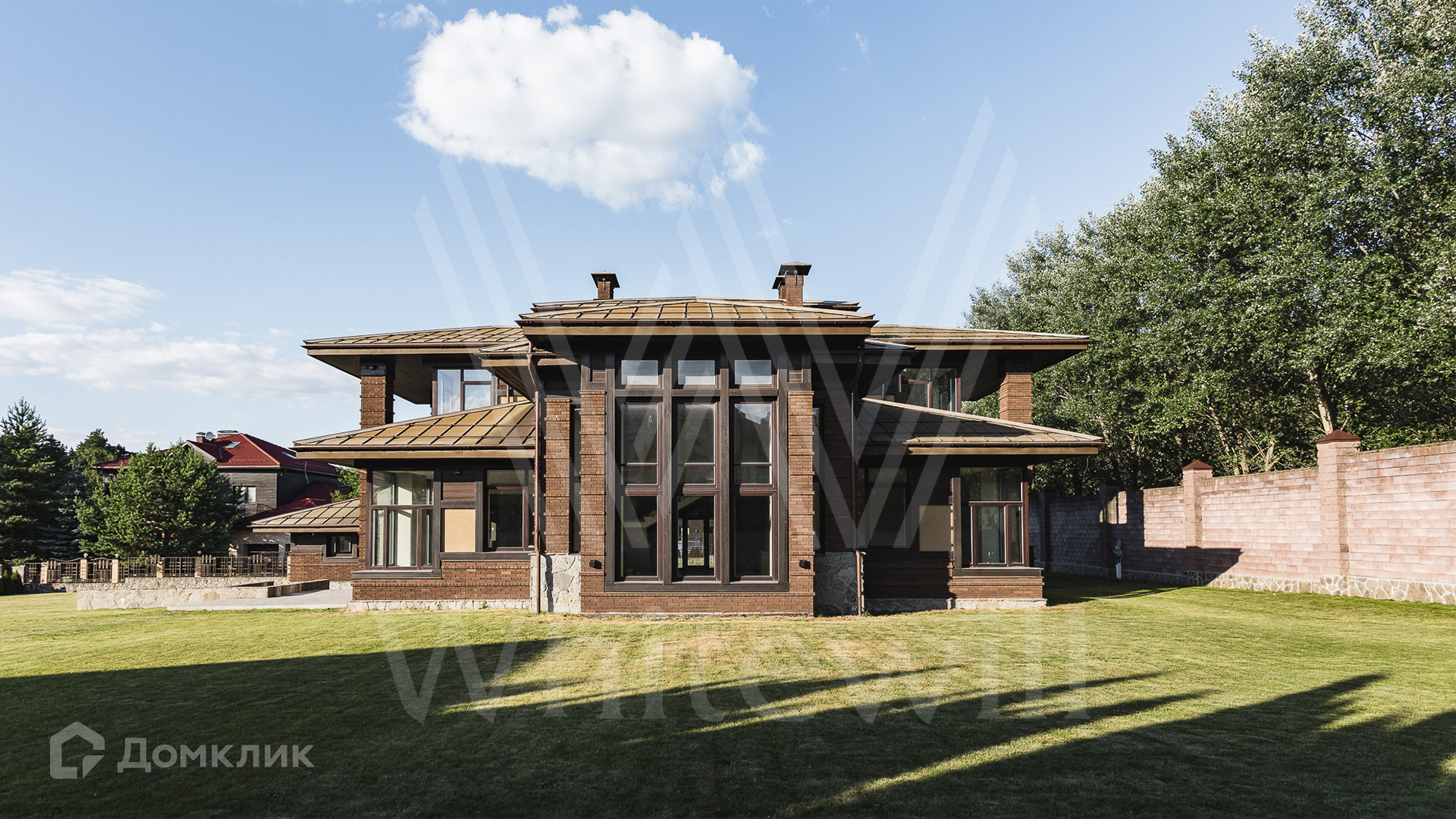 ID 10 690. Архангельское. Новый двухэтажный коттедж площадью 500 м² на участке 27 соток. Крыша выполнена из меди, фасад облицован декоративным кирпичом, натуральным камнем и деревом.  В отделке дома использованы натуральные материалы — мрамор, керамогранит и инженерная доска из дуба.   В просторной гостиной с камином много света благодаря панорамному окну.  В каждой спальне 2-го этажа имеются выходы на террасы.  Дом оборудован современной бытовой техникой, установлена эксклюзивная сантехника.  На первом этаже дома спроектирован гараж на 2 автомобиля.  На участке засеян дренажный газон и высажены туи.