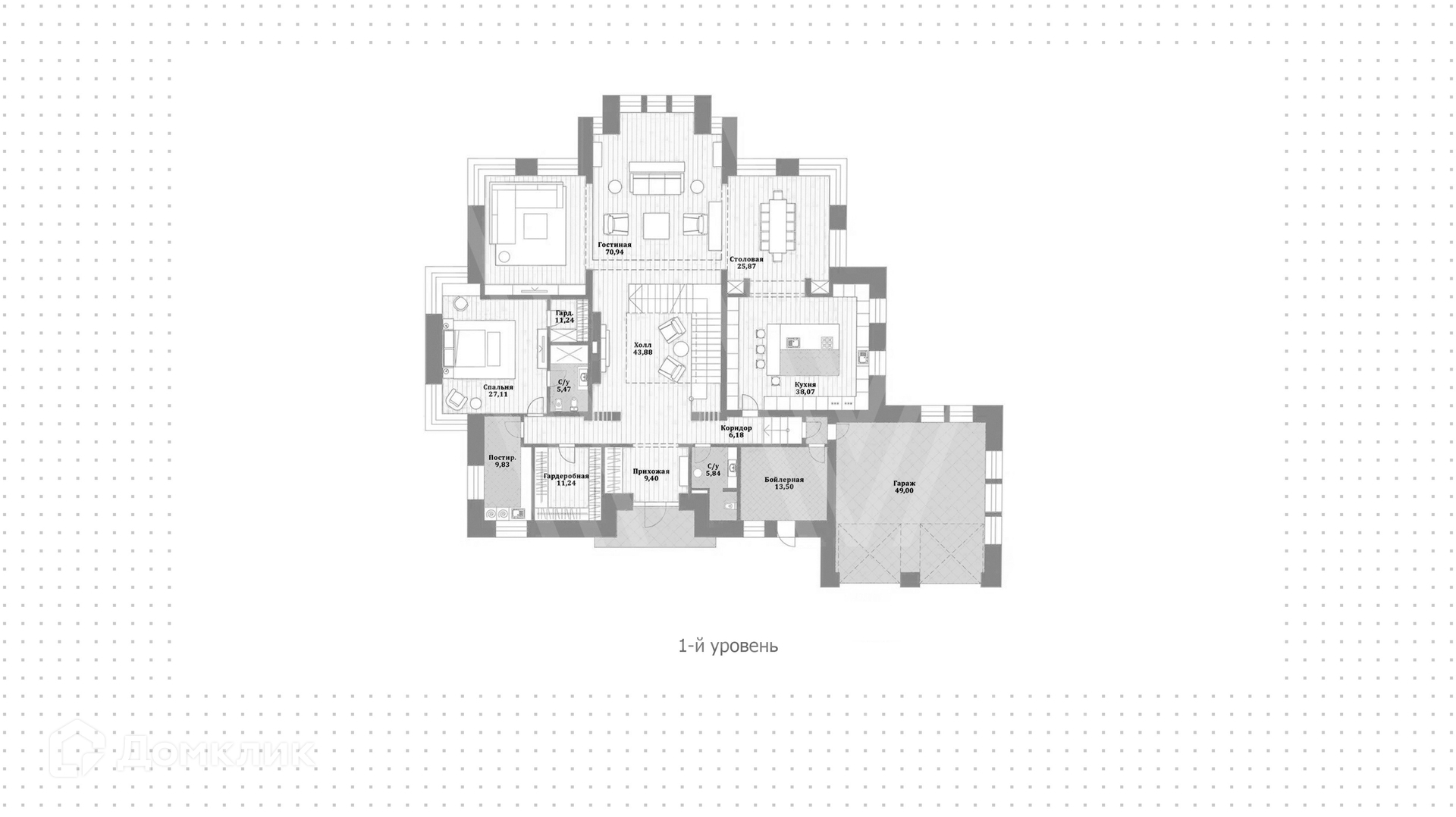 1-й уровень: холл, гардеробная, санузел, бойлерная, кухня, столовая, гостиная с камином, гостевая спальня с санузлом и гардеробной, постирочная.