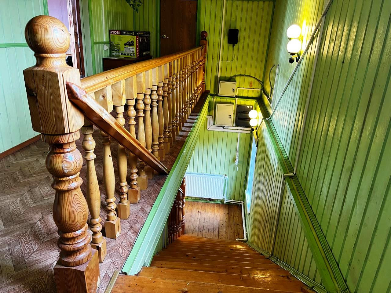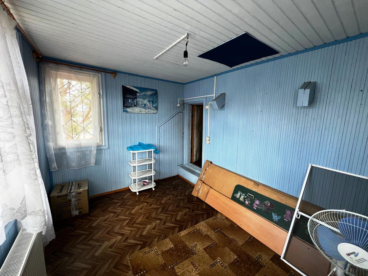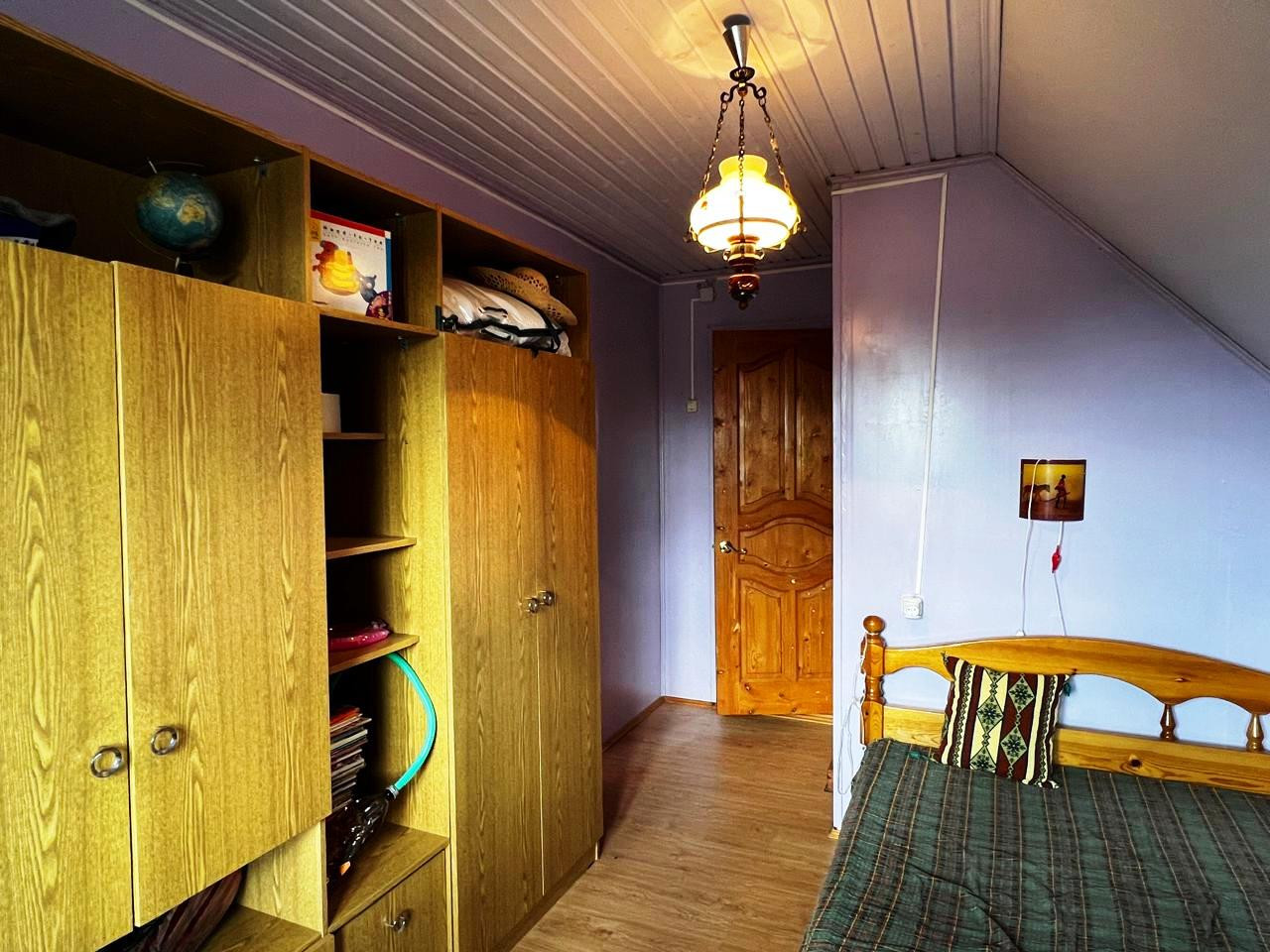 На первом этаже: одна комната, просторная кухня, совмещенный санузел, прихожая и терраса. Есть погреб. На втором этаже – две изолированные комнаты (спальни) и детское игровое помещение (на фото – голубого цвета). Также на втором этаже предусмотрены подсобные помещения для хранения вещей и небольшой чердак. Удобная лестница на второй этаж, что важно для возрастных людей.