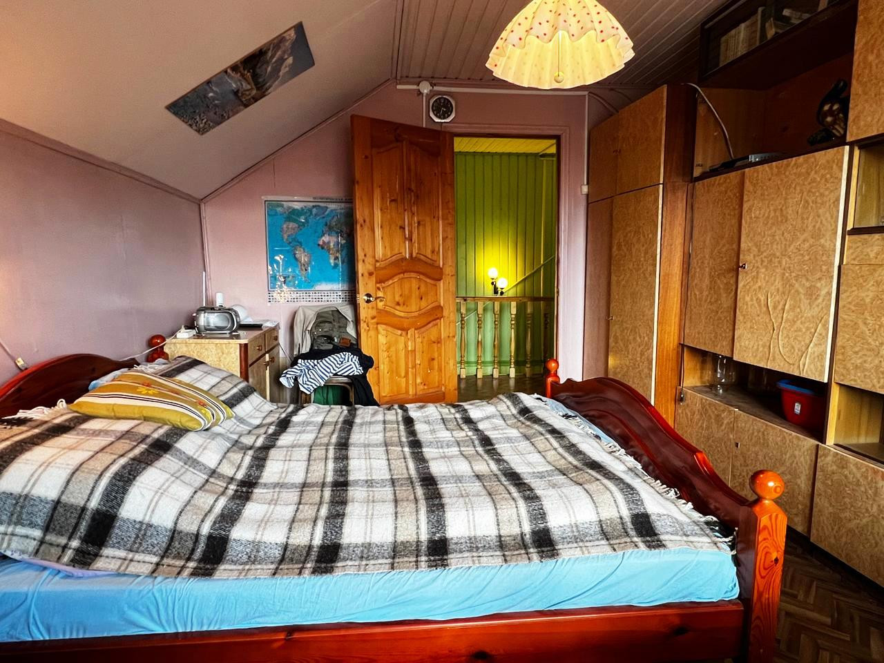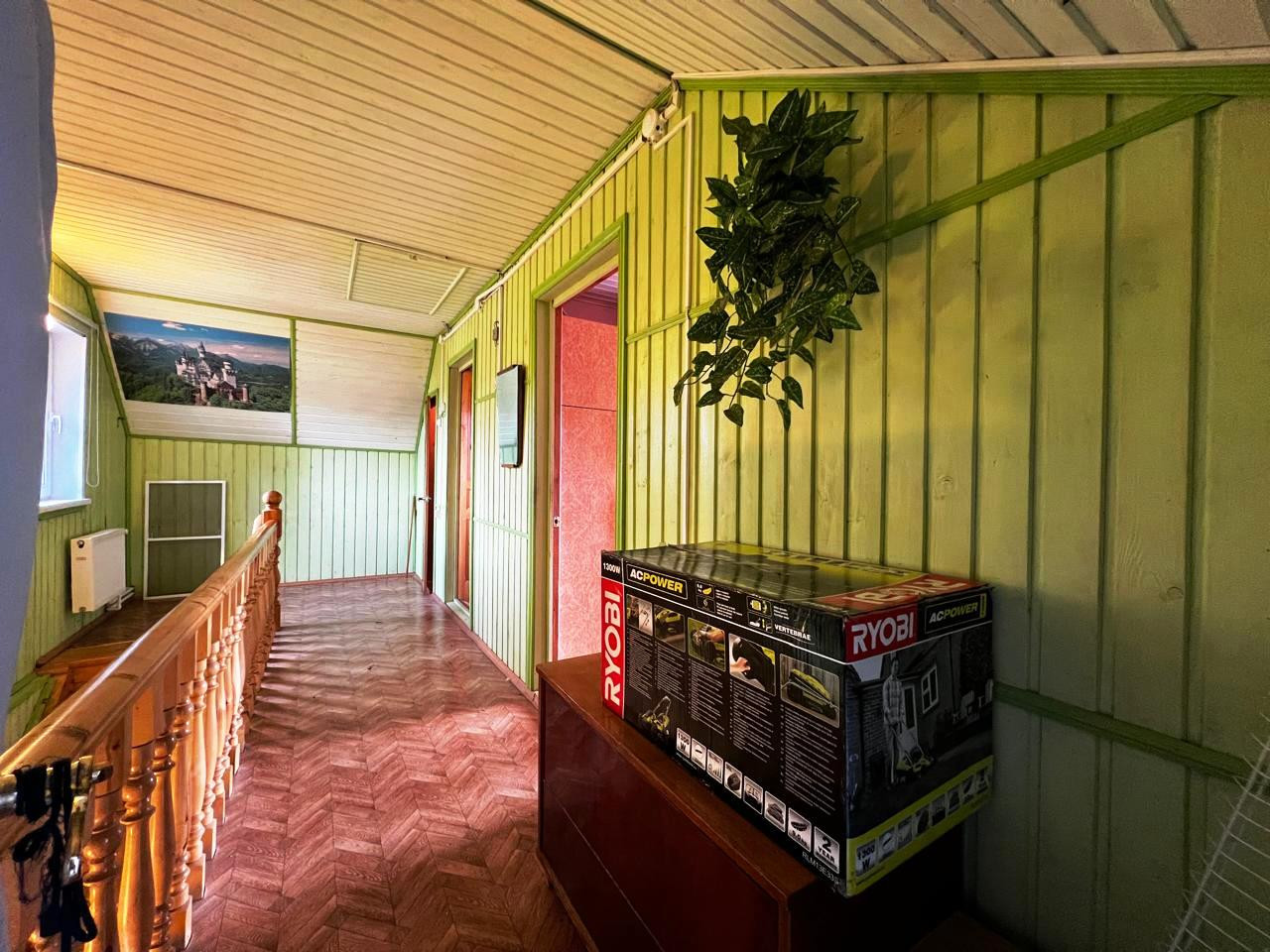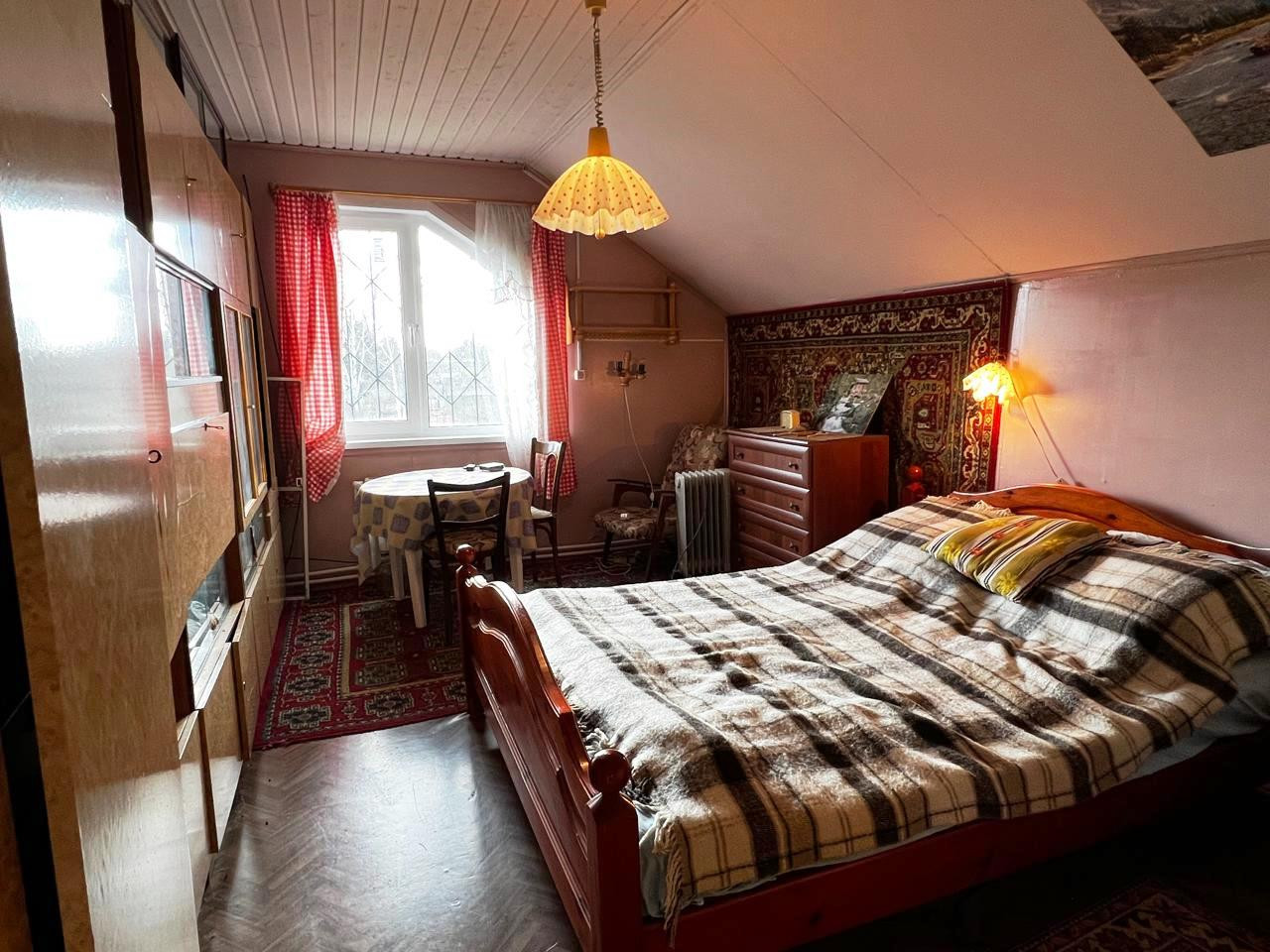 На первом этаже: одна комната, просторная кухня, совмещенный санузел, прихожая и терраса. Есть погреб. На втором этаже – две изолированные комнаты (спальни) и детское игровое помещение (на фото – голубого цвета). Также на втором этаже предусмотрены подсобные помещения для хранения вещей и небольшой чердак. Удобная лестница на второй этаж, что важно для возрастных людей.