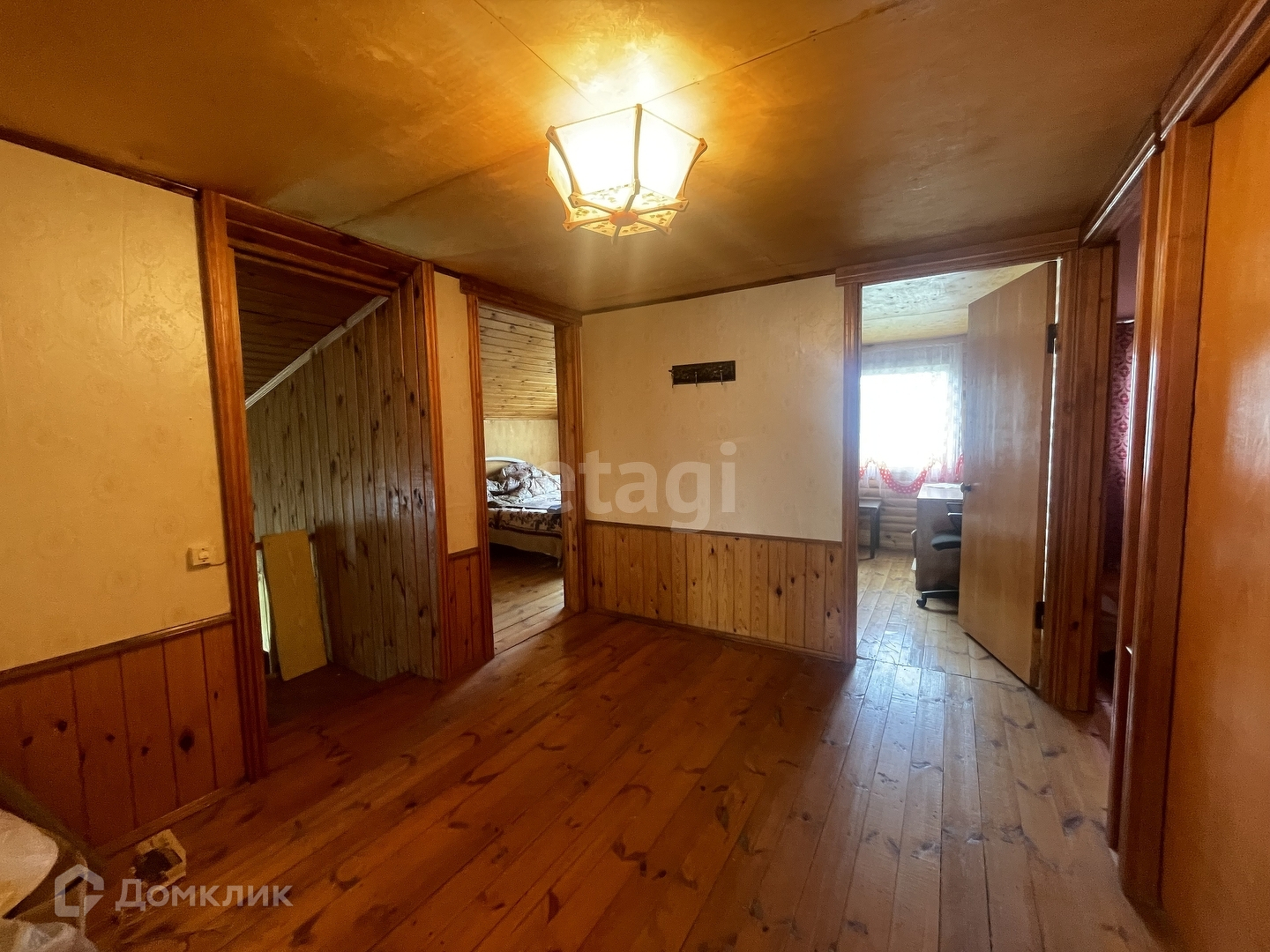 В доме печное отопление, заведена вода (есть скважина), подключено электричество. На первом этаже большая комната-гостиная, кухня и летняя веранда. На втором этаже 5 спален. Так же в доме есть гараж на один автомобиль.