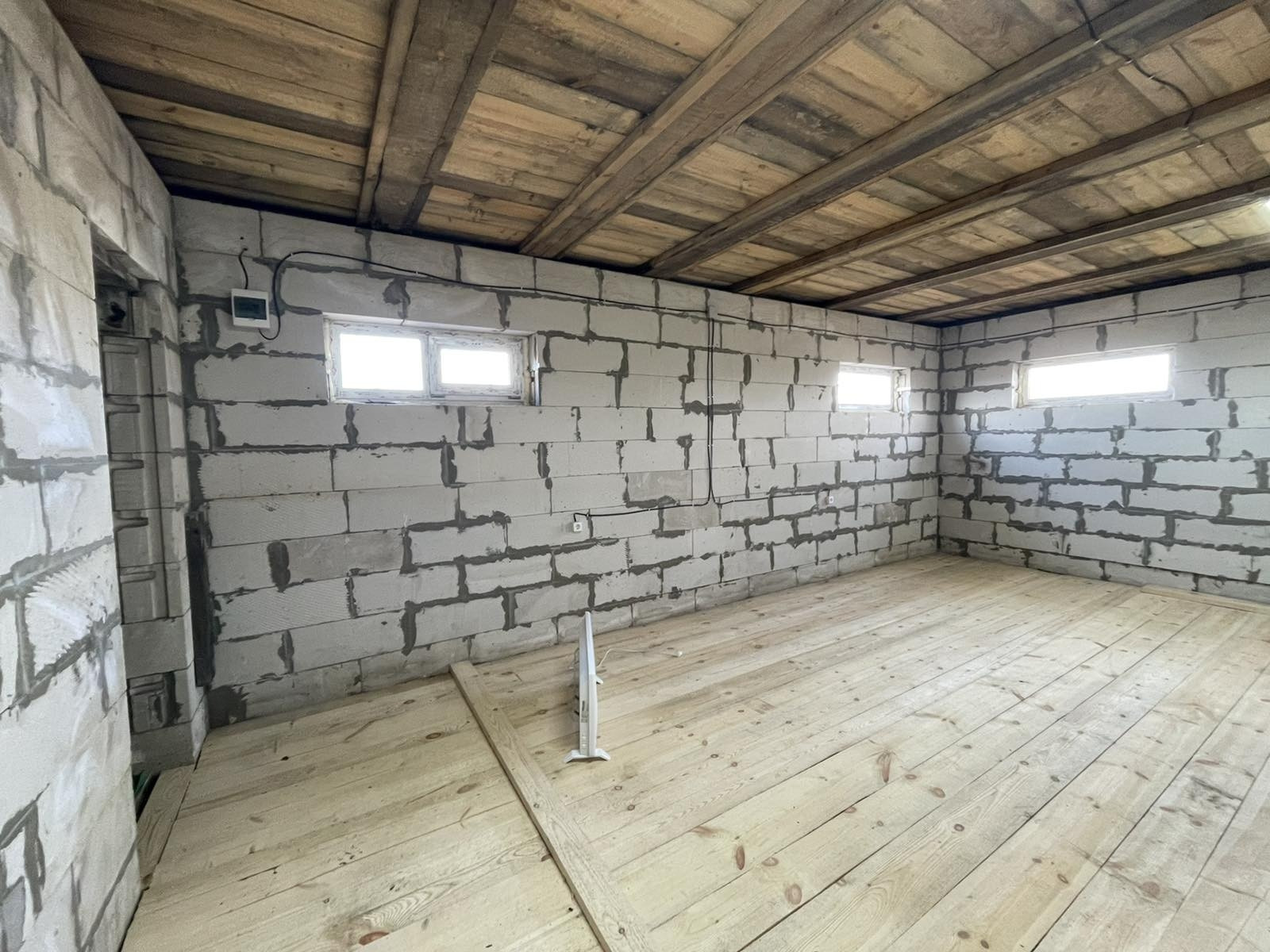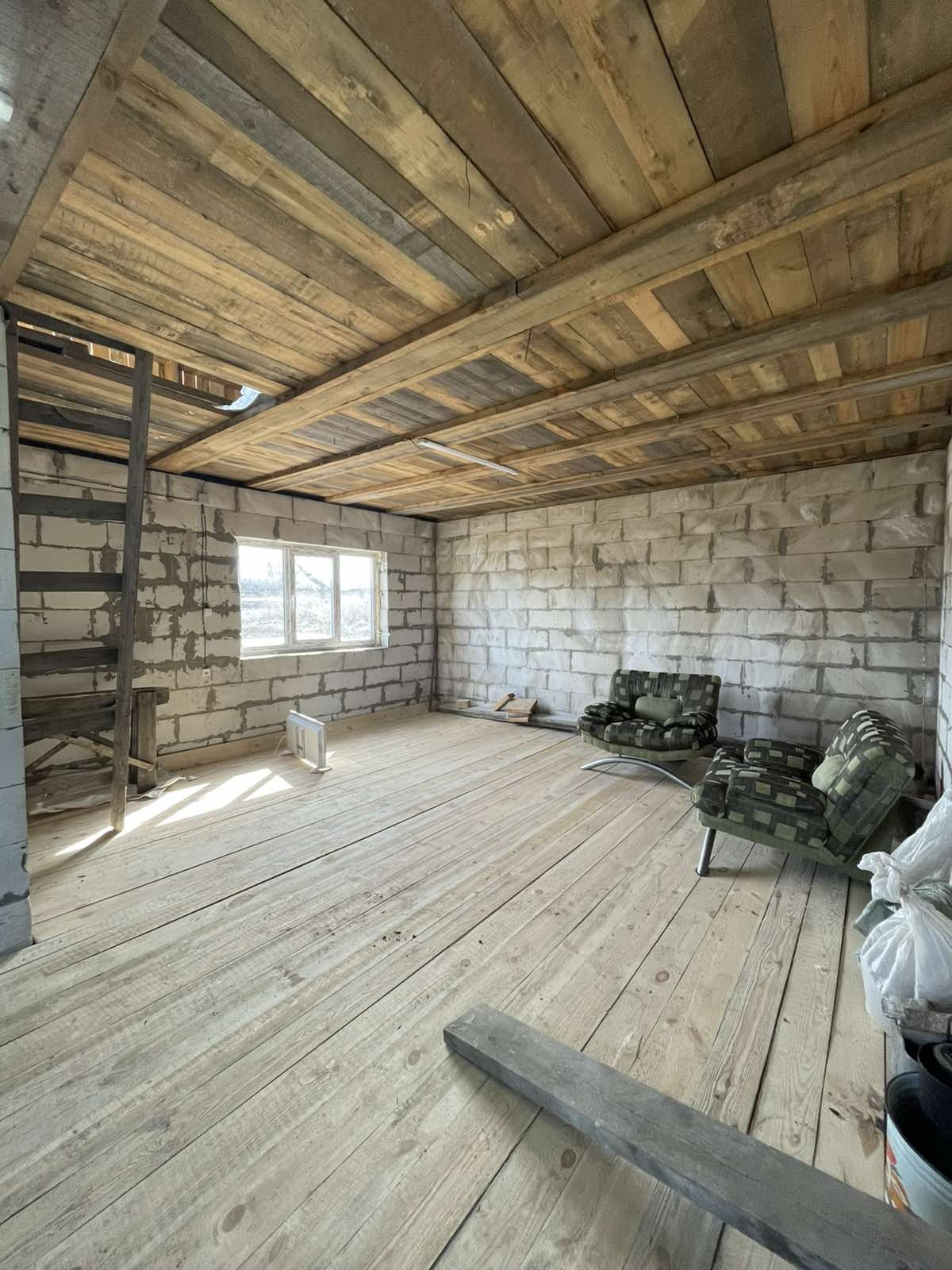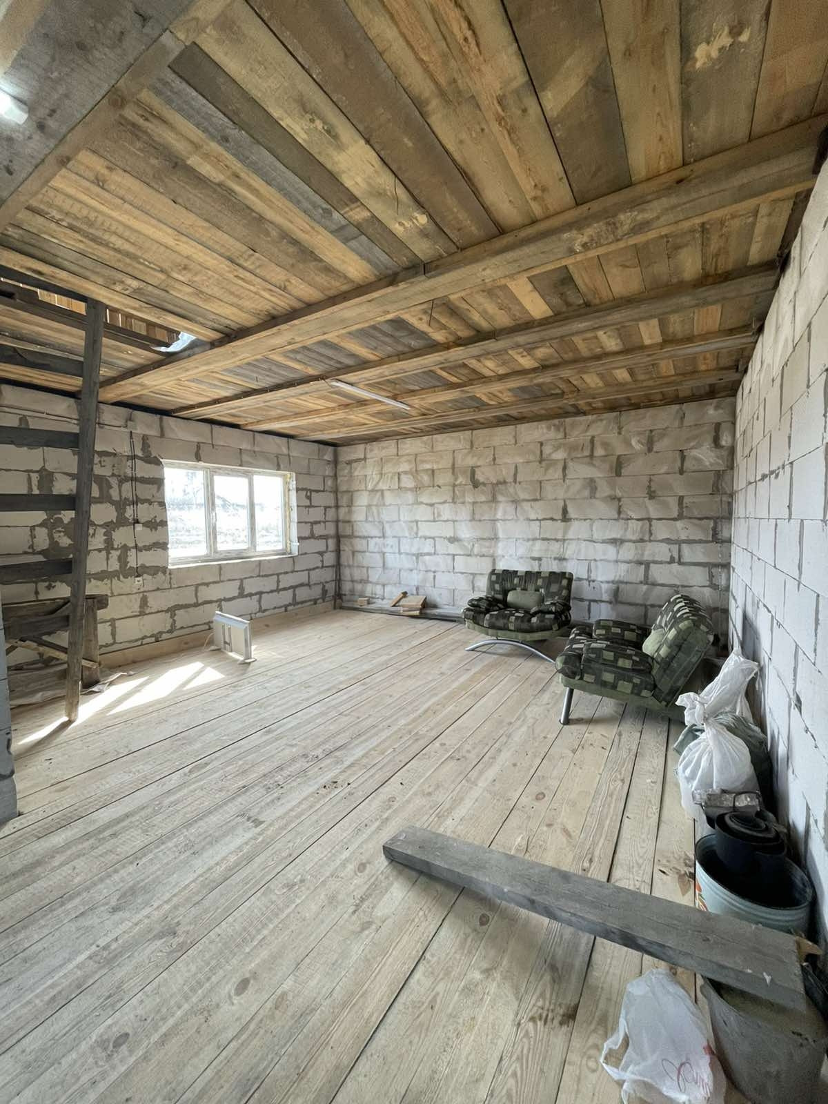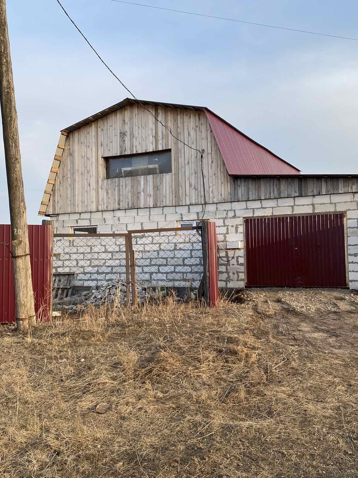 Дом в черновом варианте, на полу доска, лестницы на второй этаж нет, свет проведен. Есть второй этаж, два собственника. Гараж 4 на 12кв.м., есть вход из дома. В площадь дома по документам не входит. В доме есть большое подвальное помещение, зацементированное. В наличии пиломатериал, которого хватит на пол второго этажа, а также остается щебень и цемент!