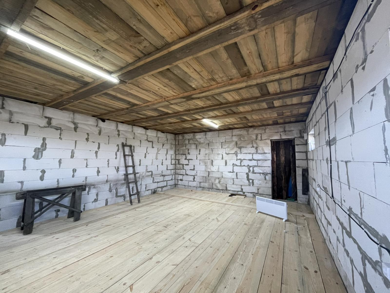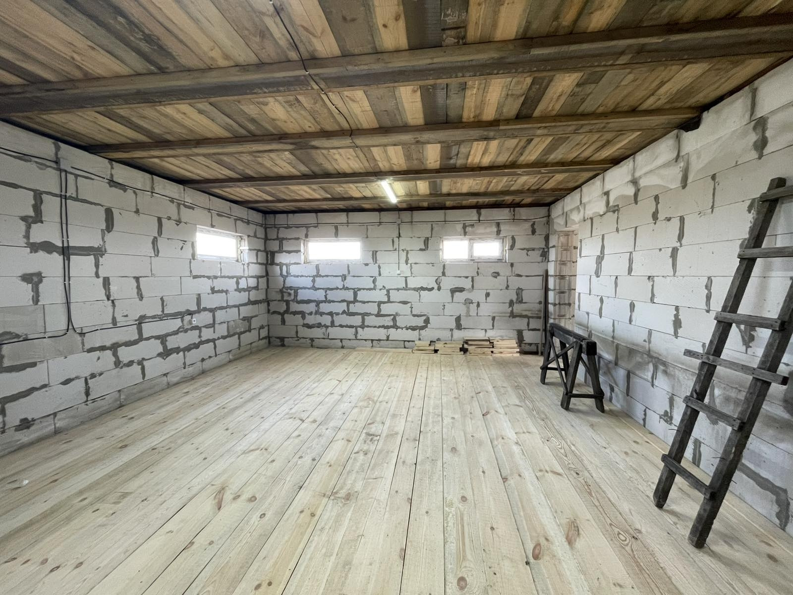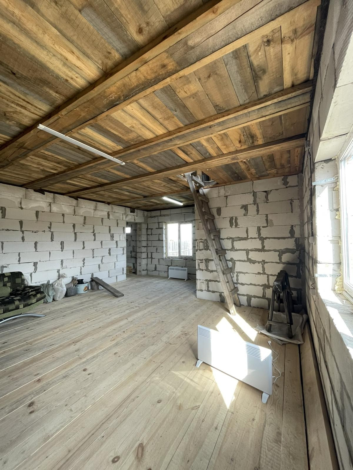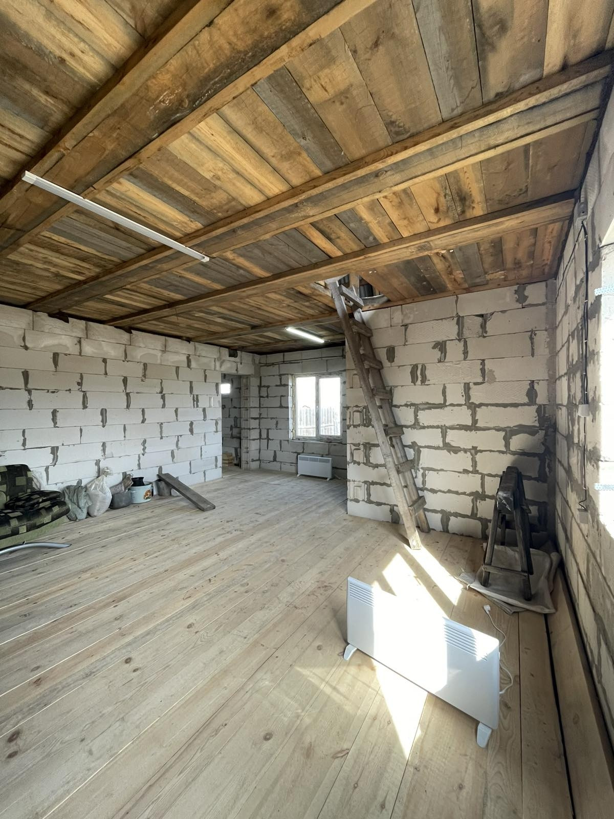 Дом в черновом варианте, на полу доска, лестницы на второй этаж нет, свет проведен. Есть второй этаж, два собственника. Гараж 4 на 12кв.м., есть вход из дома. В площадь дома по документам не входит. В доме есть большое подвальное помещение, зацементированное. В наличии пиломатериал, которого хватит на пол второго этажа, а также остается щебень и цемент!