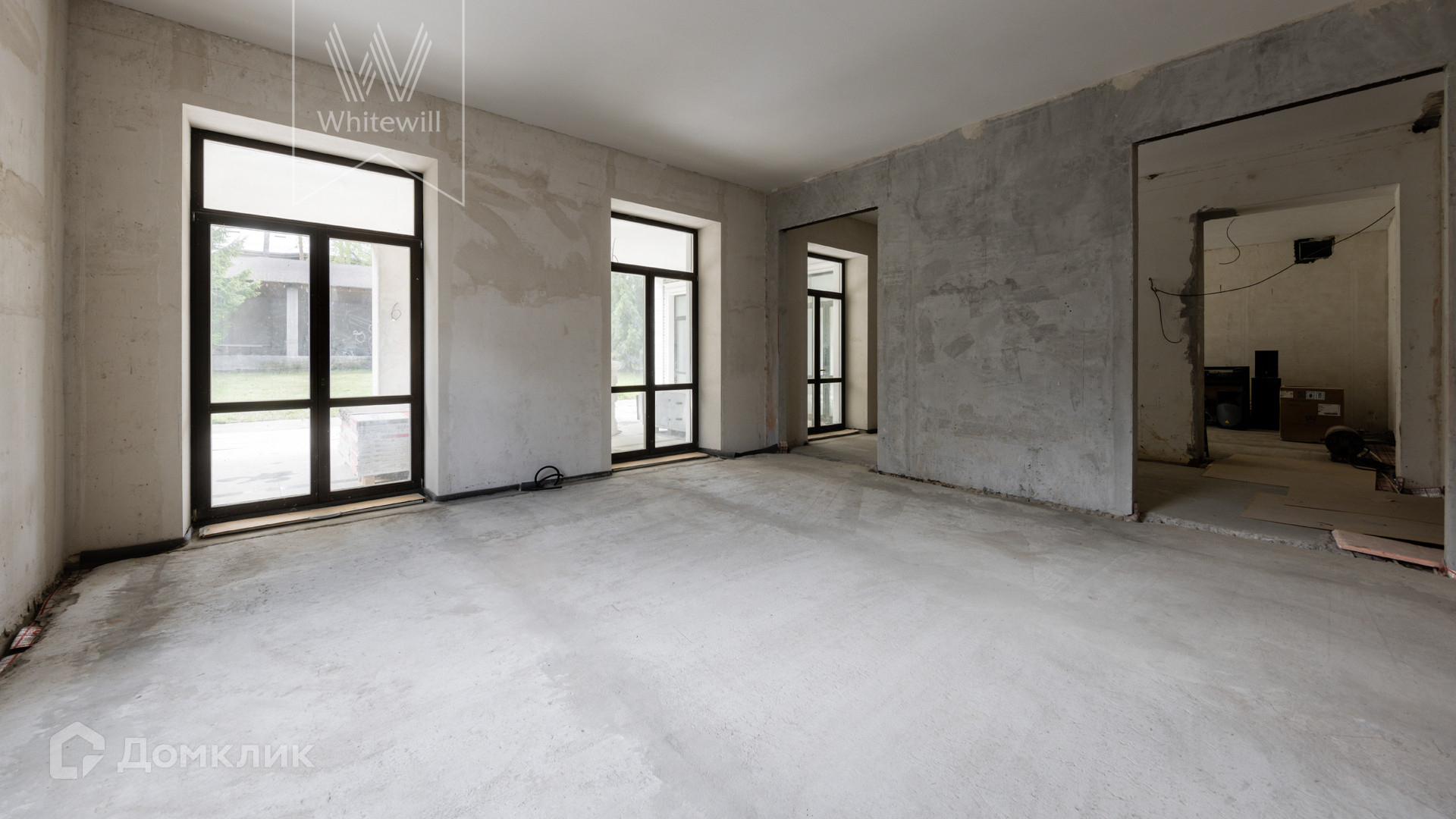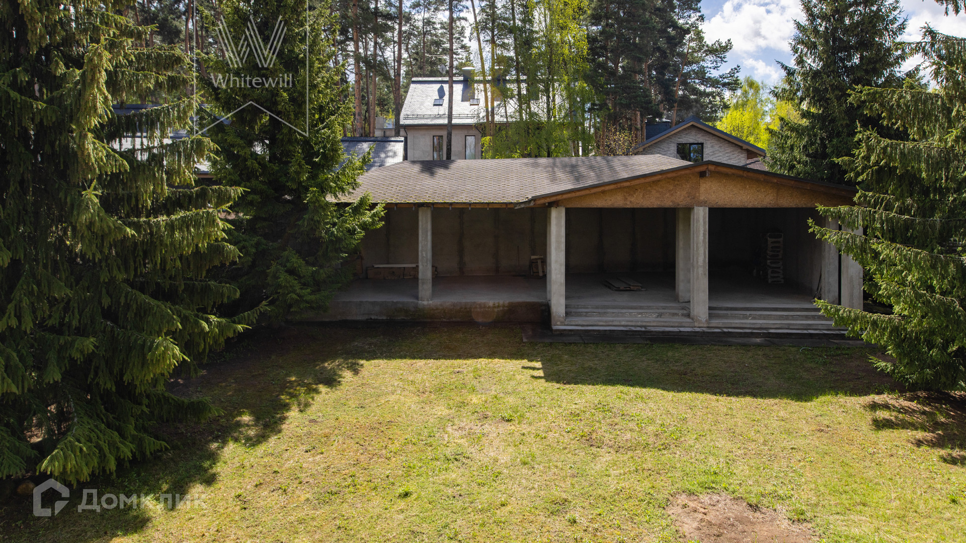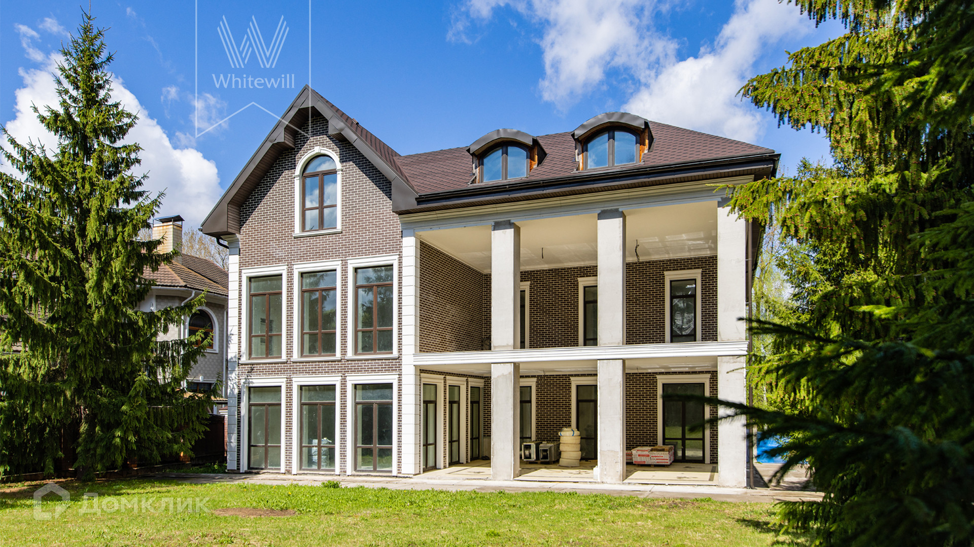 ID 11 360. Барвиха. Просторный загородный дом площадью 1300 м² построен на ровном полевом участке 15 соток без ландшафтного дизайна. Фасад в европейском стиле облицован коричневой клинкерной плиткой и натуральным камнем по цоколю, декорирован белыми наличниками и колоннами. В коттедже без отделки спланировали несколько спален, гостиную, кухню, кабинет, кинотеатр, спортзал, парилку и гараж. Укрыться от солнца и отдохнуть на свежем воздухе можно в тени террасы с видом на участок или в беседке.