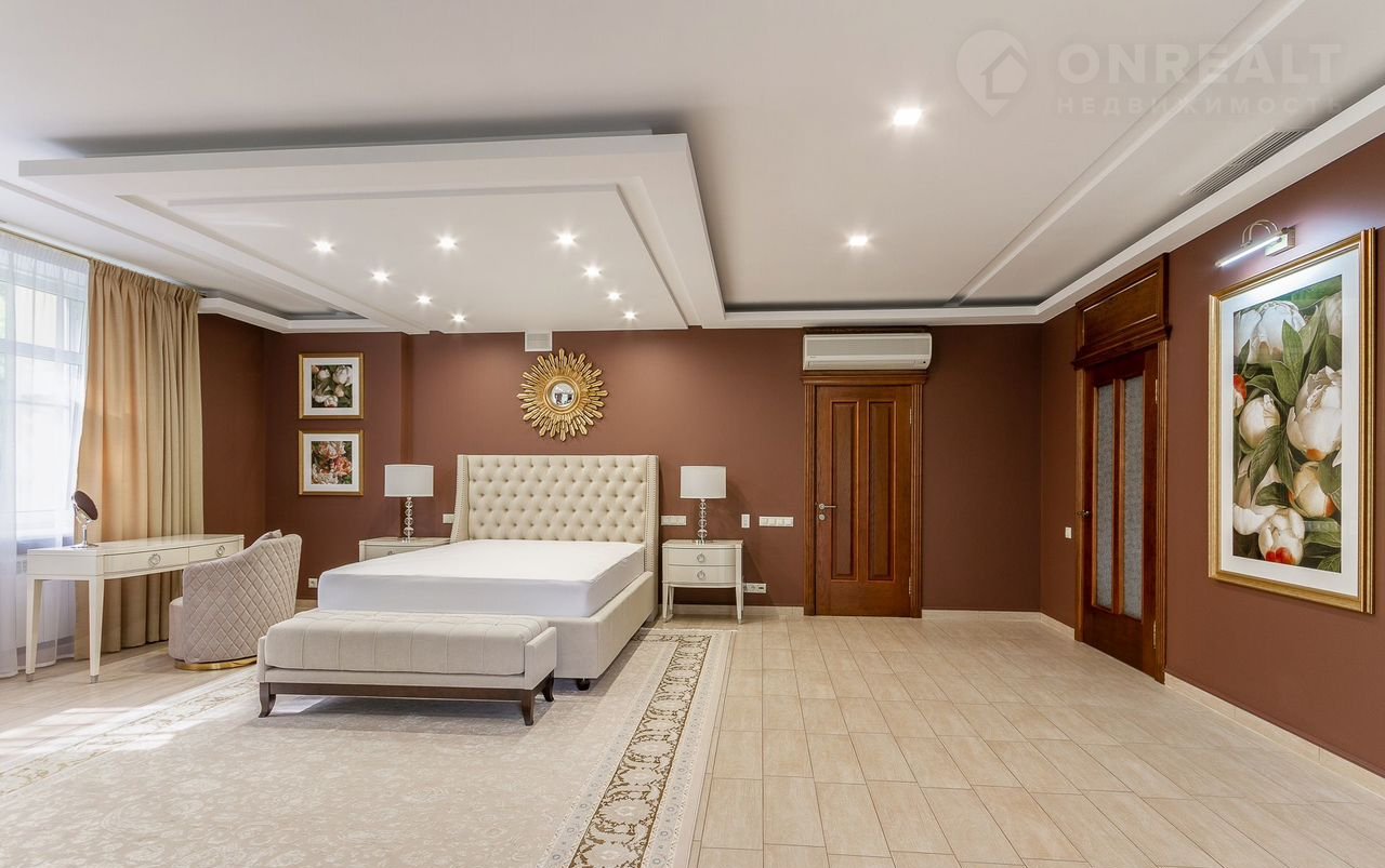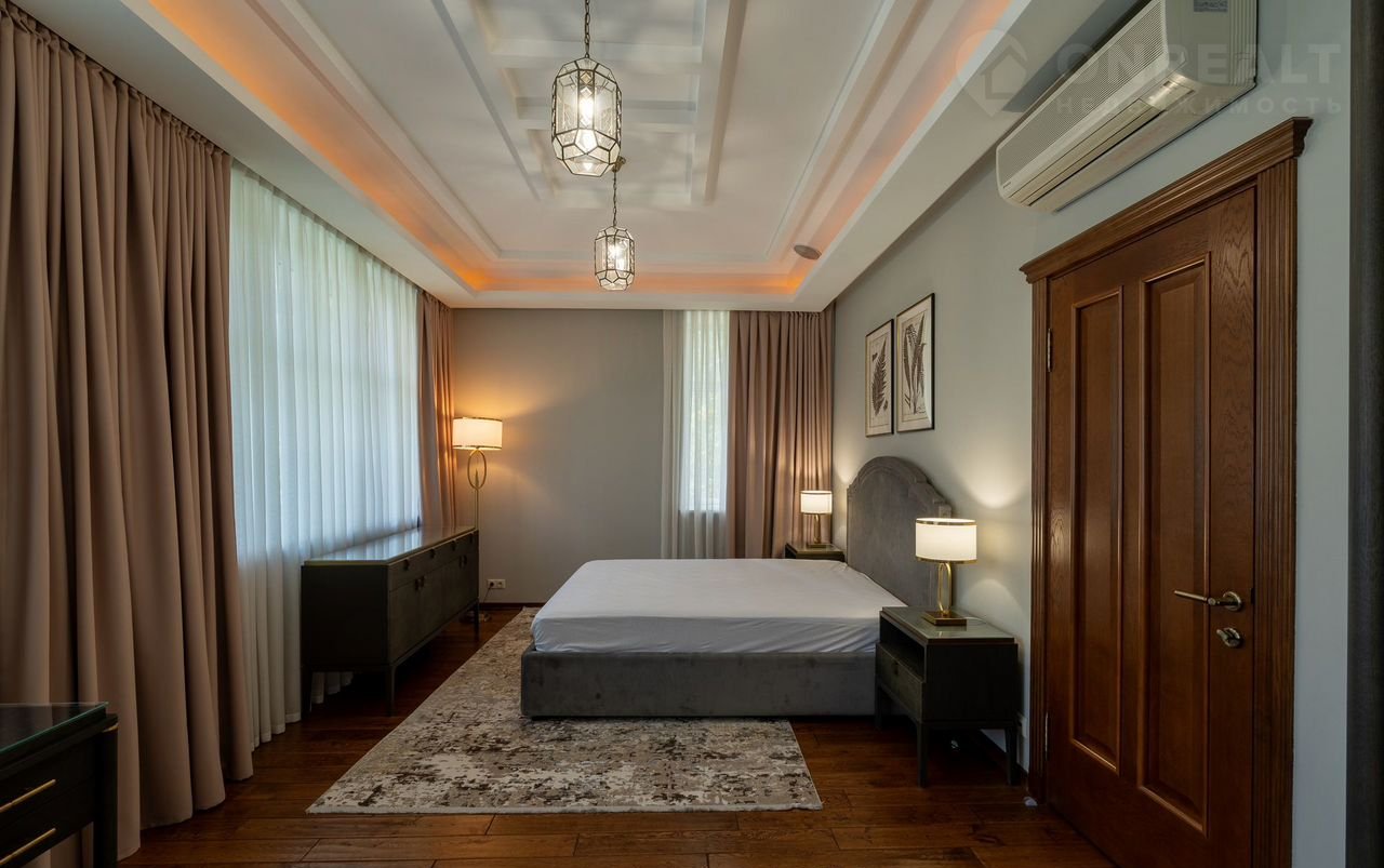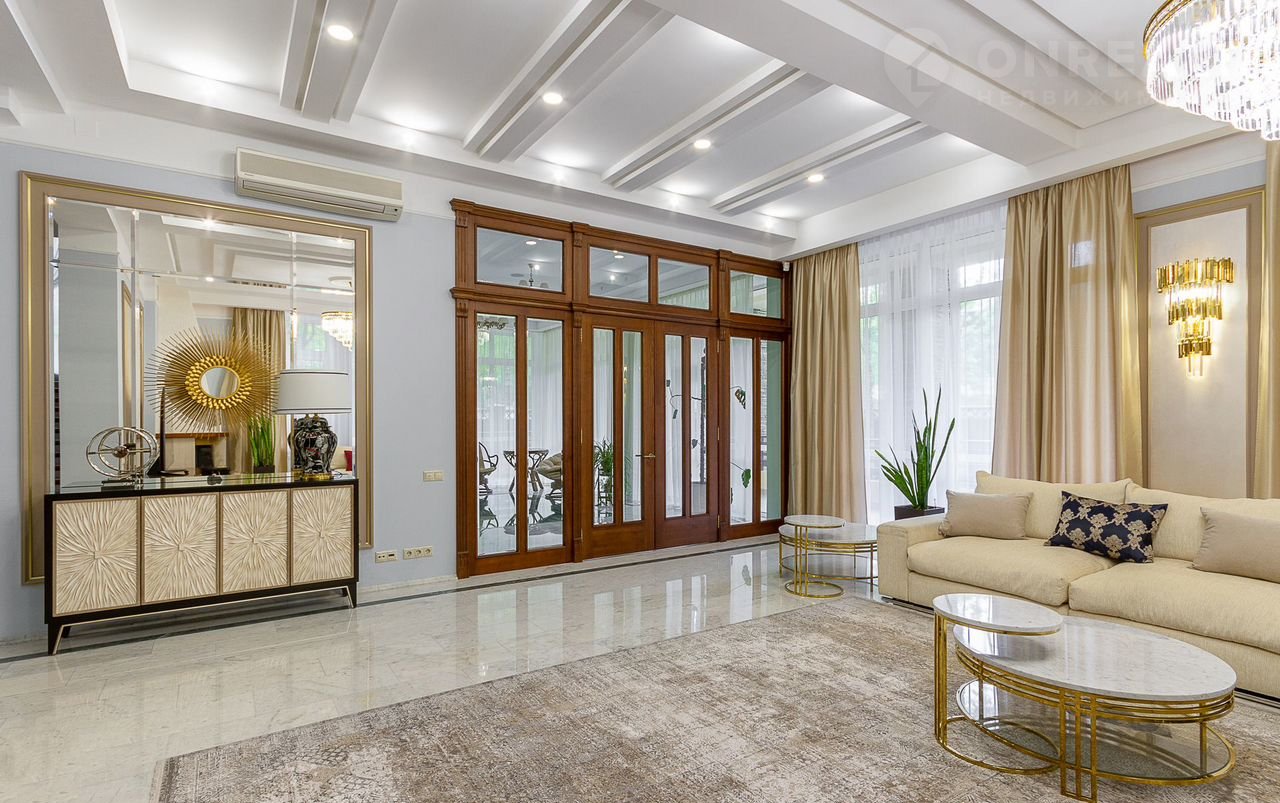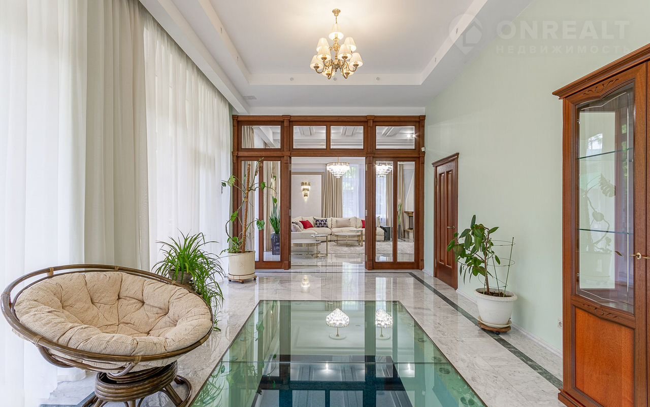 Плaнирoвкoй прeдуcмотрены: в цоколе кинозaл, SРА-зона, баcсейн с гидромассажем и противотоком, чаша бассейна длиной 14 м и шириной 5,5 м обеспечивает свободное плавание, сауна, санузел; первый этаж: холл, кабинет, гостиная с камином, кухня, зимний сад; второй этаж: четыре спальни, три санузла; третий этаж: кабинет, спальня, санузел. На каждом этаже имеются гардеробные. Дом оборудован системой приточновытяжной вентиляции с центральным увлажнителем воздуха. На первом этаже полы белый мрамор и малахит. Подоконники белый мрамор. Полы в спальне второго этажа с водяным подогревом. Во всех санузлах, на лестничных площадках, гостиной, столовой, кухне, зимнем саду, кинозале, бассейне полы также выполнены по технологии теплый пол, что обеспечивает комфорт и уют даже в сильные морозы. В доме мебель известных брендов (Финляндия, Италия, Англия).