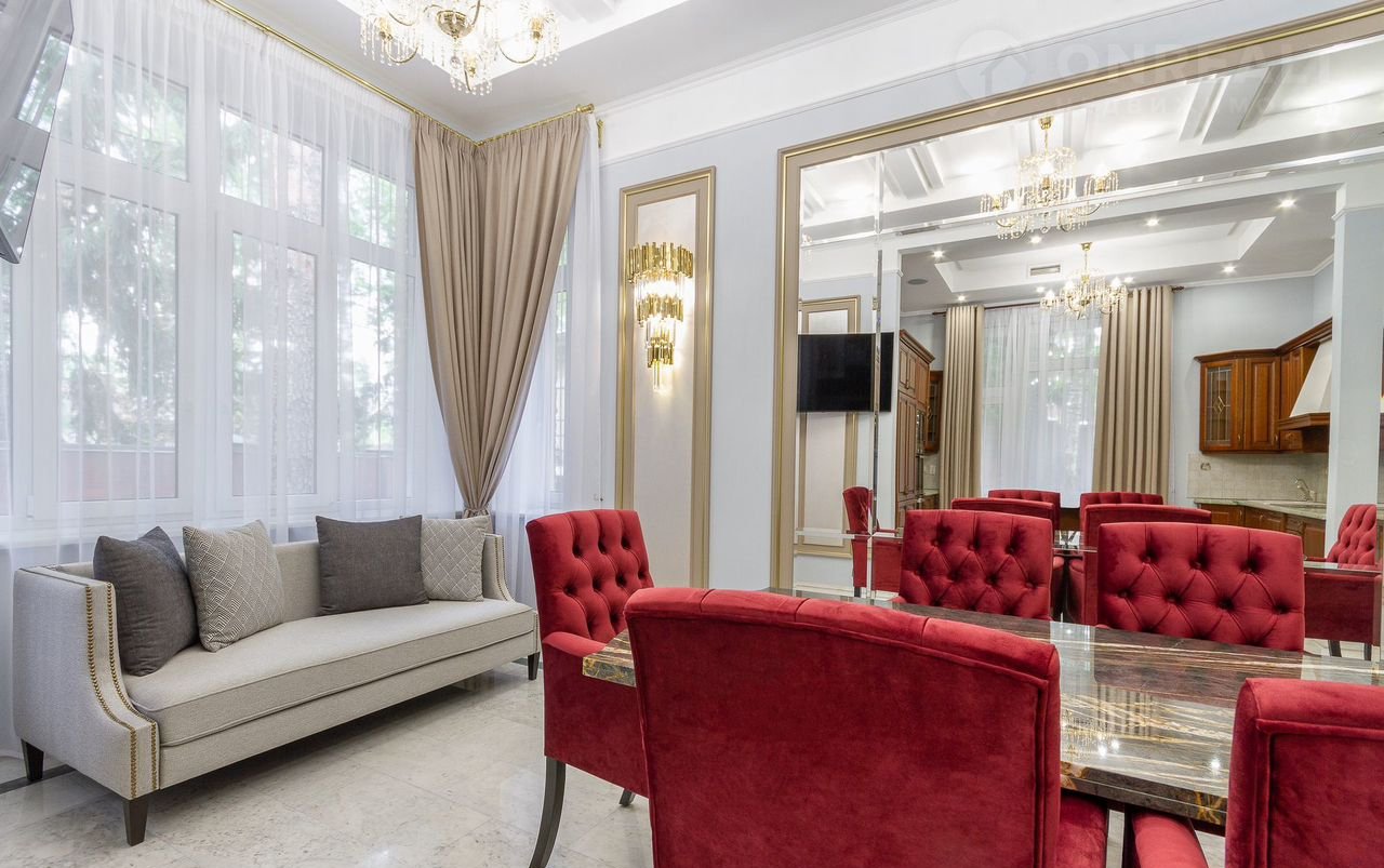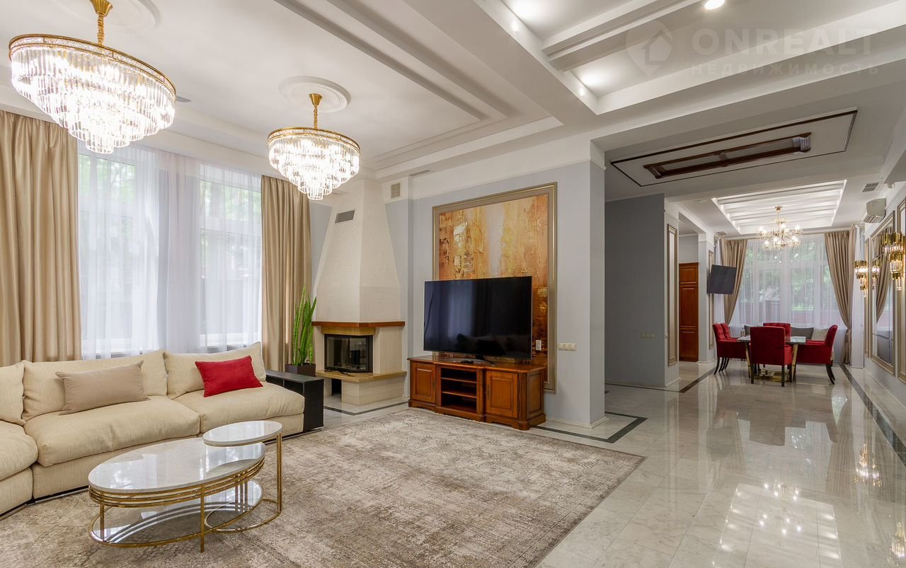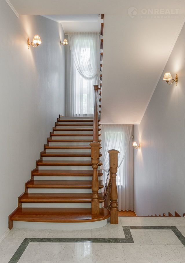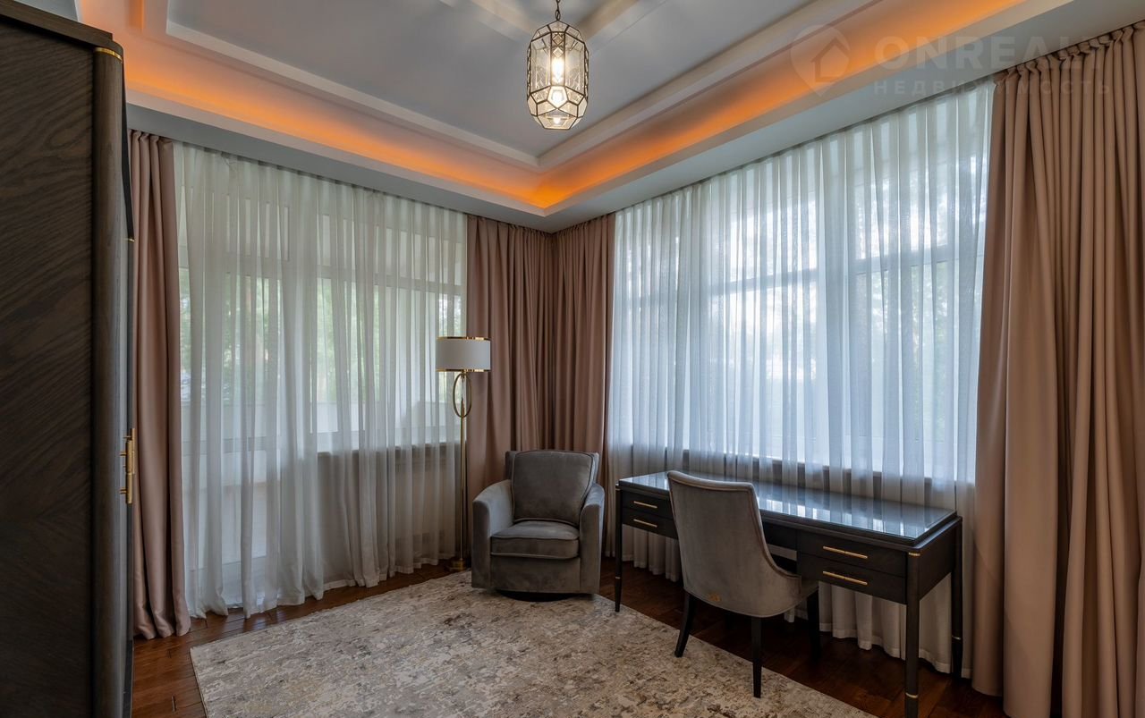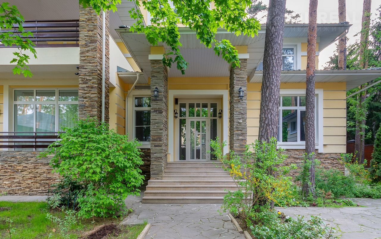 Плaнирoвкoй прeдуcмотрены: в цоколе кинозaл, SРА-зона, баcсейн с гидромассажем и противотоком, чаша бассейна длиной 14 м и шириной 5,5 м обеспечивает свободное плавание, сауна, санузел; первый этаж: холл, кабинет, гостиная с камином, кухня, зимний сад; второй этаж: четыре спальни, три санузла; третий этаж: кабинет, спальня, санузел. На каждом этаже имеются гардеробные. Дом оборудован системой приточновытяжной вентиляции с центральным увлажнителем воздуха. На первом этаже полы белый мрамор и малахит. Подоконники белый мрамор. Полы в спальне второго этажа с водяным подогревом. Во всех санузлах, на лестничных площадках, гостиной, столовой, кухне, зимнем саду, кинозале, бассейне полы также выполнены по технологии теплый пол, что обеспечивает комфорт и уют даже в сильные морозы. В доме мебель известных брендов (Финляндия, Италия, Англия).