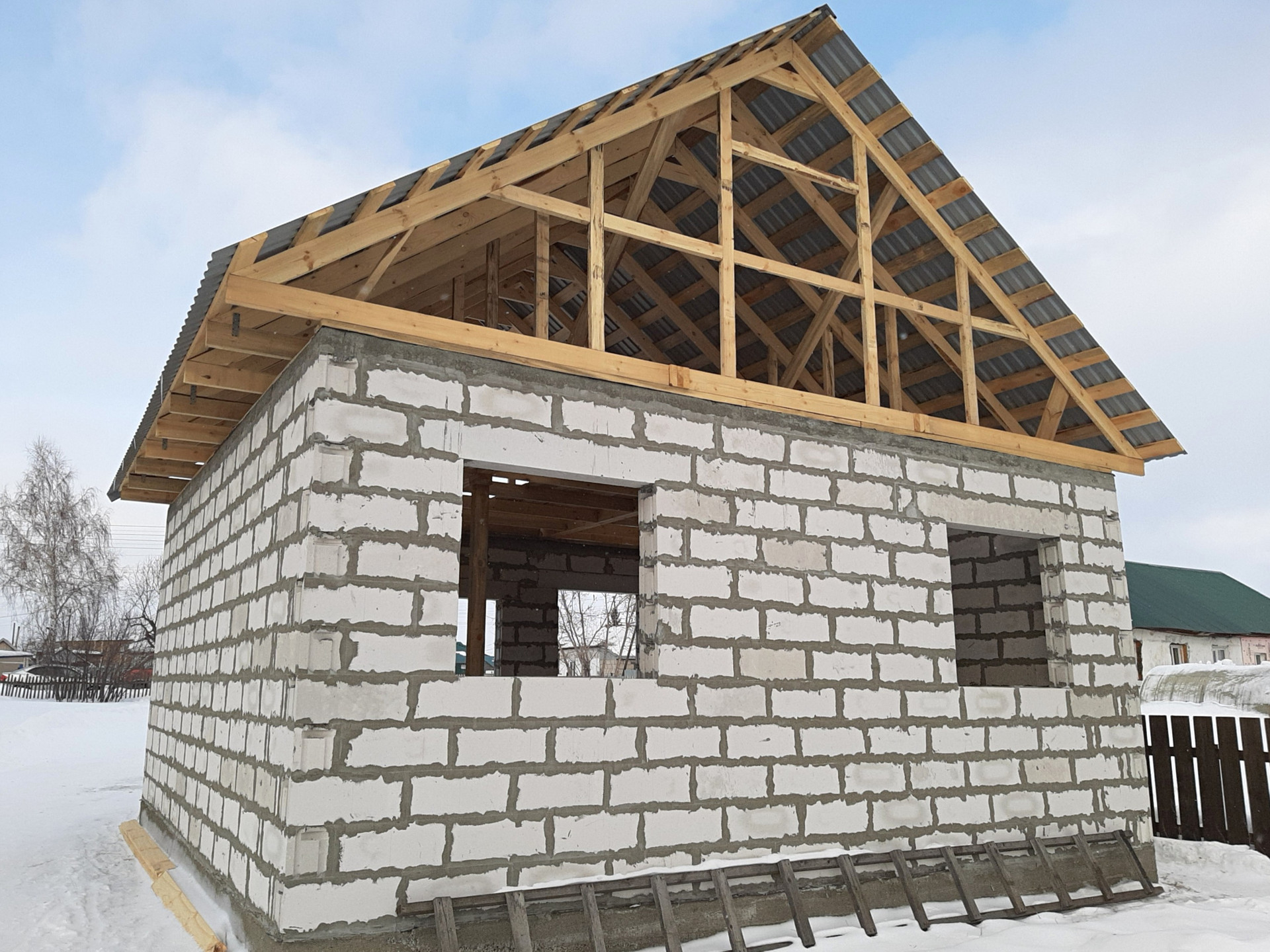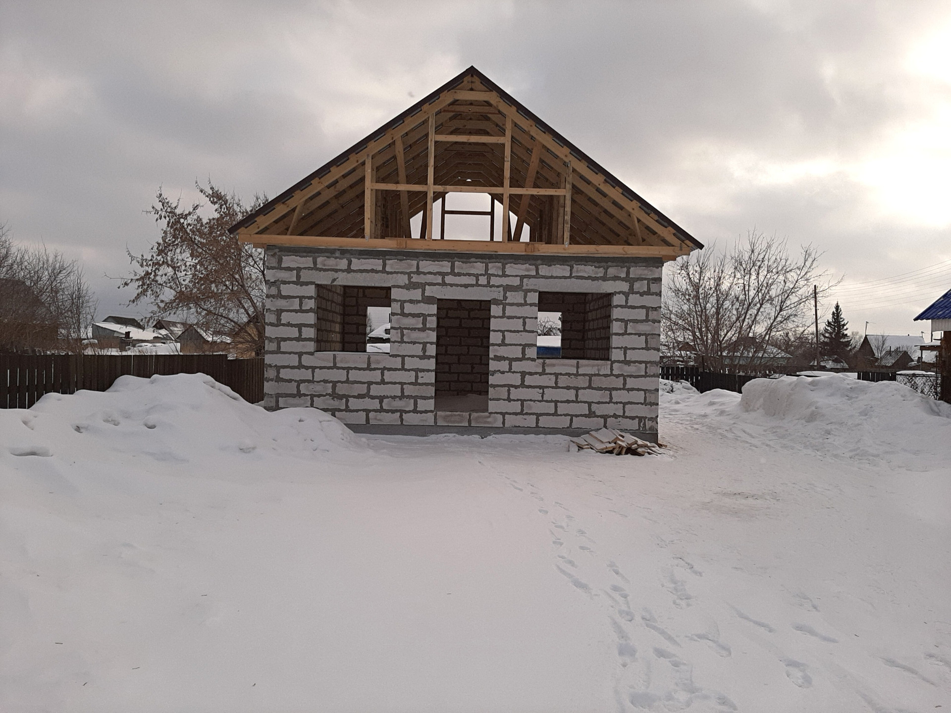 Продам участок с недостроенным домом центральная улица, дорога асфальтированная от магазина, газ, центральная вода в 10 метрах, электричество подведено, стены сибит, крыша профиль 0,45мм шоколад, свободная планировка.