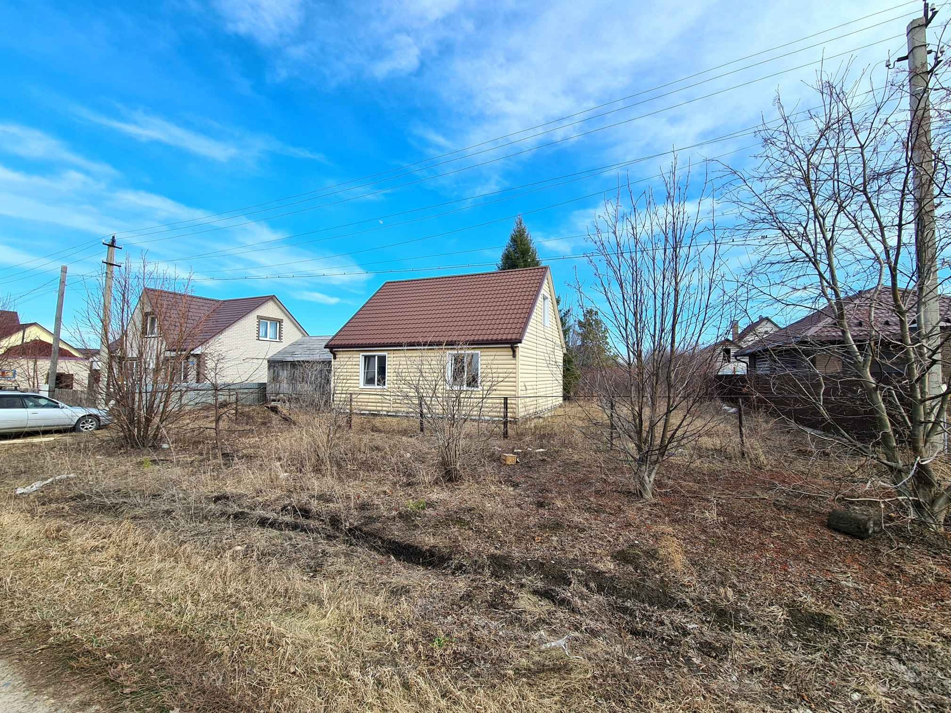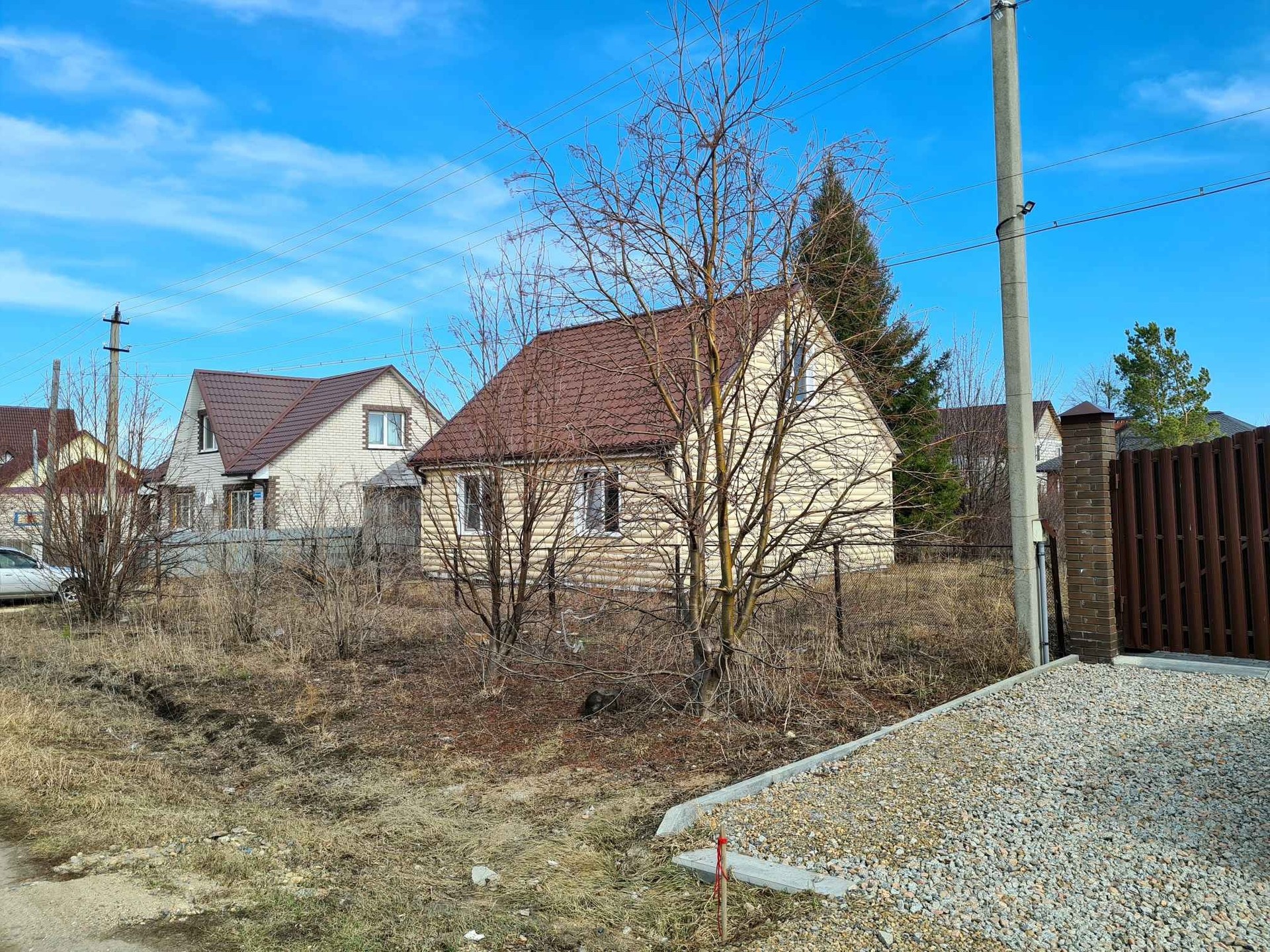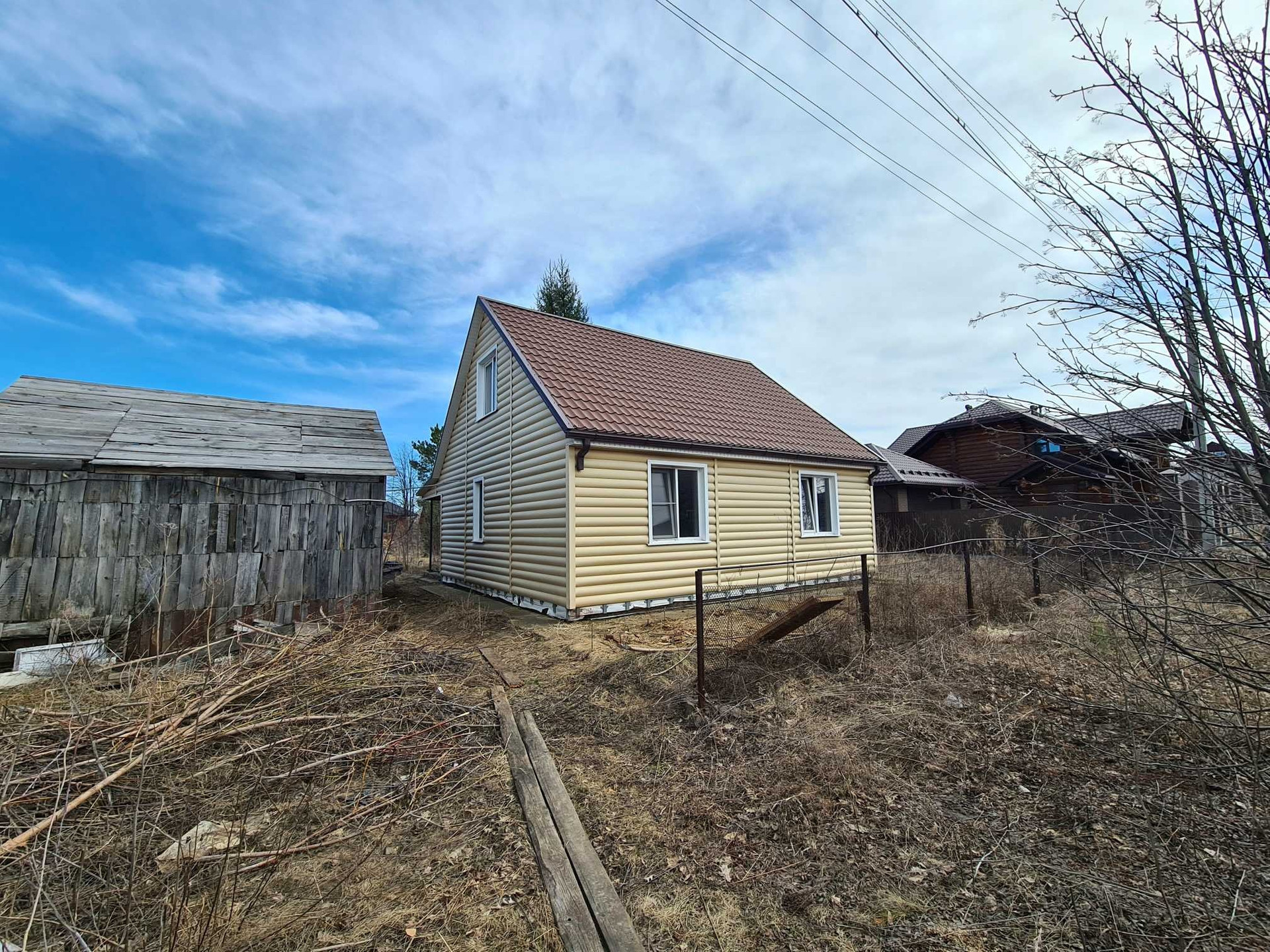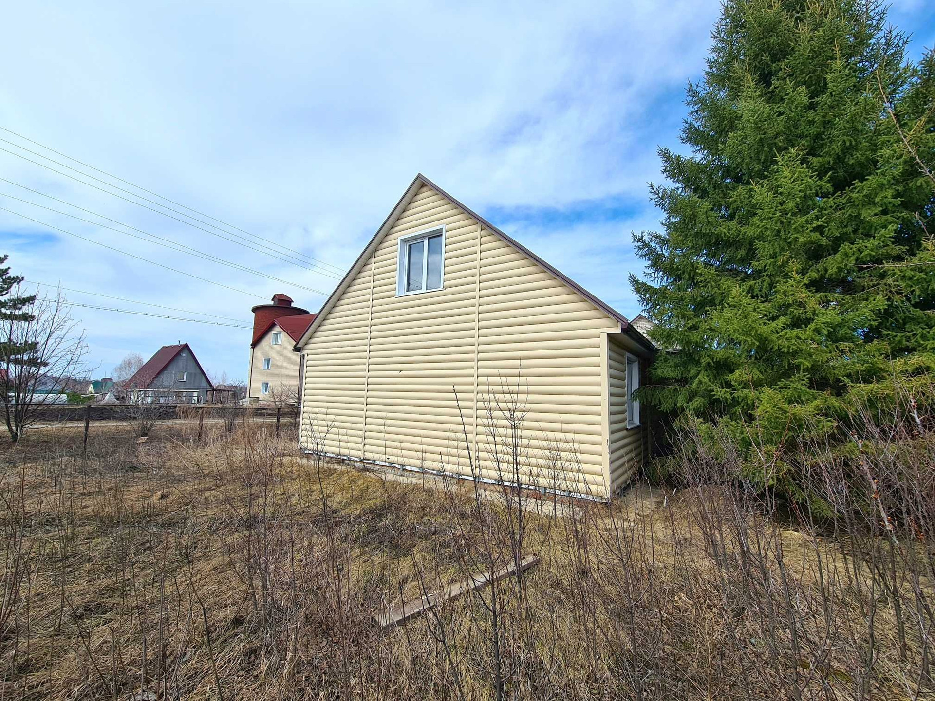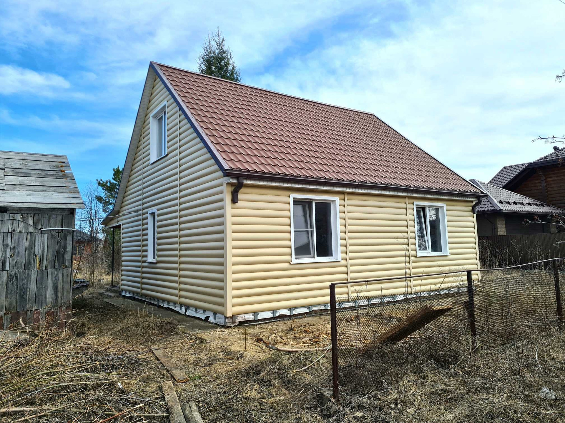 Дом в посёлке Радужном,каркасный из дерева, утепление пенопласт 100 мм, минвата 50 мм, фундамент бетонный ленточный, обшит сайдингом, крыша металлочерепица, ГАЗ возле участка, подключение к магистрали платное (56000 ₽).