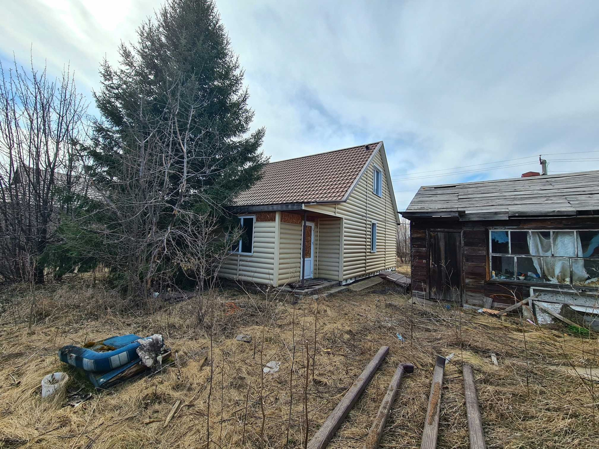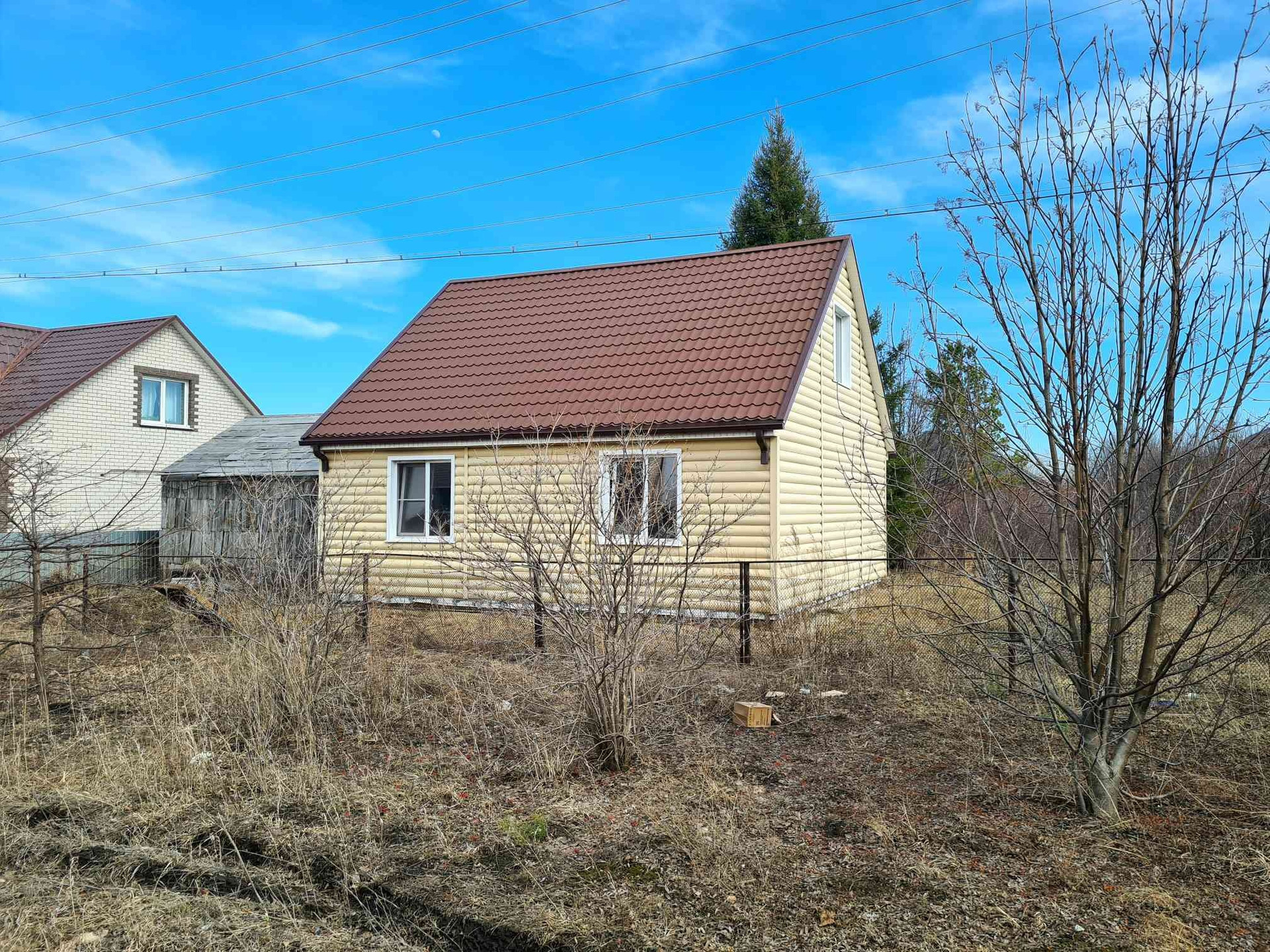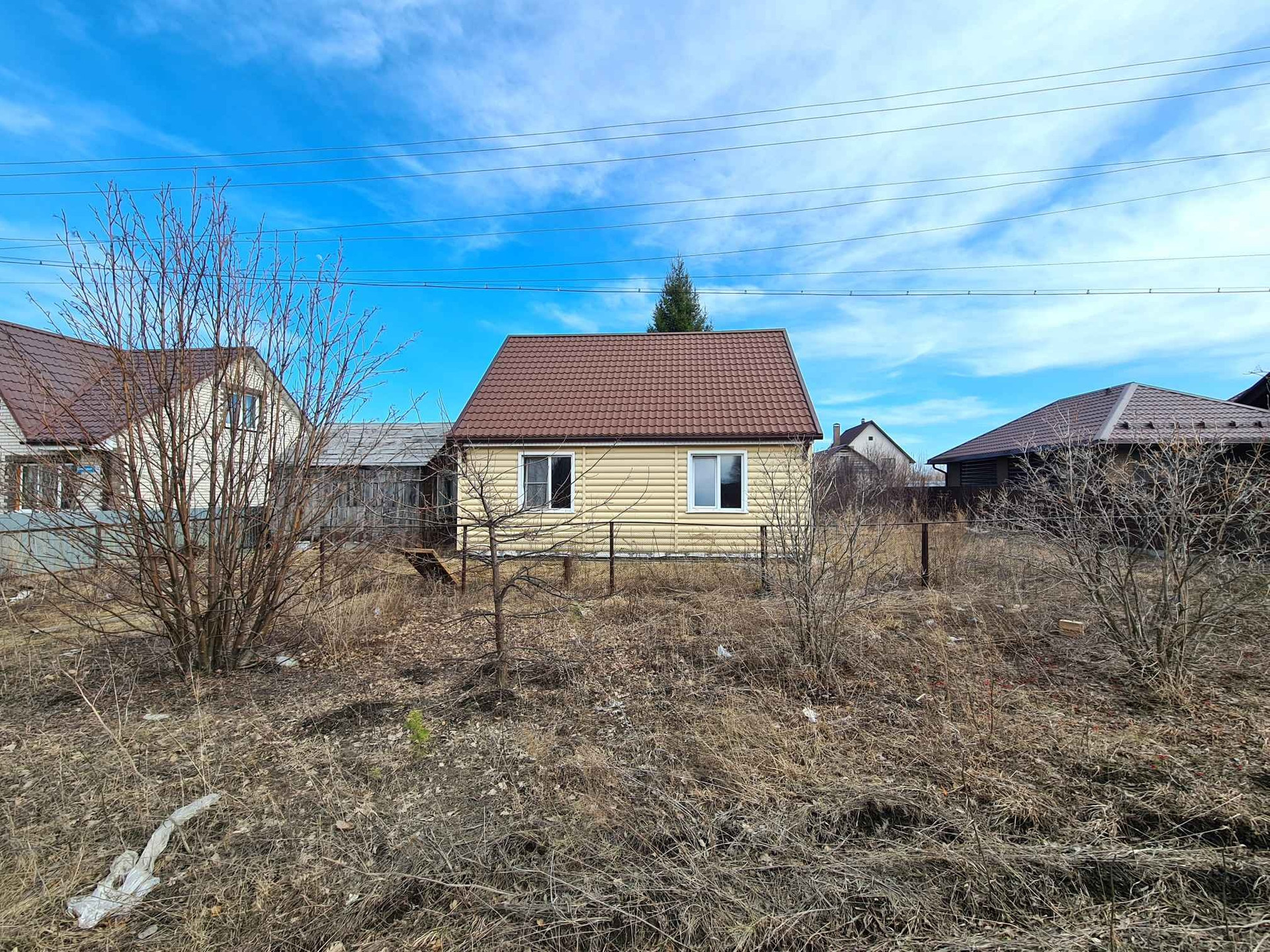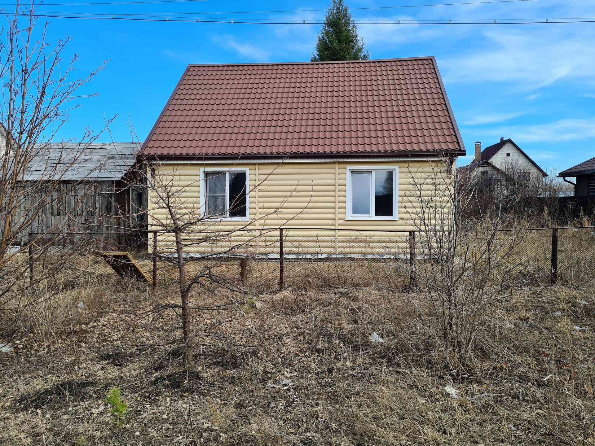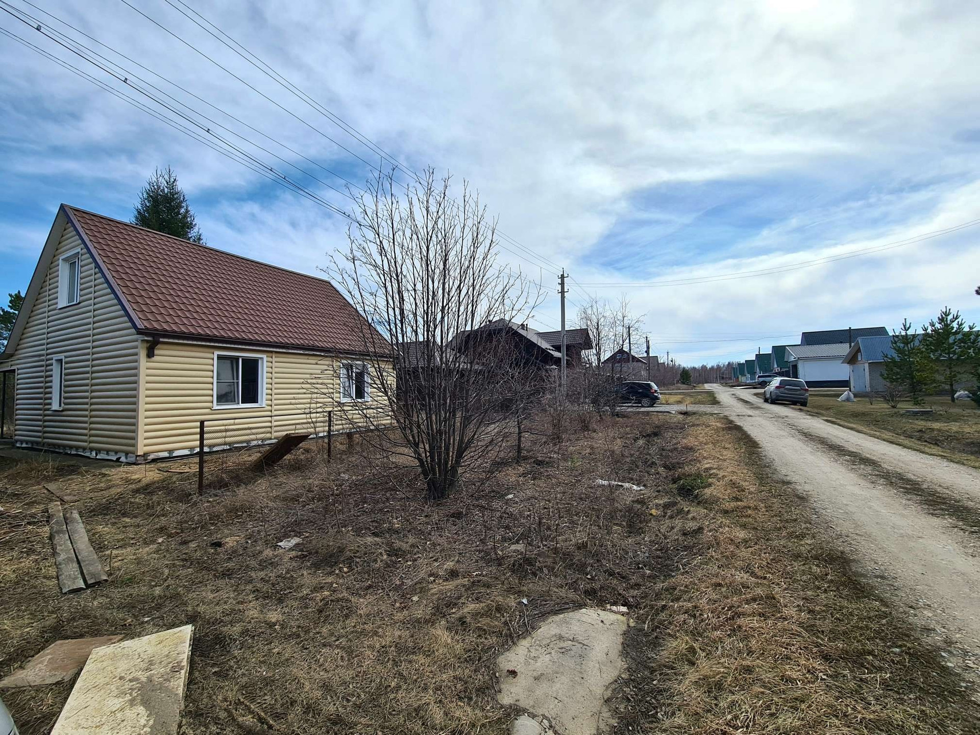 Дом в посёлке Радужном,каркасный из дерева, утепление пенопласт 100 мм, минвата 50 мм, фундамент бетонный ленточный, обшит сайдингом, крыша металлочерепица, ГАЗ возле участка, подключение к магистрали платное (56000 ₽).