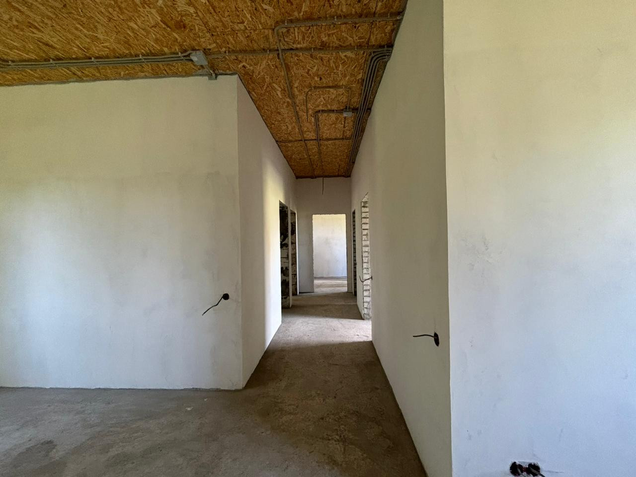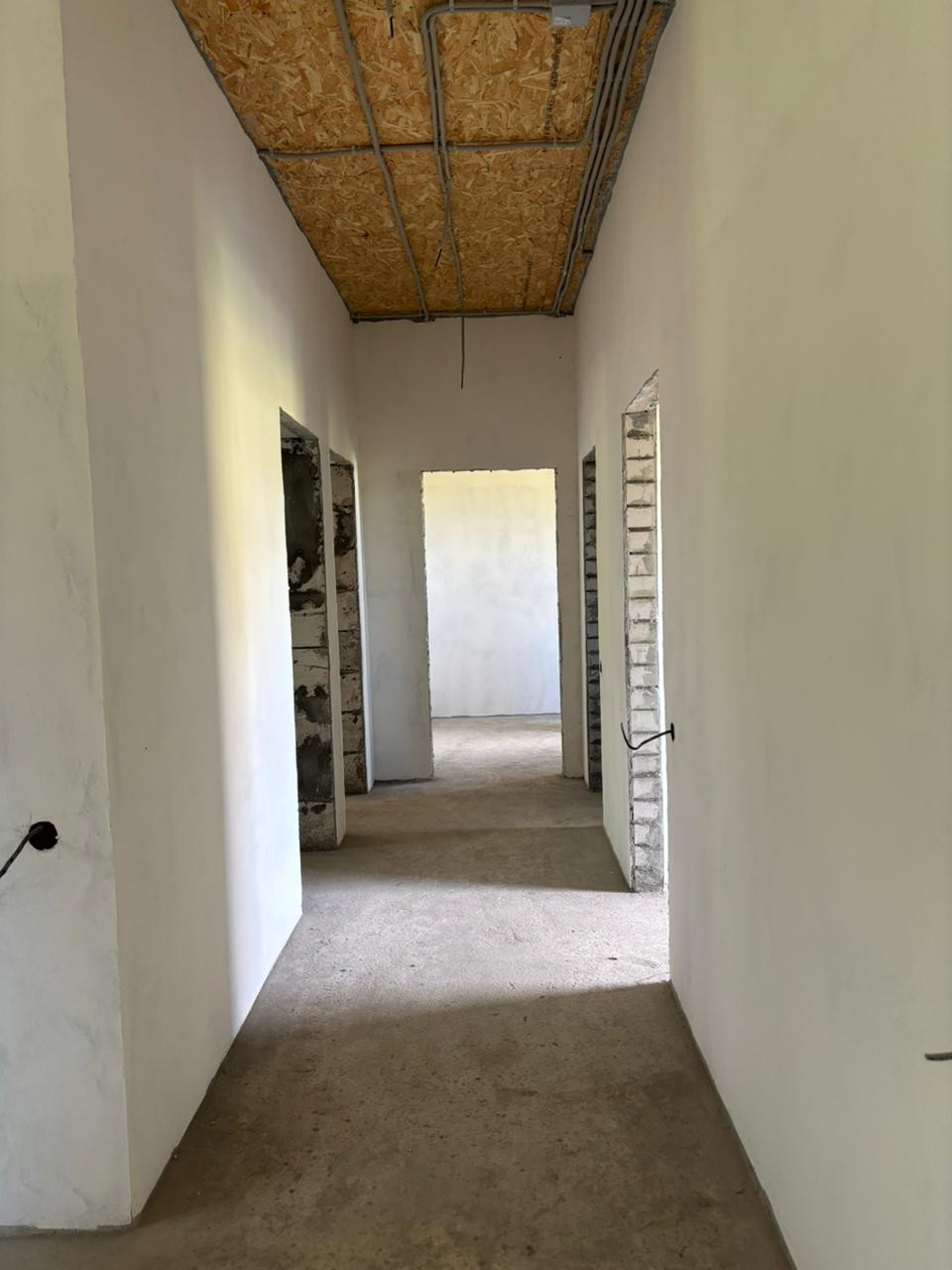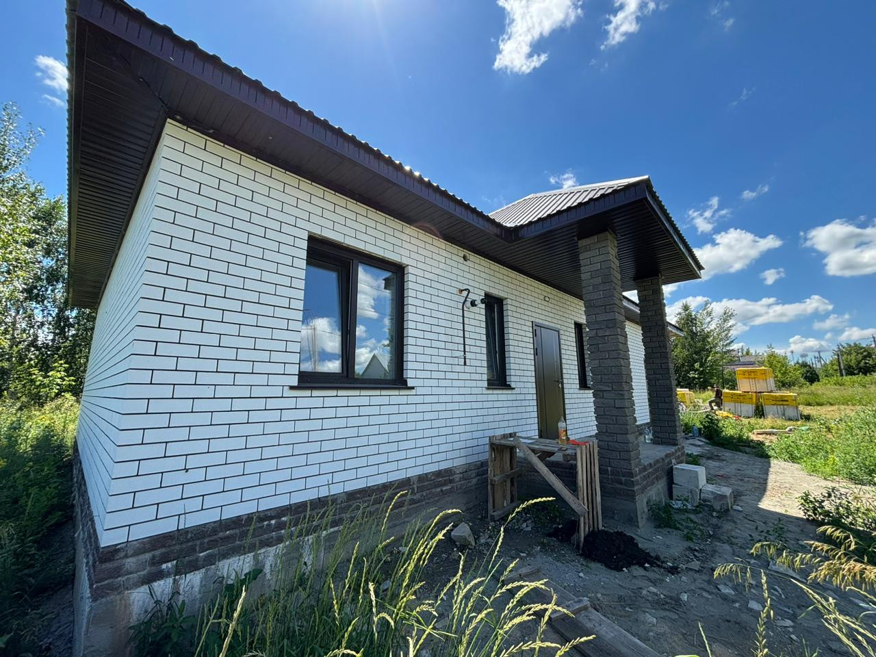 Материалы стен газоблок, утеплитель, облицовка кирпичем. Предчистовая отделка стен, разводка электричества внутри дома, газ, местная канализация.