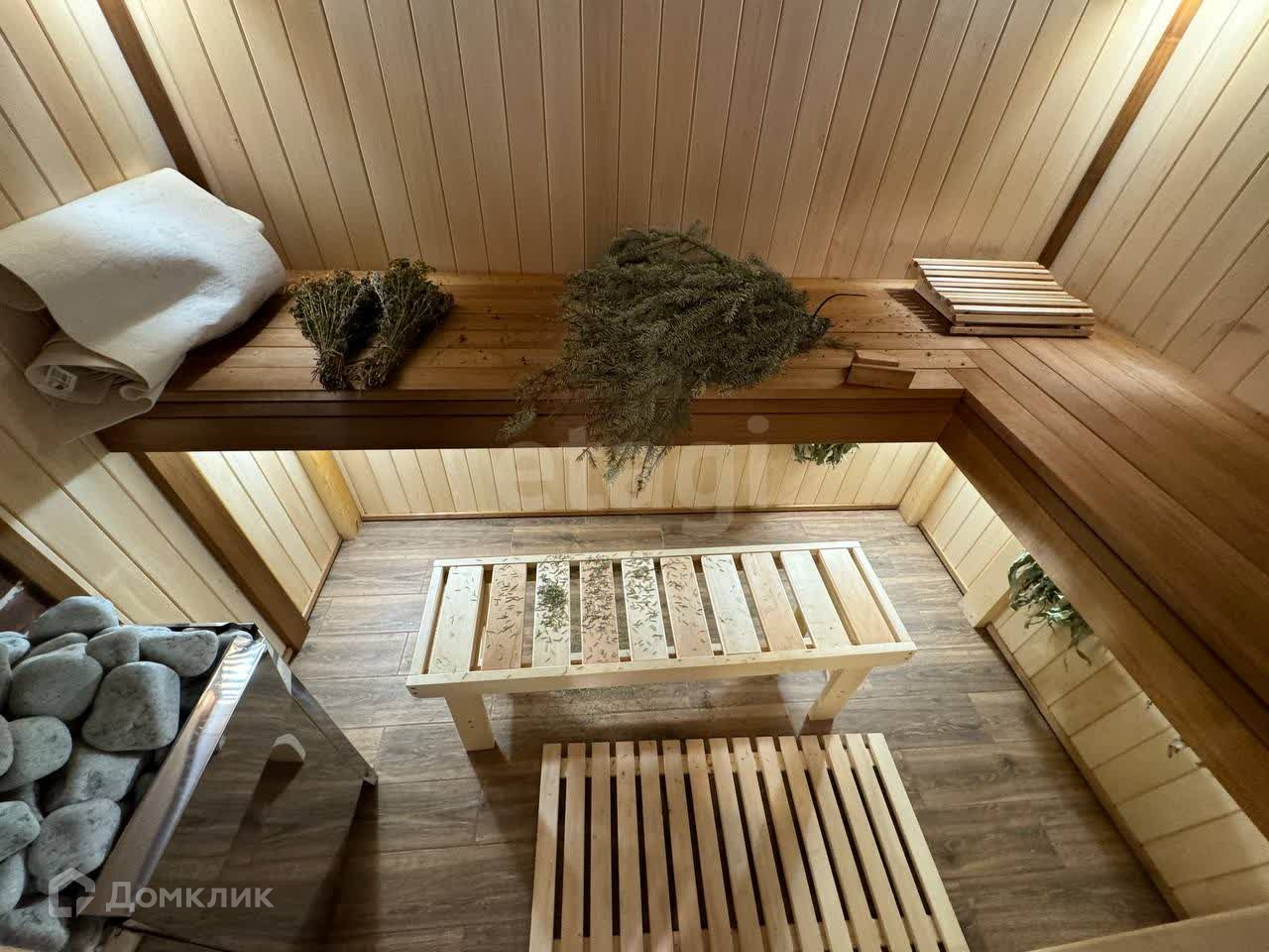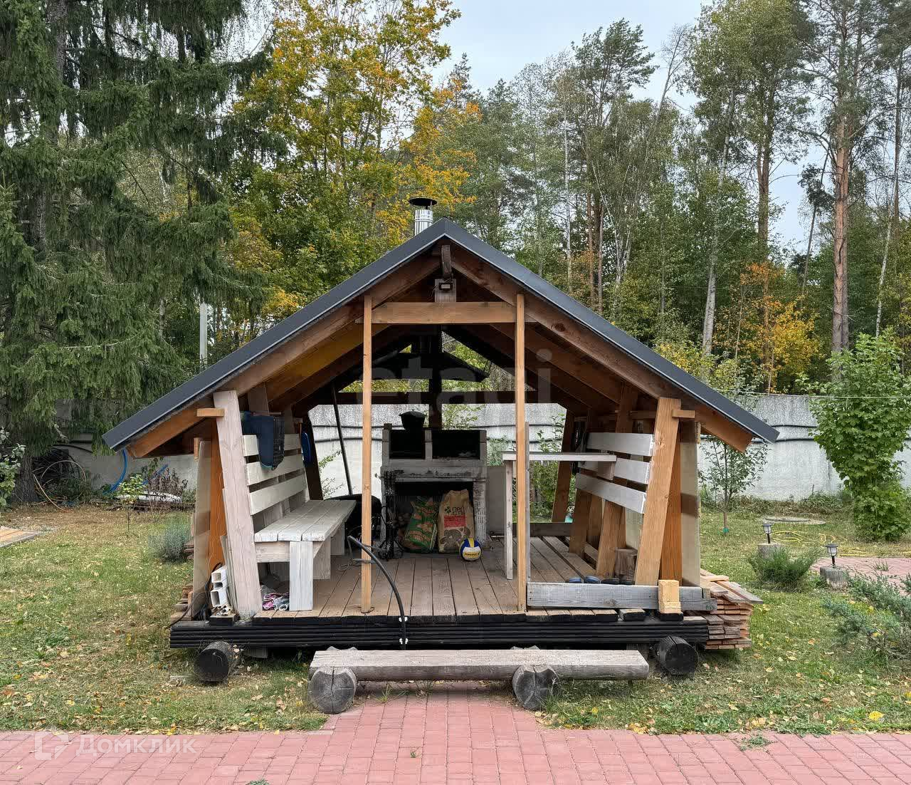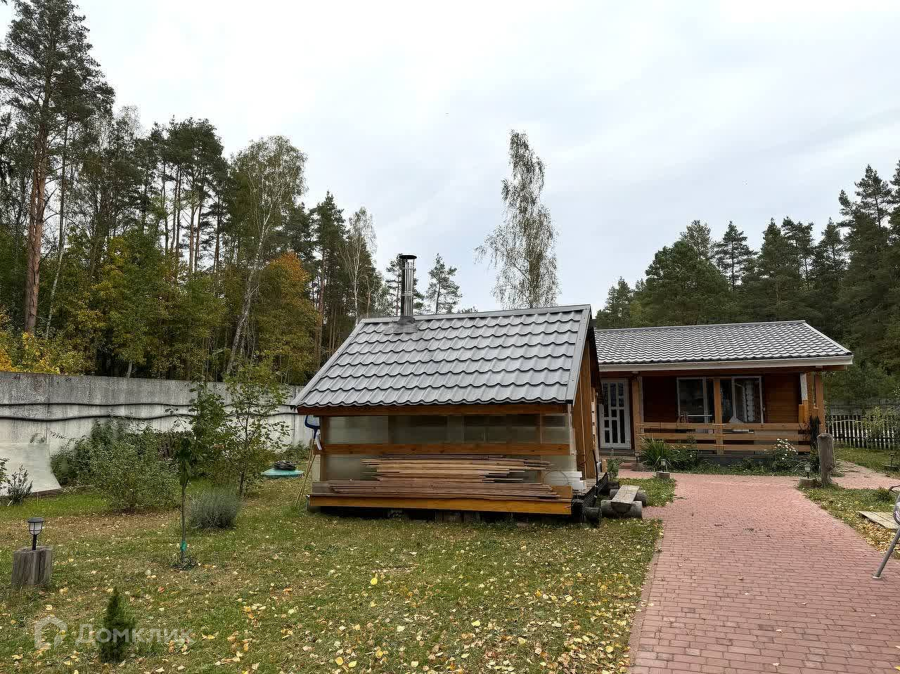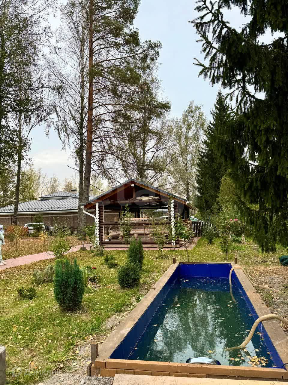На участке 12 соток расположился дом 92 м.кв., гостевой дом с баней и сауной, беседка с мангальной зоной, бассейн, навес для машин.
