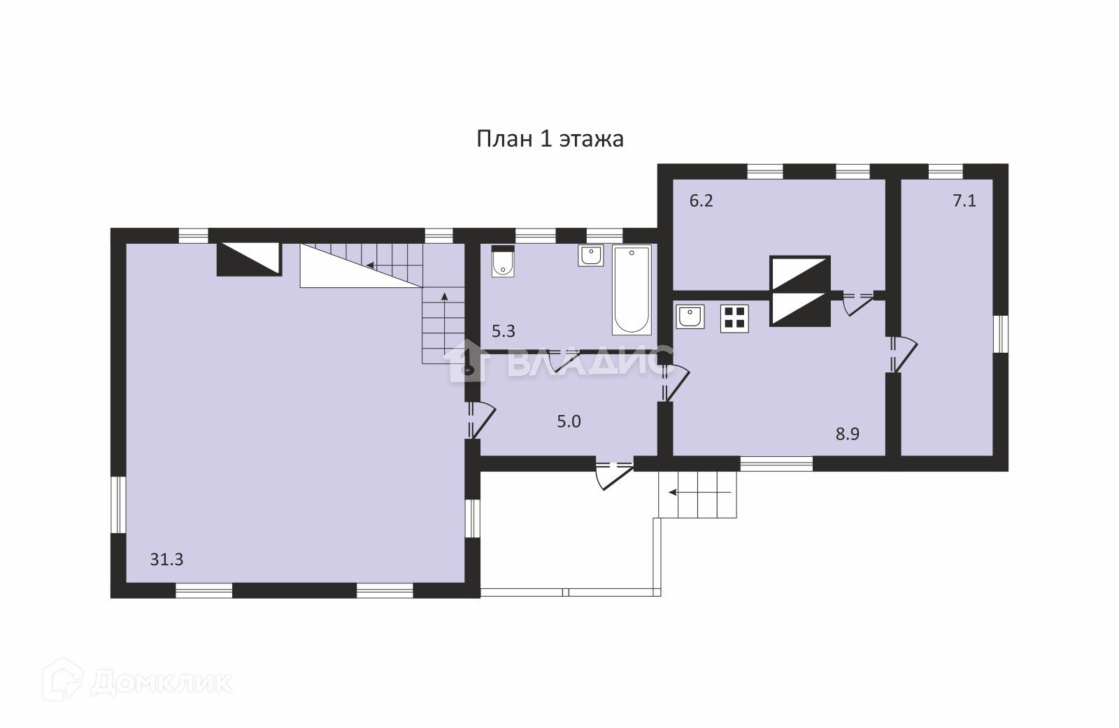 Первый этаж – Просторная гостиная 31.3 кв.м. , Кухня 8.9 кв.м. , Комнаты 6.2 и 7.1 кв.м.