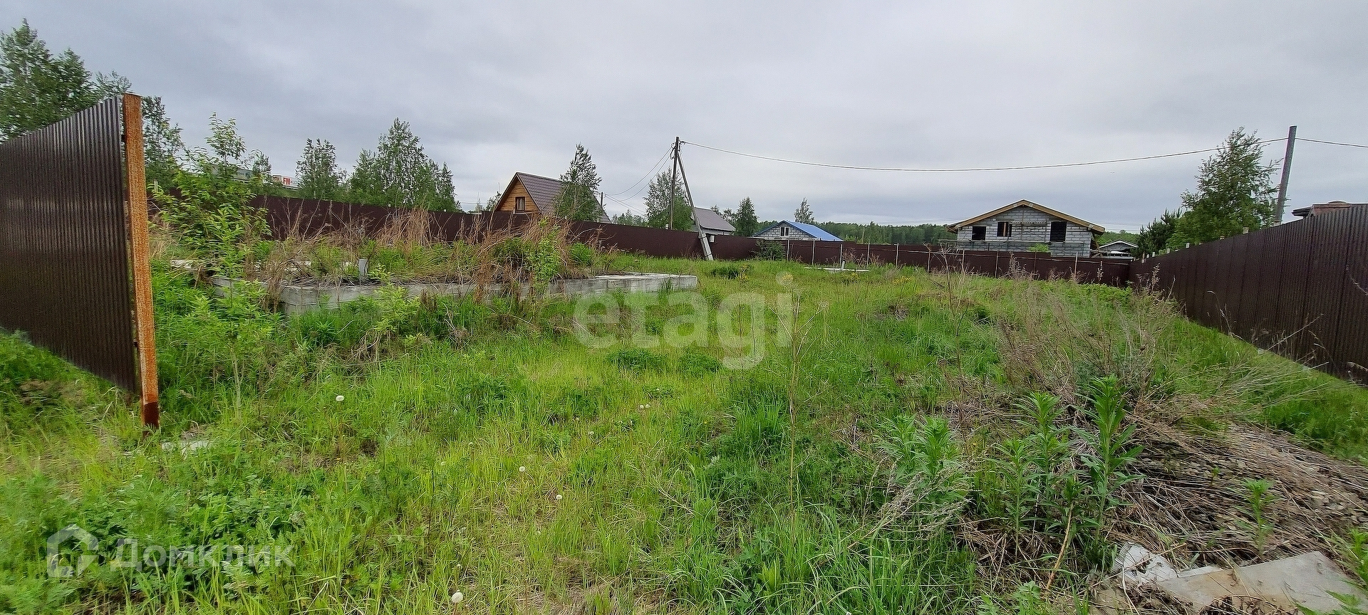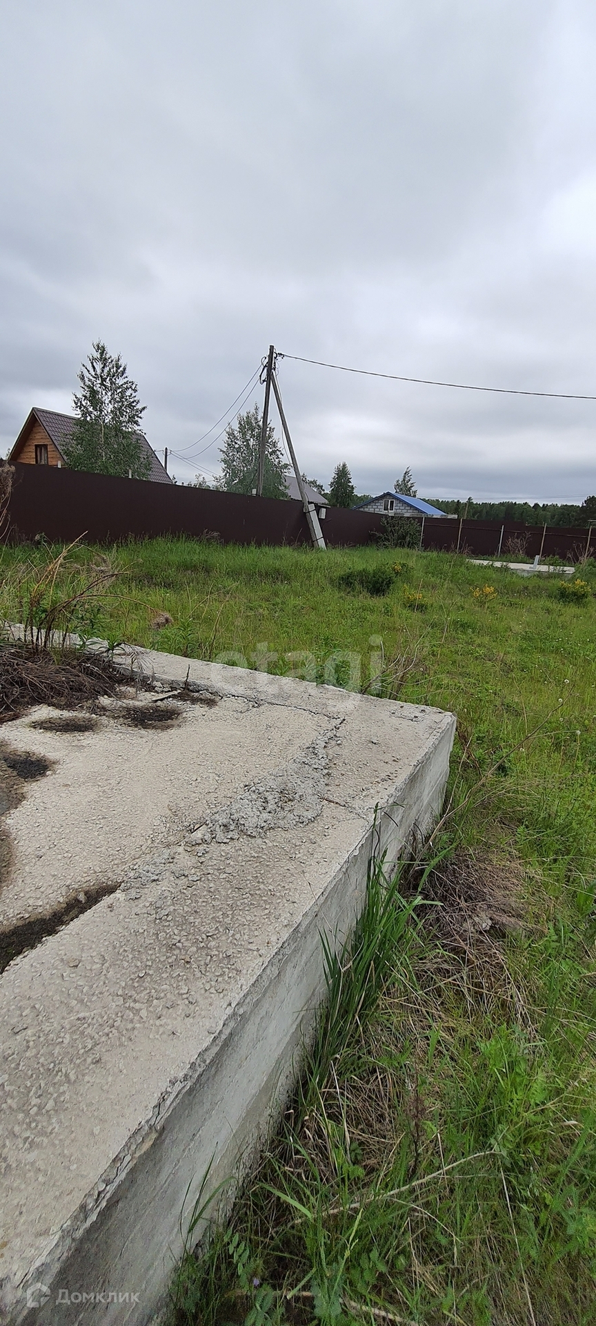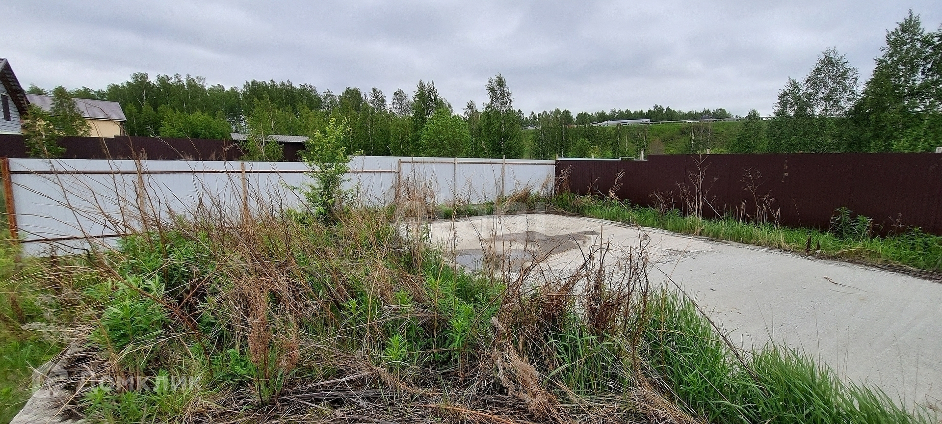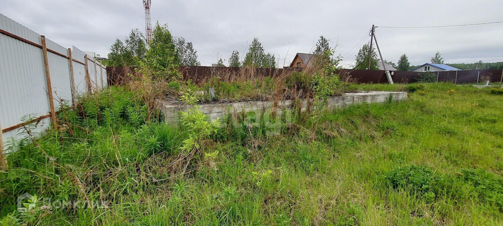 Площадь участка 8,4 сотки. На участке залито два фундамента 6х6 и 10х10 сделан забор и электричество. Поселок застроен, вокруг соседи живут круглый год.