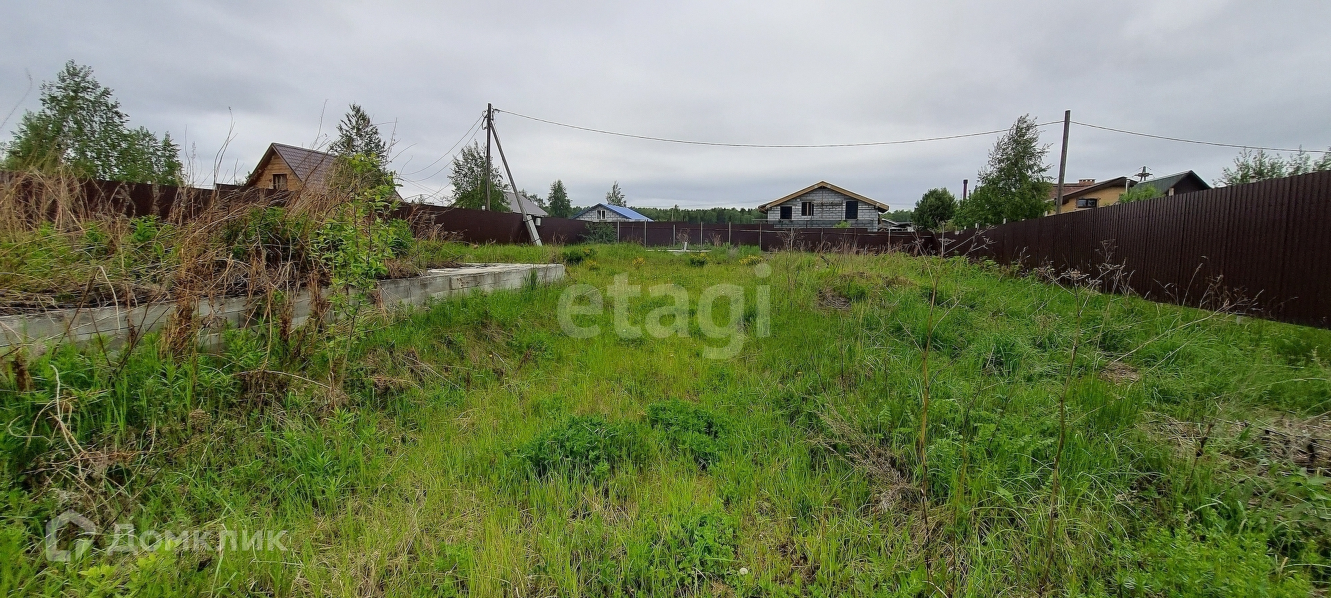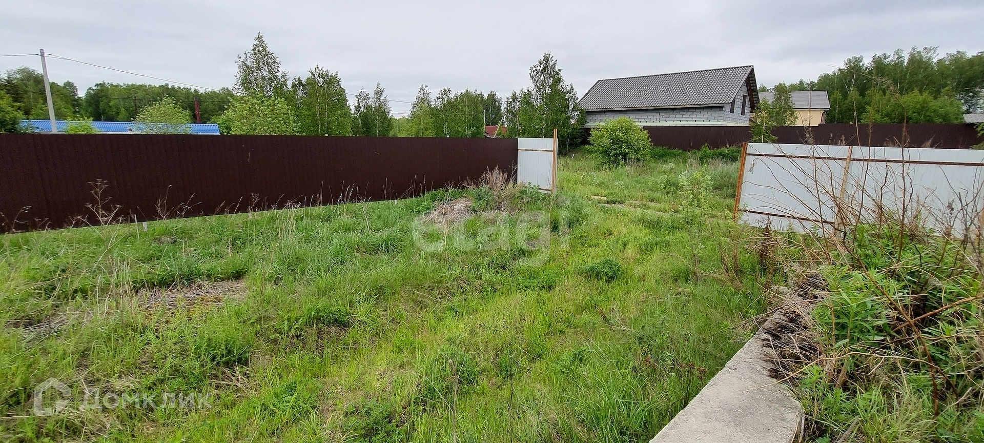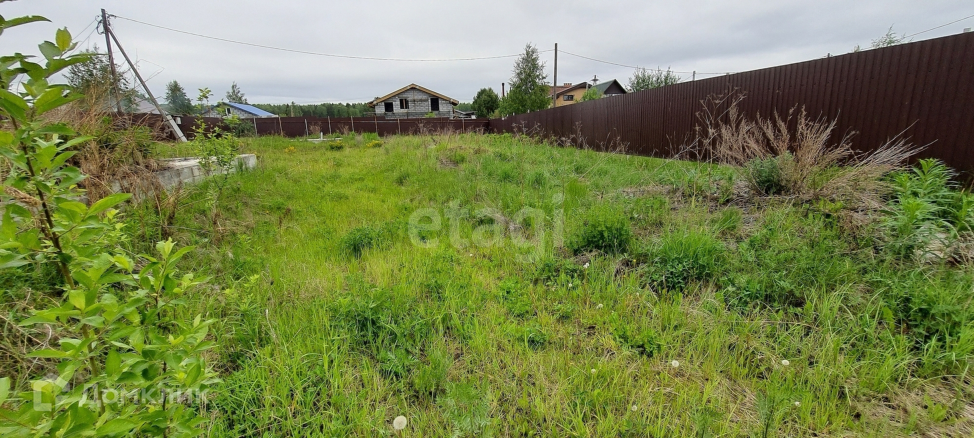 Площадь участка 8,4 сотки. На участке залито два фундамента 6х6 и 10х10 сделан забор и электричество. Поселок застроен, вокруг соседи живут круглый год.