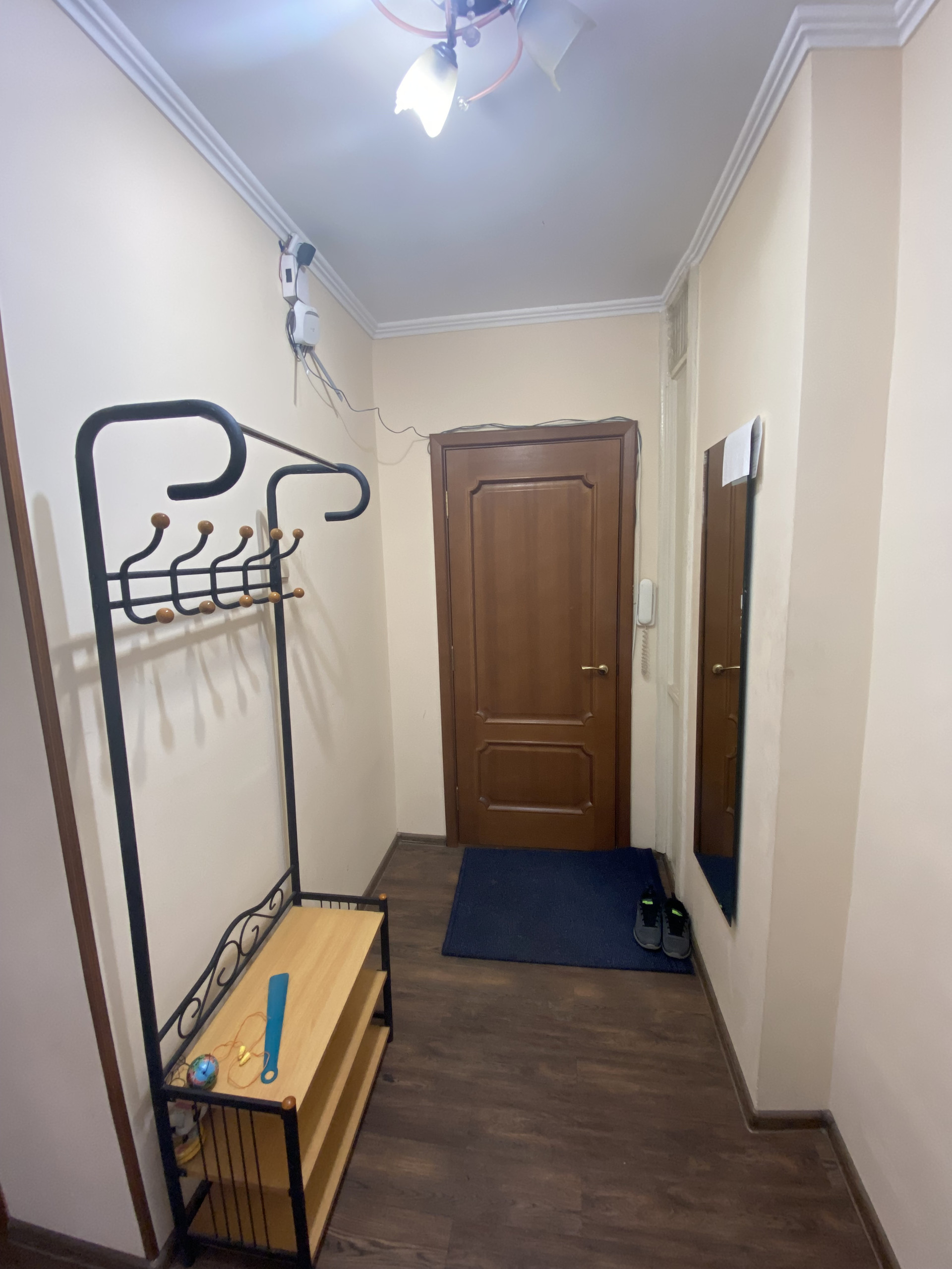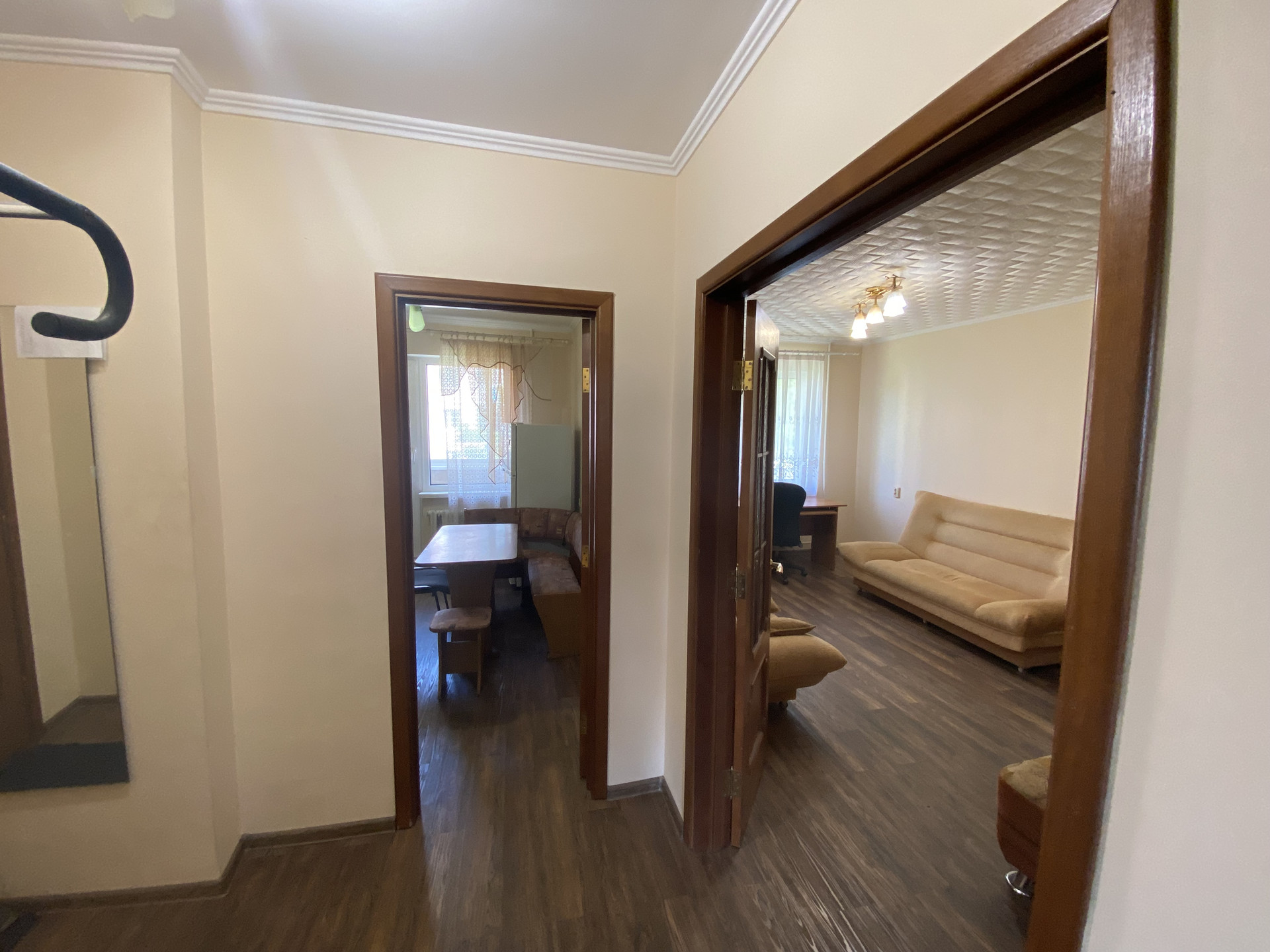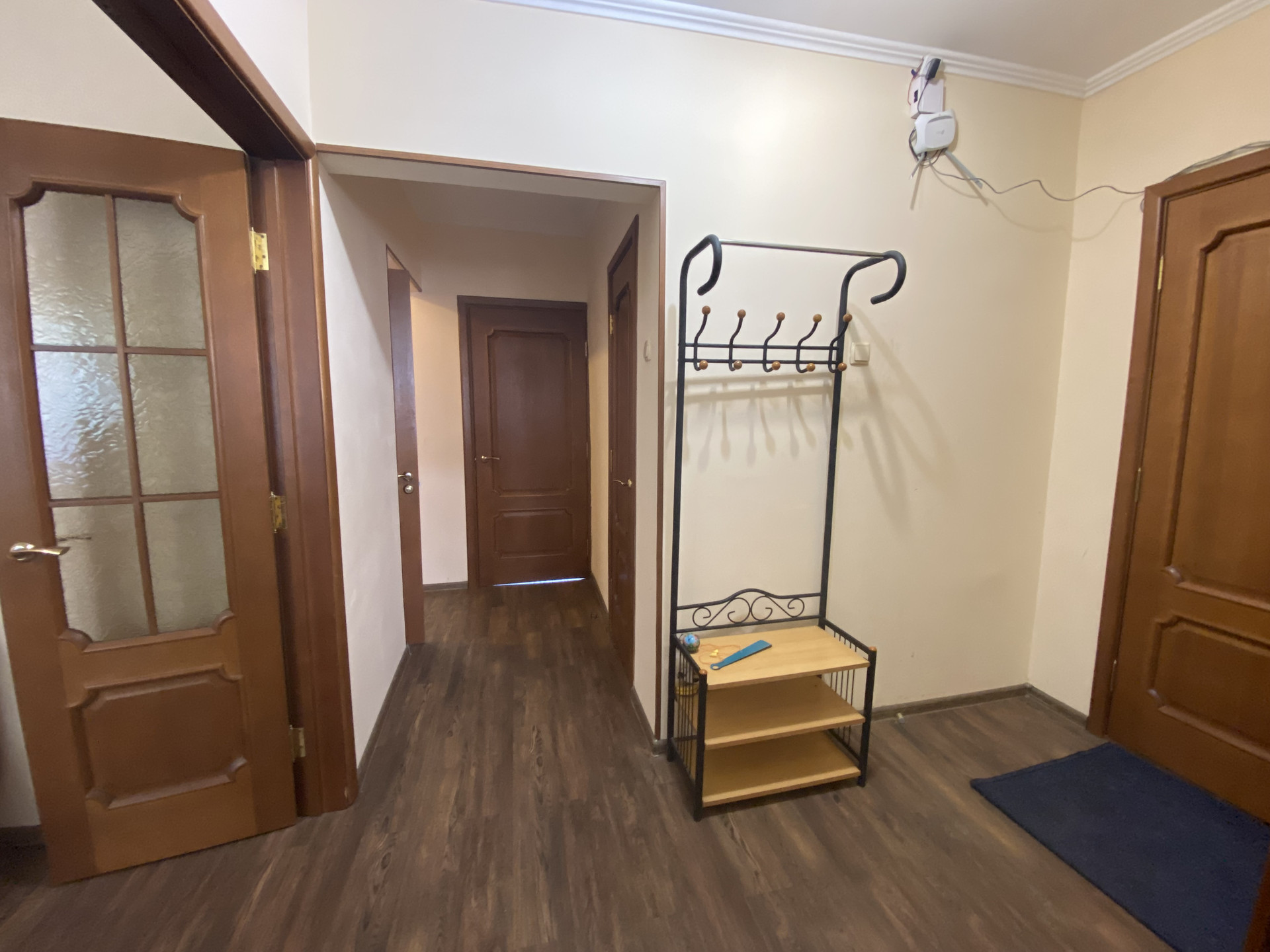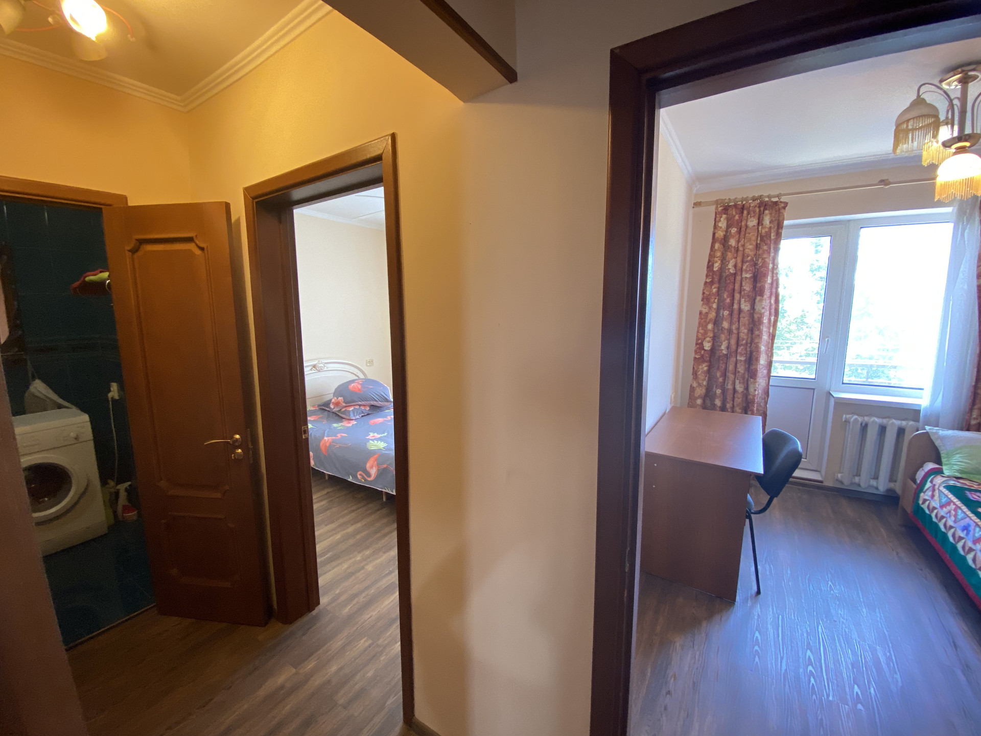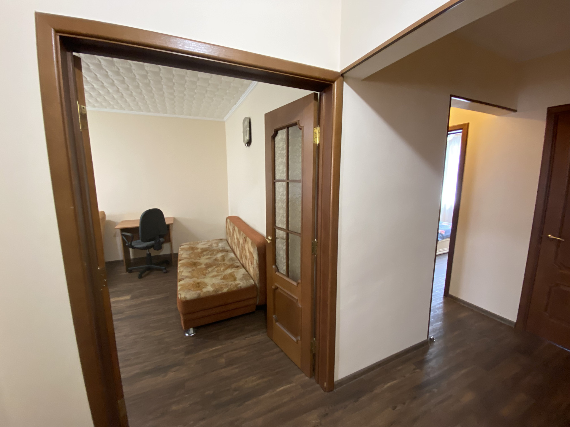 На полу ламинат, в ванной и санузле кафель , пластиковые окна, кладовка