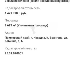 Продажа. Земельный участок. Адрес: п Врангель, г Находка, ул Беринга, д 44 Кадастровый номер: 25:31:070001:9004 Площадь 19,6 сот. Вид права: Собственность Категория земель: Земли населенных пунктов Виды разрешенного использования: Для индивидуальной жилой застройки Участок в центре пос. Врангель на Береговой. Рядом с жилым комплексом. Вся инфраструктур... |