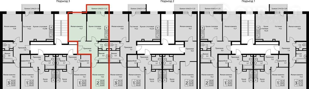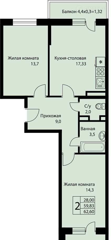 Общая площадь 62.6 м2