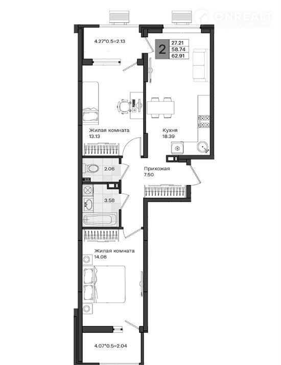 Общая площадь 62.9 м2