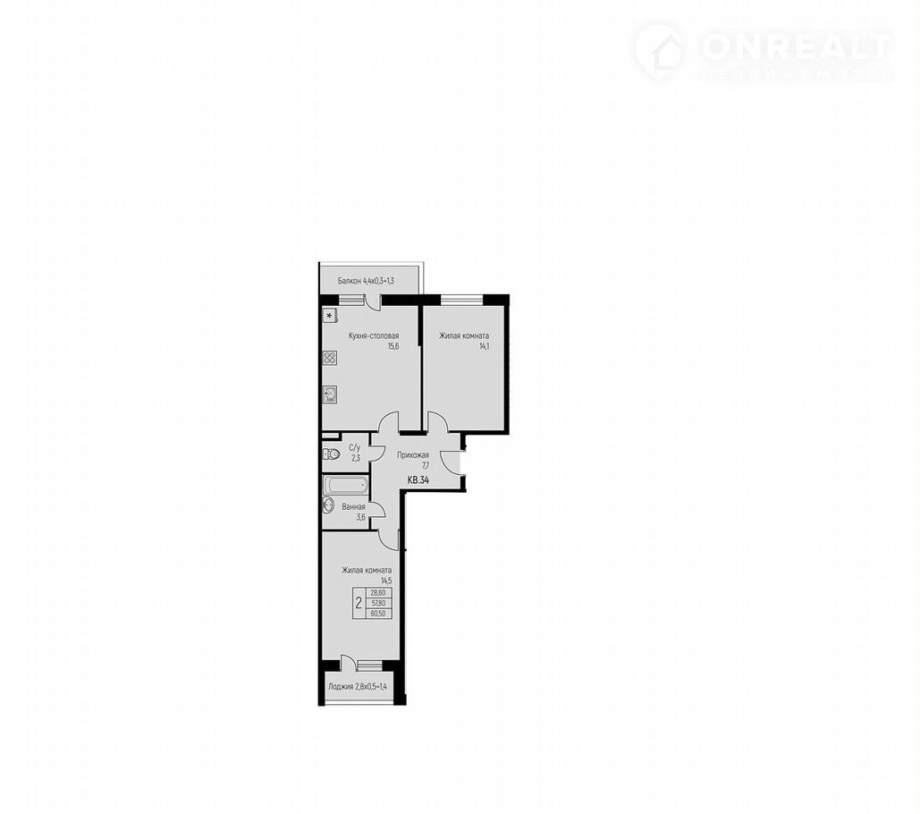 Общая площадь 60.5 м2