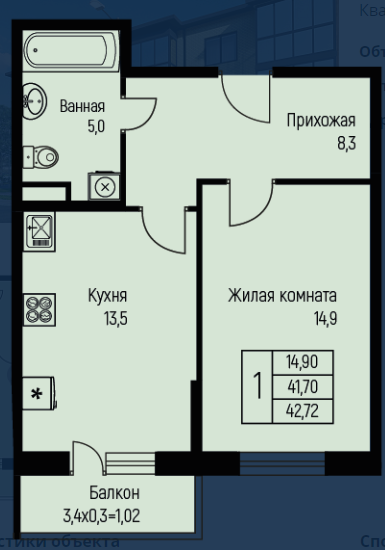 Общая площадь 42.72 м2