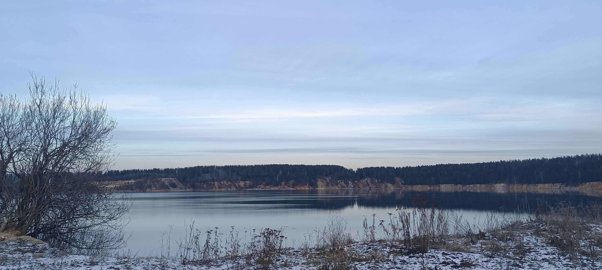 берегу водоёма. Вокруг лес.