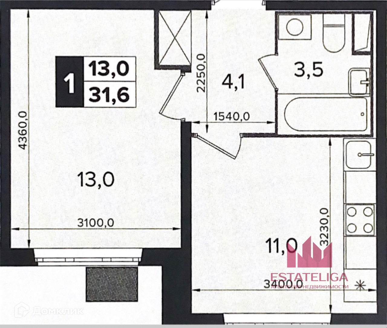 Общая площадь 31.6 м2