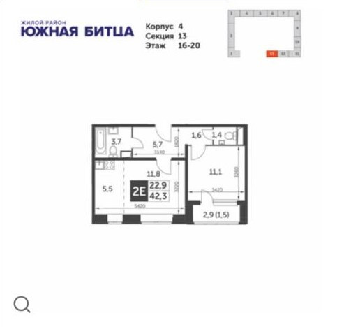 Общая площадь 42.3 м2