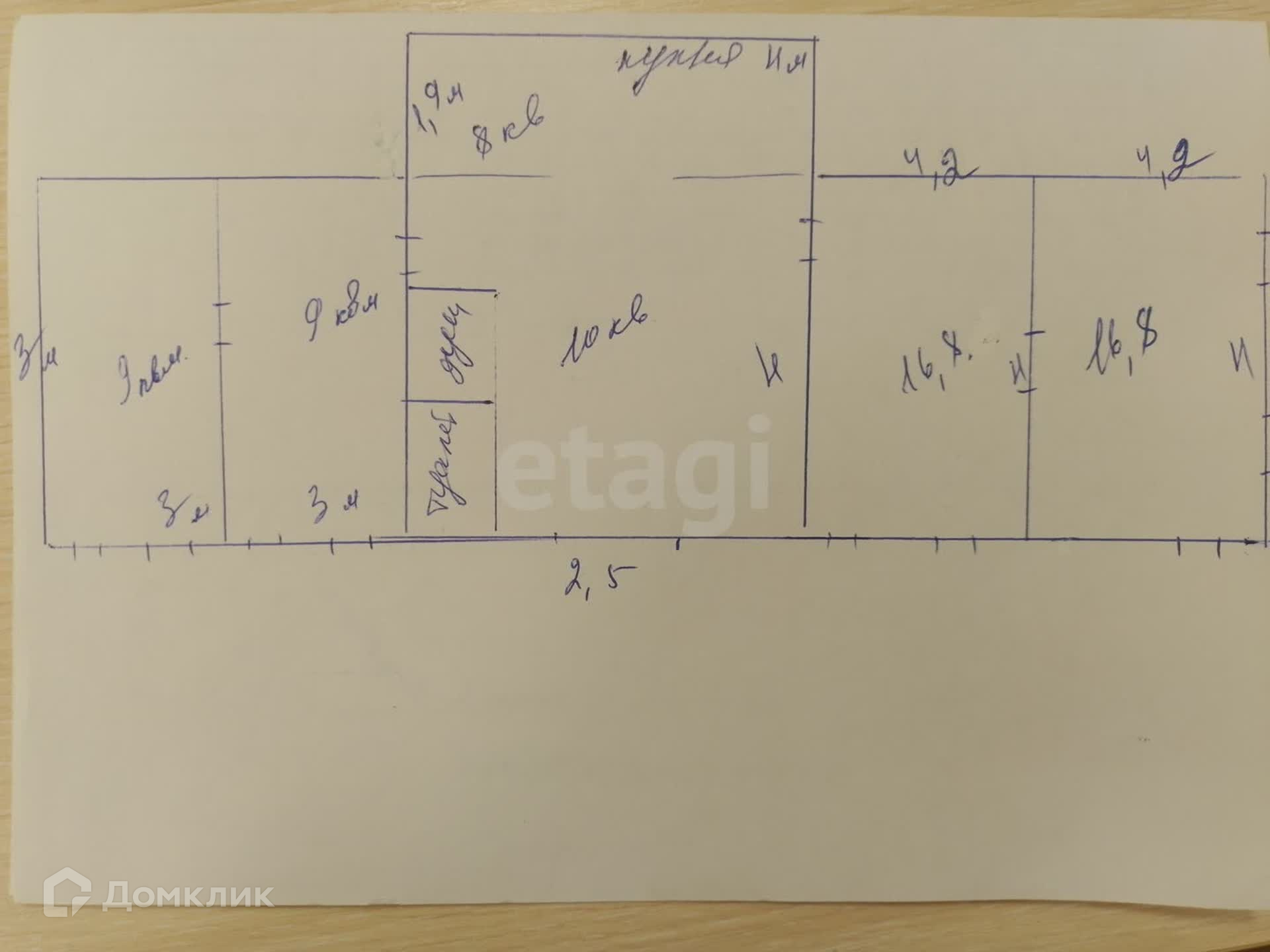 В доме четыре смежно изолированные комнаты, в правой части две проходные комнаты по 9м2, в левой две проходные комнаты по 16.8м2. По центру строения просторная прихожая 10м2, раздельный санузел, кухня 8м2.