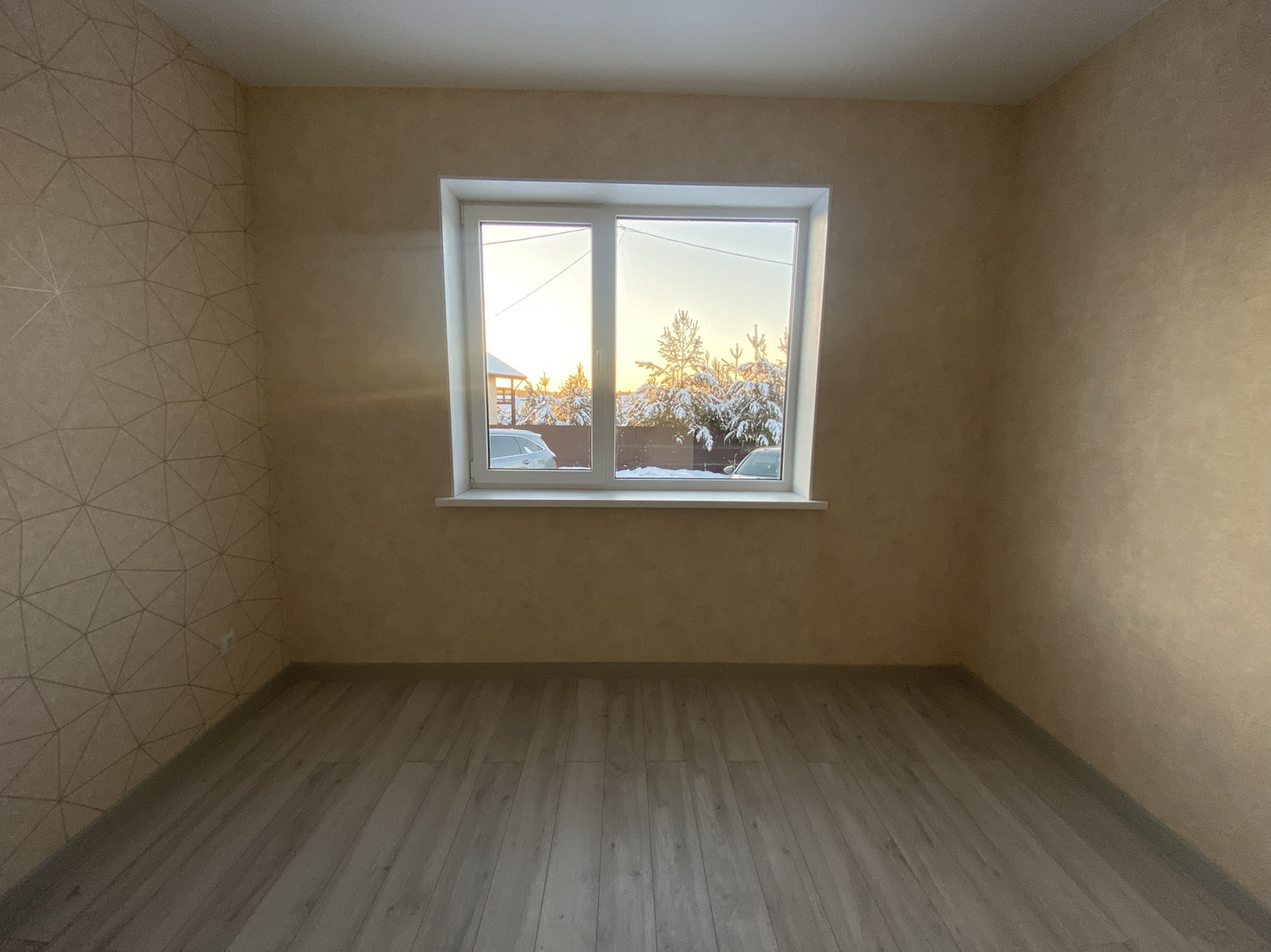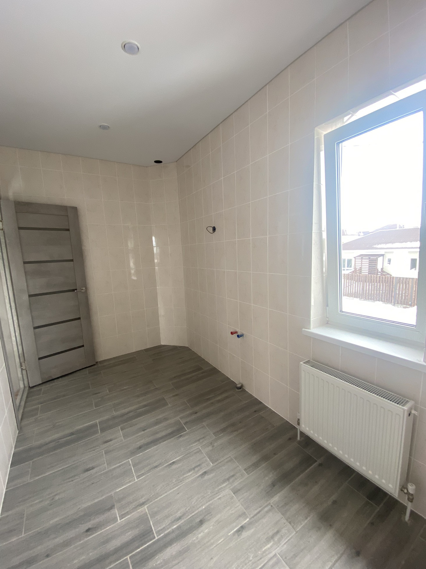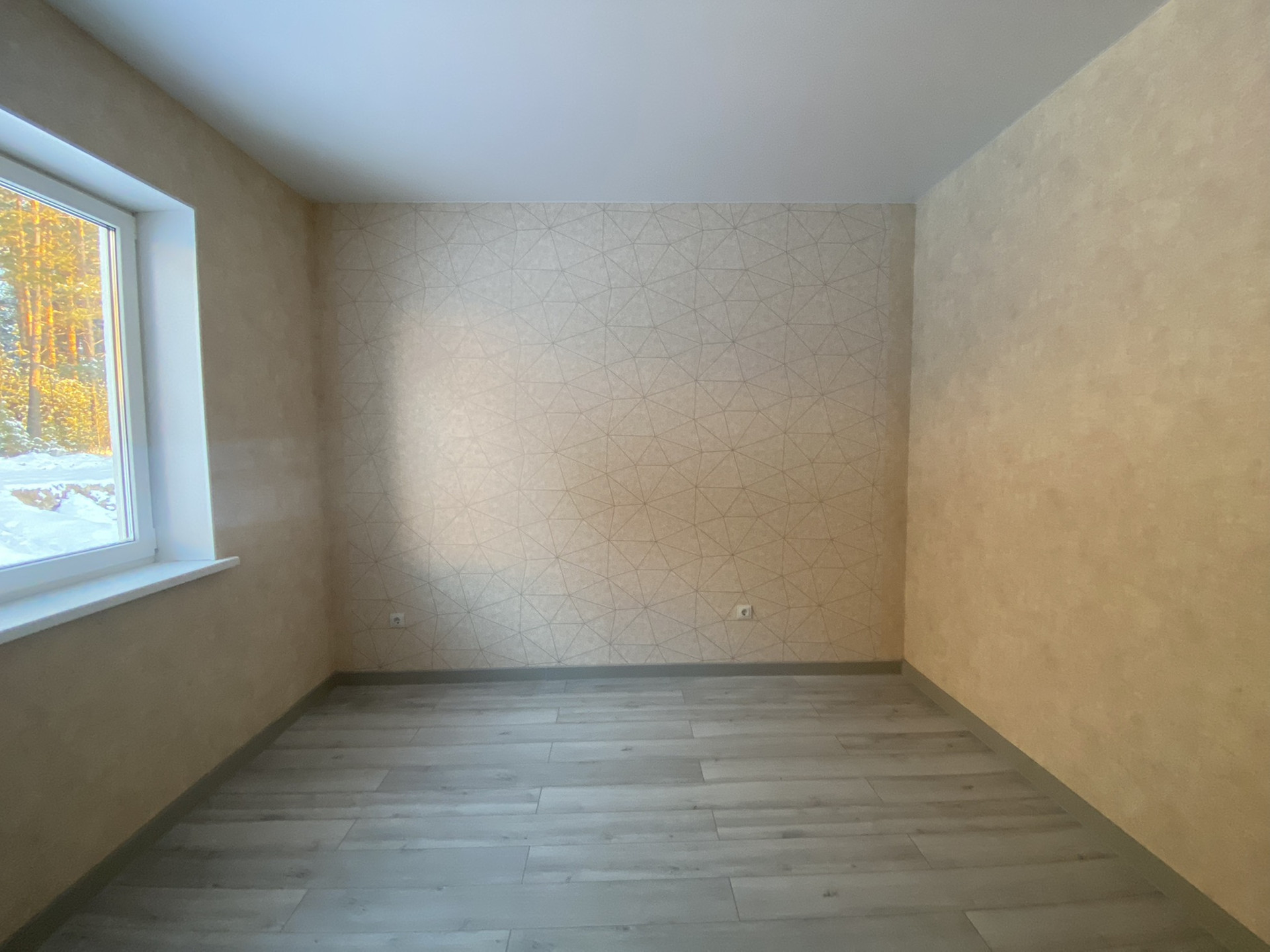 - обои нейтральных тонов, натяжные потолки, на полу: в комнатах - ламинат, в кухне-гостинной, в коридоре, в прихожей, в санузле и в котельной - керамогранитная плитка.