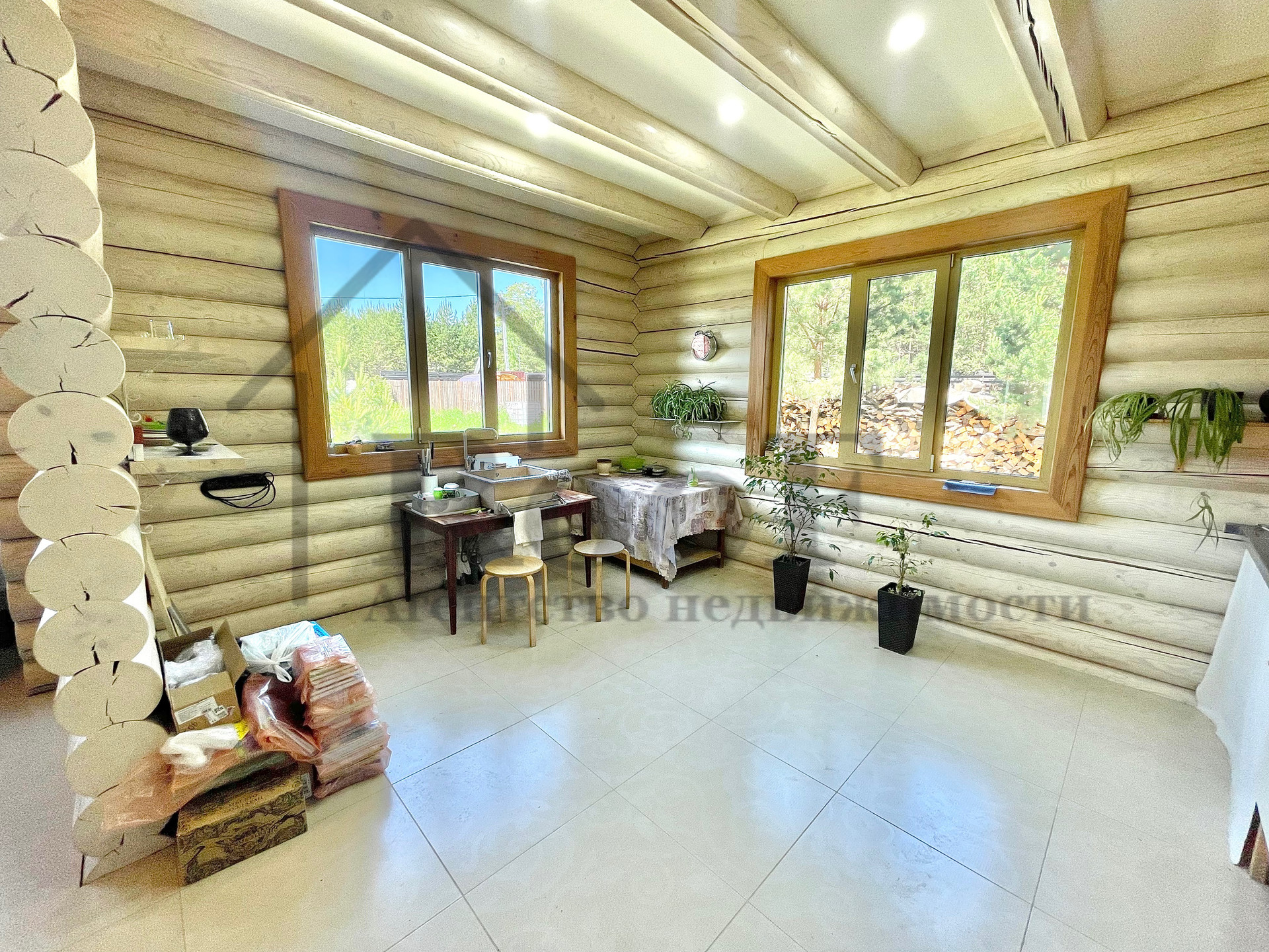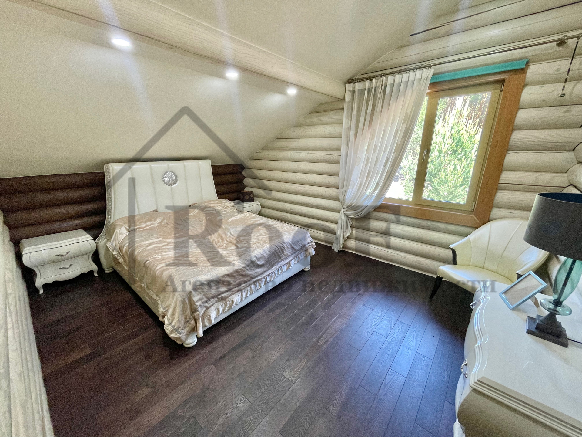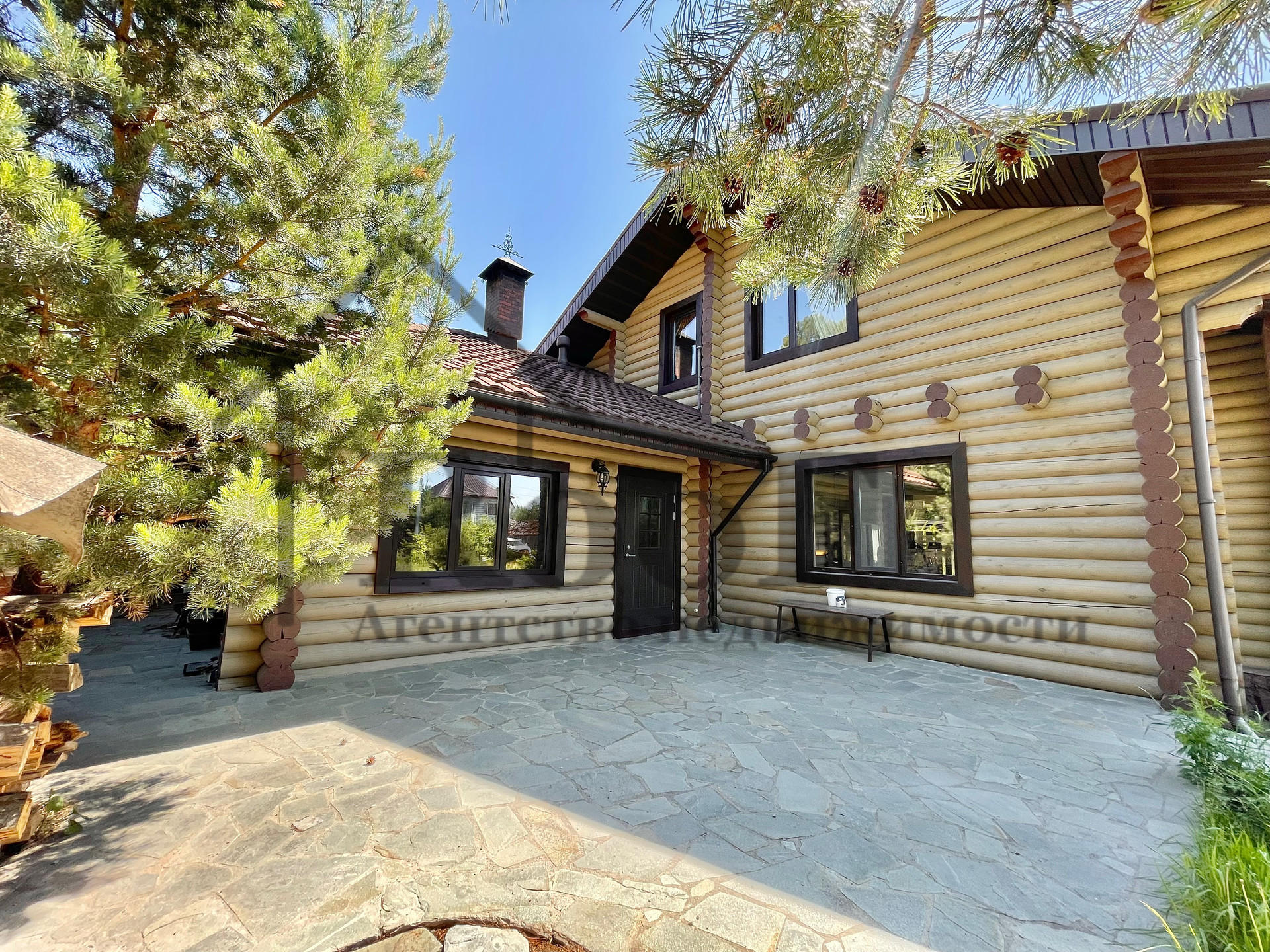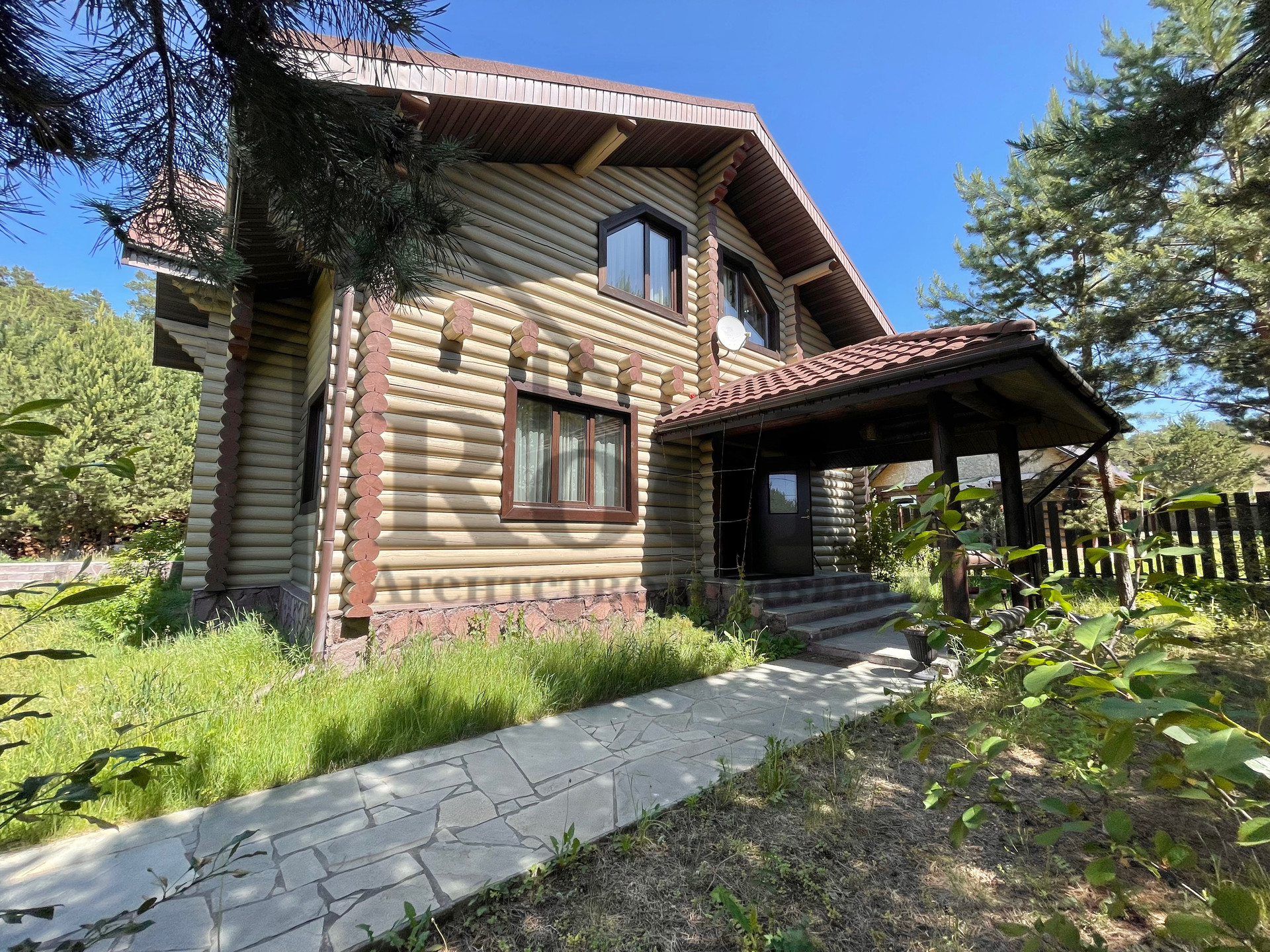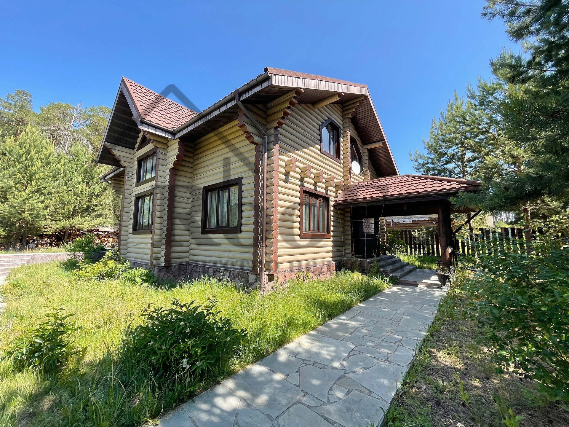 Дом выполнен в ЭКО стиле, свайный фундамент + плита, несущие стены из бревна с противопожарным покрытием, кровля из мягкой черепицы.