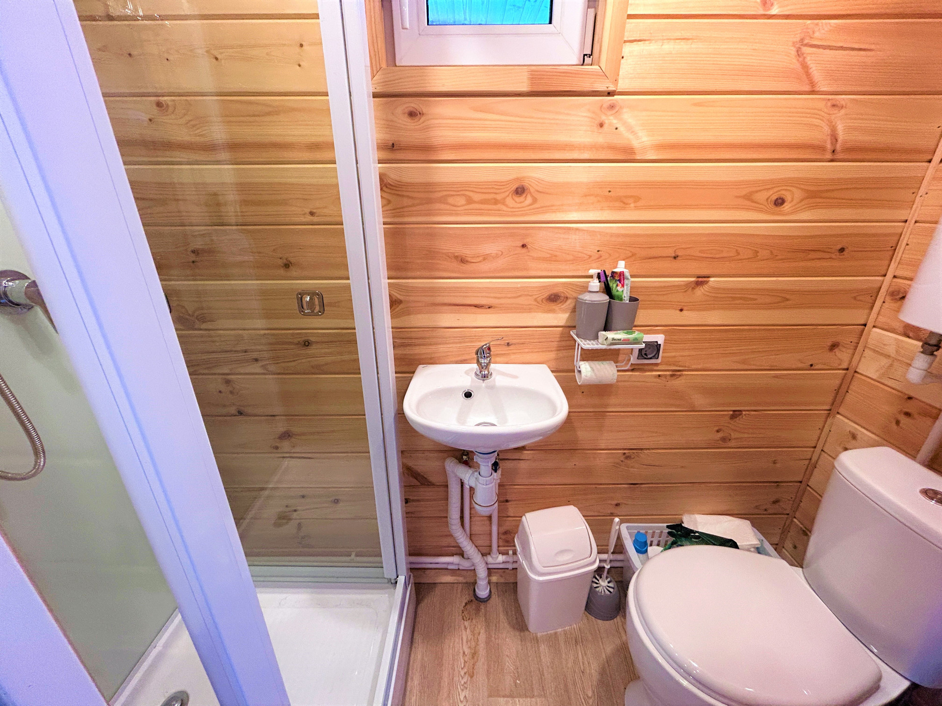 гостевая зона для просмотра кино, терраса с крышей, туалет с раковиной, унитазом и душевой кабинкой,