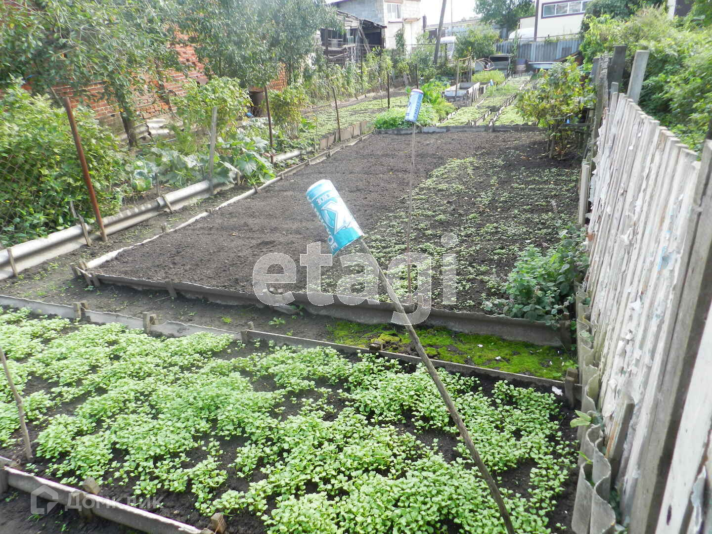 Земельный участок (2 сотки) правильной прямоугольной формы, без уклона. На участке плодовые деревья и кустарники.