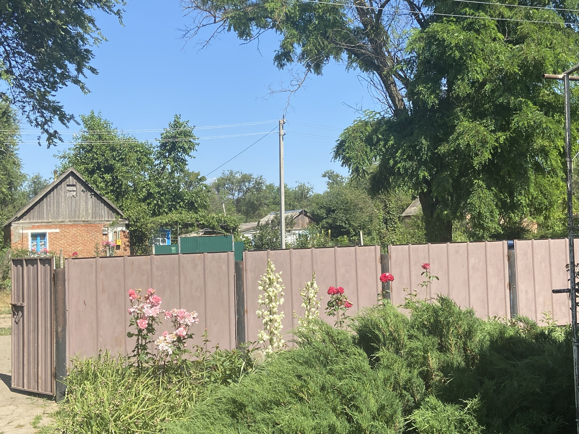 Много плодовых деревьев и кустарников, территория двора огорожена.