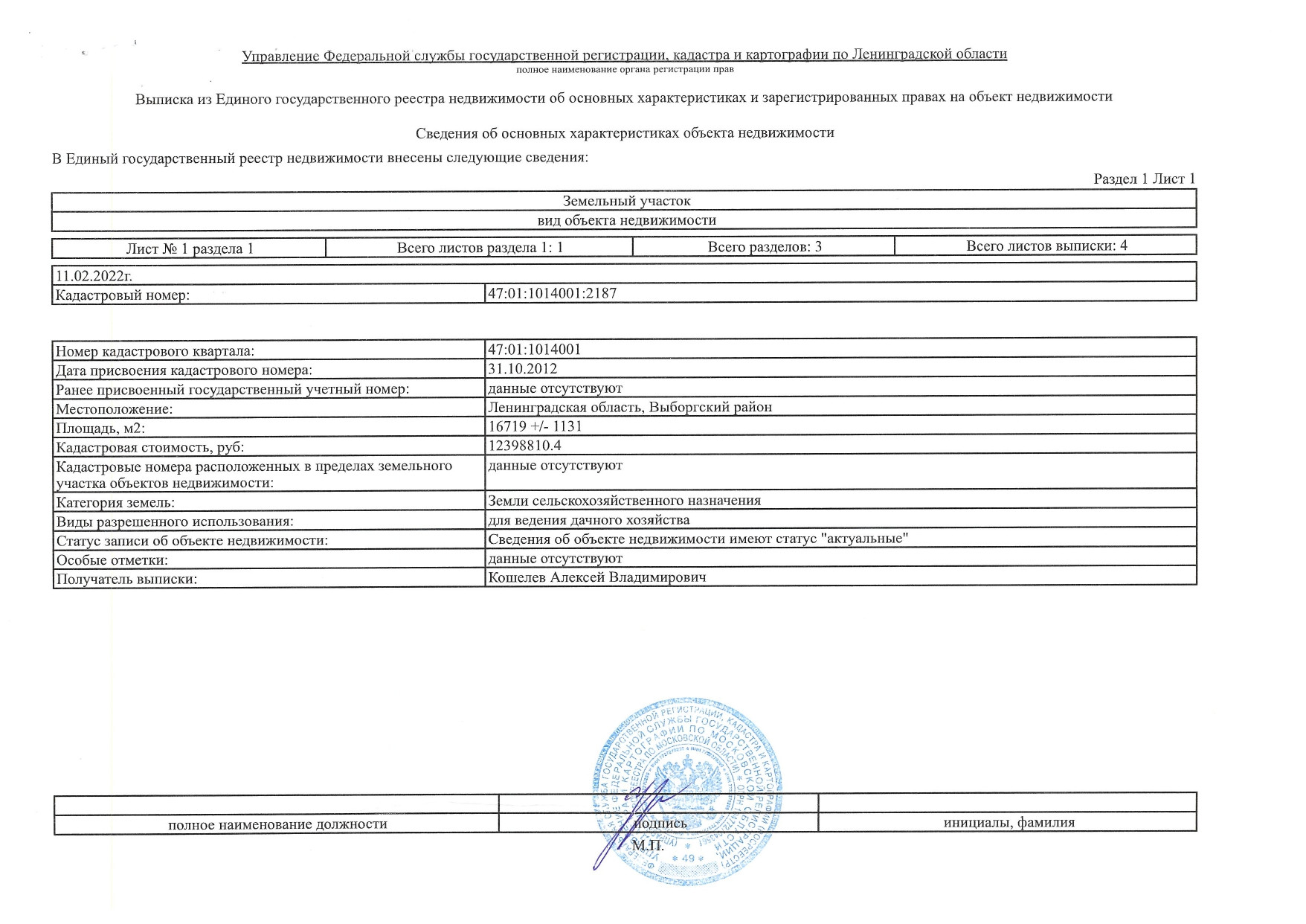Продаю земельный участок для дачного строительства. Площадь участка - 1,67 га. Категория земель - земли сельскохозяйственного назначения. Вид разрешённого использования - для ведения дачного хозяйства. Кадастровый номер: 47:01:1014001:2187. Кадастровая стоимость - 12 398 810 рублей. Вид права - собственность. Один собственник, физическое лицо. Земля отмежёвана, то есть установлены границы согласно законодательству. Хорошие подъездные пути, две автодороги и коммуникации находятся рядом. Земельный массив расположен в красивом, живописном месте, в 5 км от Выборгского залива и в 20 км от г. Выборг. Не далеко протекает р. Полевая и находится населённый пункт Большое Поле. В шаговой доступности, два озера, Ушаковское и Подпорожистое. Адрес участка: Ленинградская область, Выборгский район.