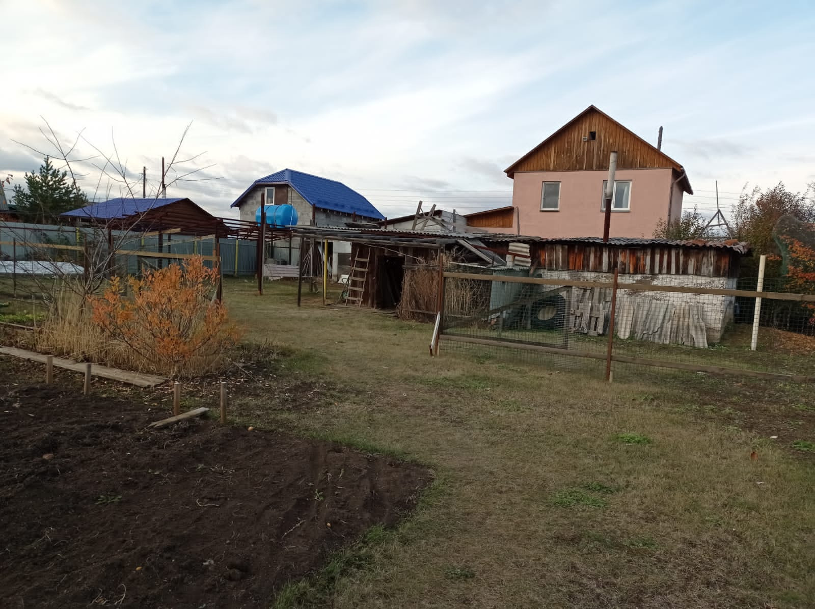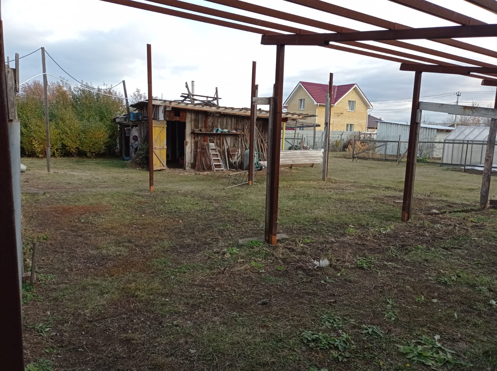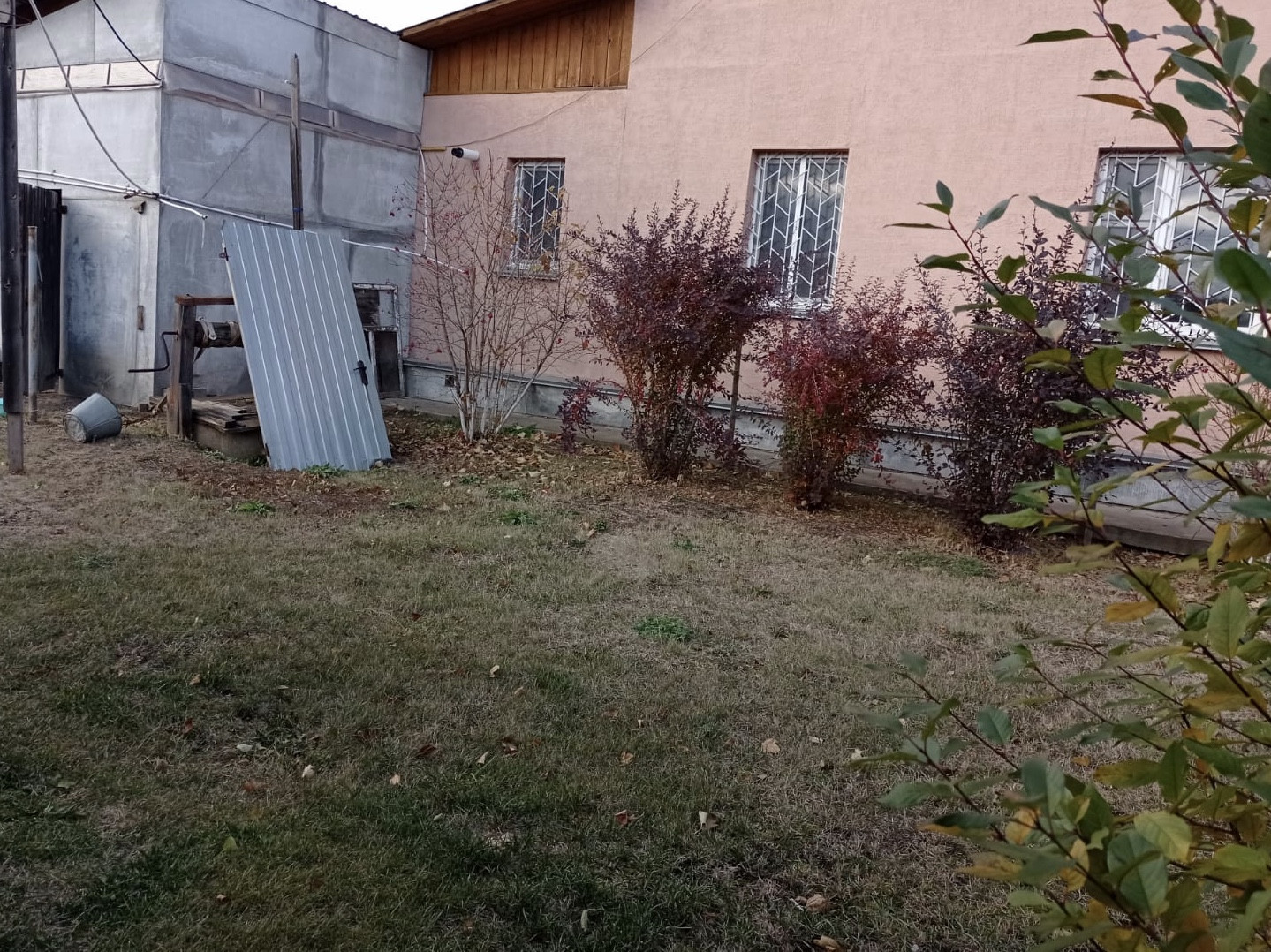 На участке газон. Есть вишневые деревья. Хоз. Постройка для хранения инвентаря.