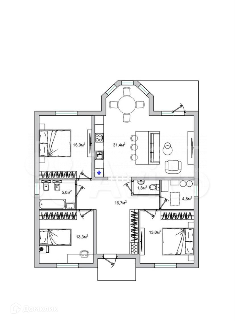 Метраж: площадь участка – 6 сот., общая площадь дома – 106,9 кв.м., зал с кухней – 31,4 кв.м., спальня 1 – 13 кв.м., спальня 2 – 13,3 кв.м., спальня 3 – 16 кв.м., прихожая – 16,7 кв.м., санузел 1 – 1,8 кв.м., санузел 2 – 5 кв.м.
