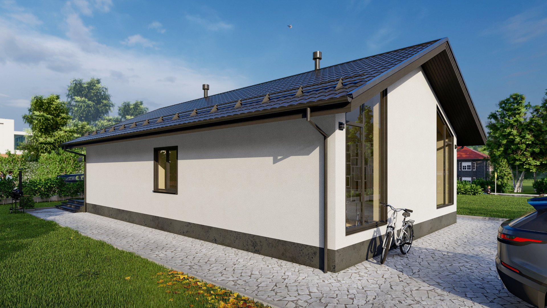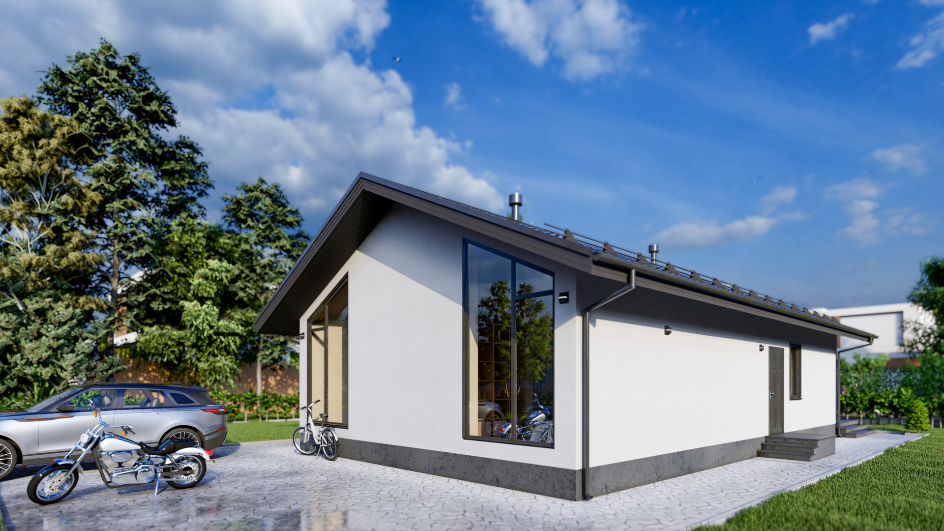 Имеет полностью одну панорамную стену с торца дома во всю ширину и высоту, с выходом на открытую террасу.