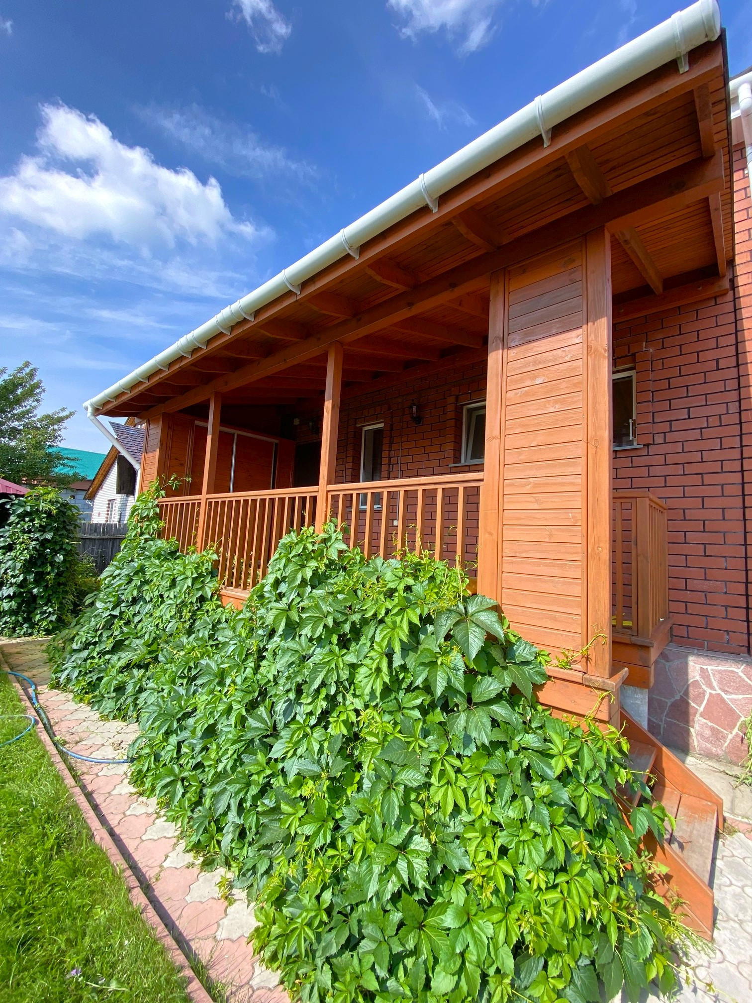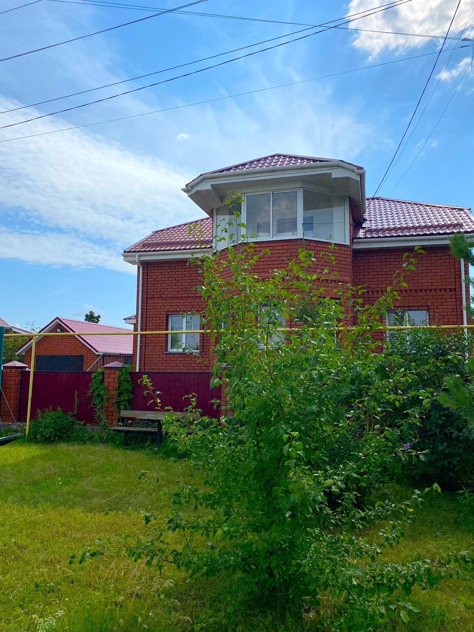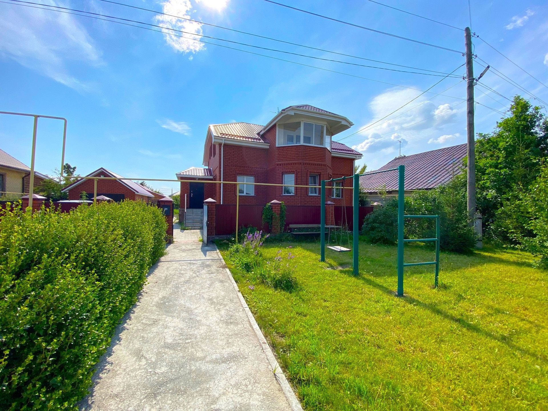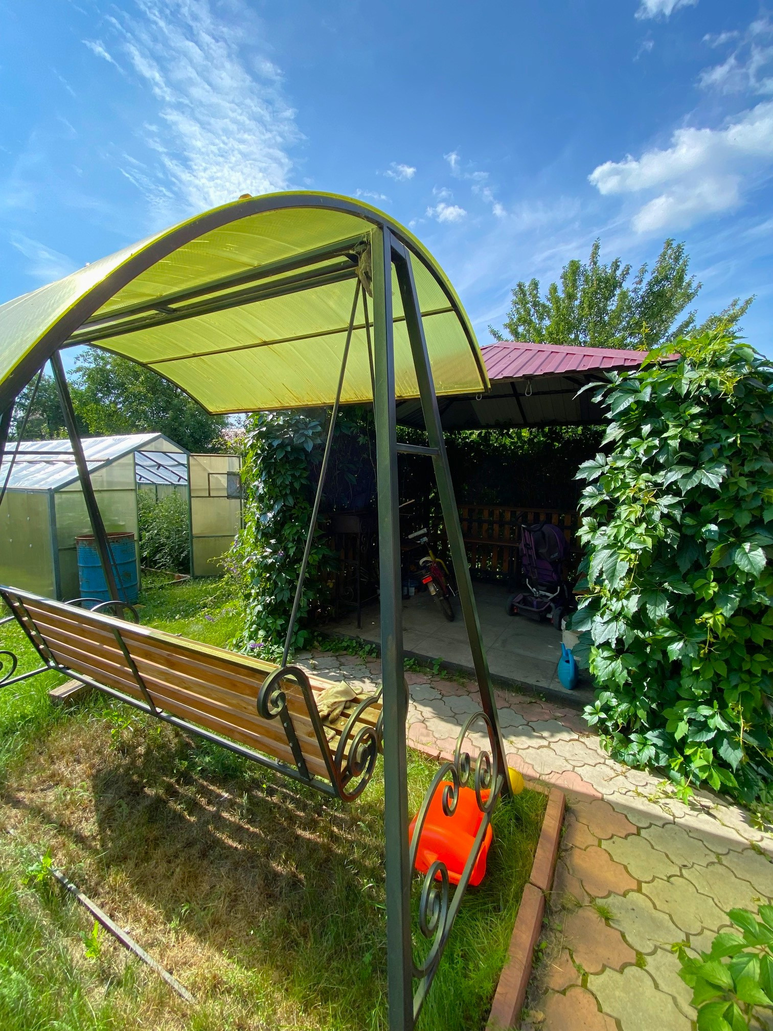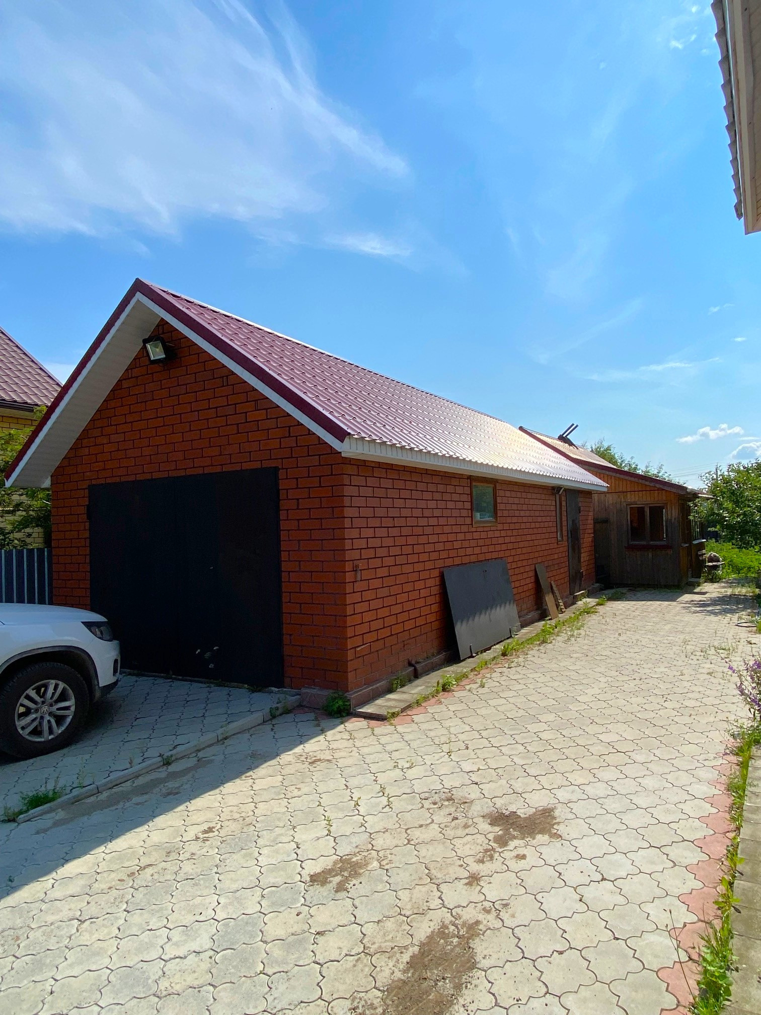 2 теплицы из поликарбоната, гараж 40 кв.м. со смотровой ямой, русская баня на дровах 25 кв.м, беседка с мангальной зоной, двор выложен тротуарной плиткой.