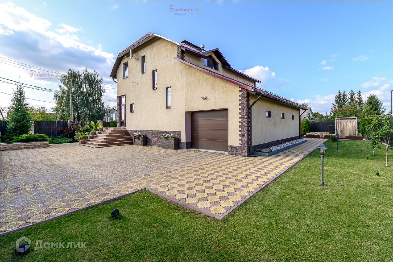 Участок полностью огорожен забором из кирпича и лиственницы. Благоустройство участка двуцветной тротуарной плиткой, газонами, плодоносящими кустарниками, деревьями и системой полива.