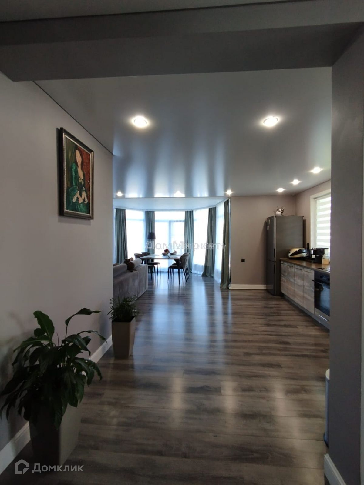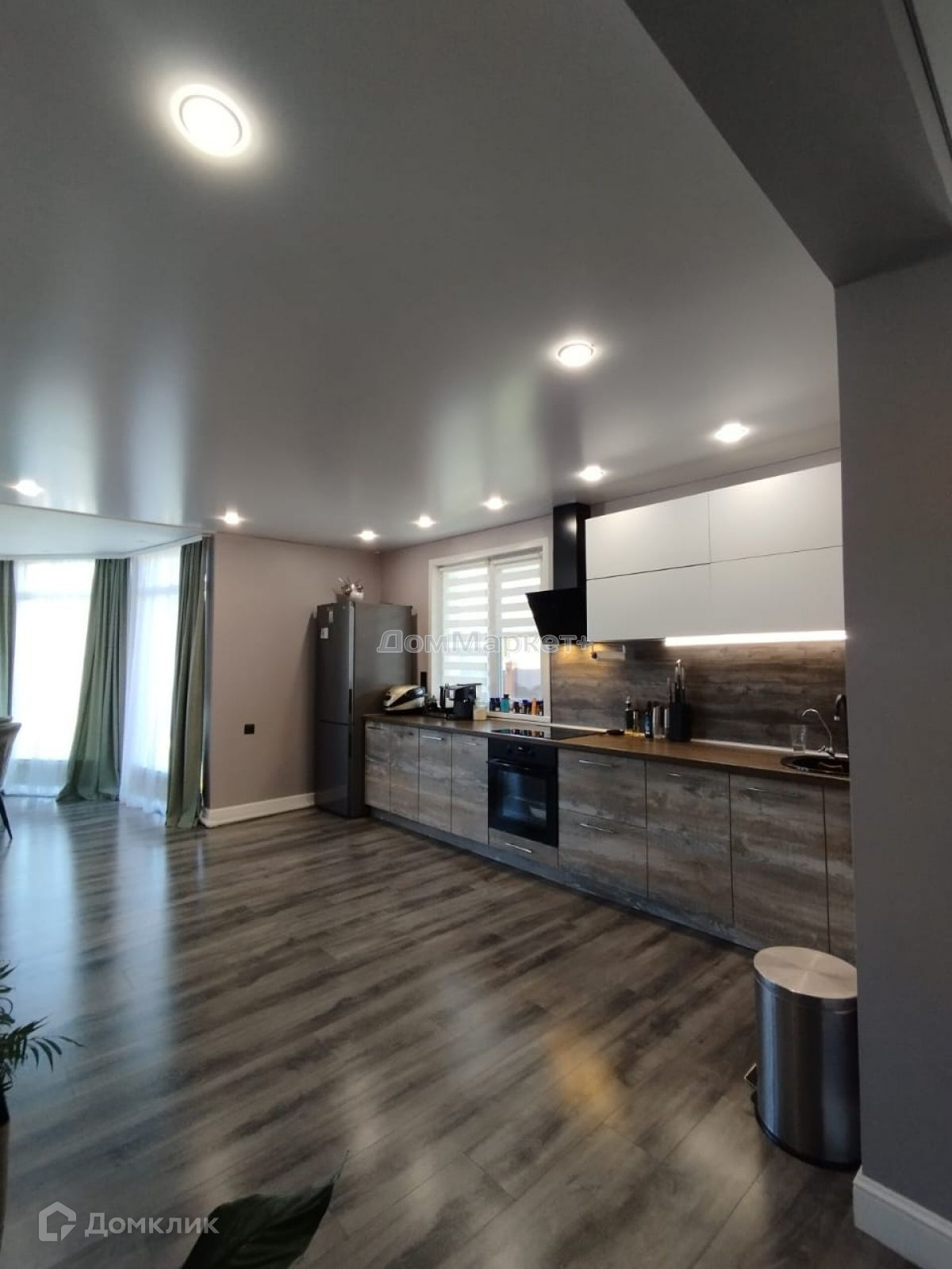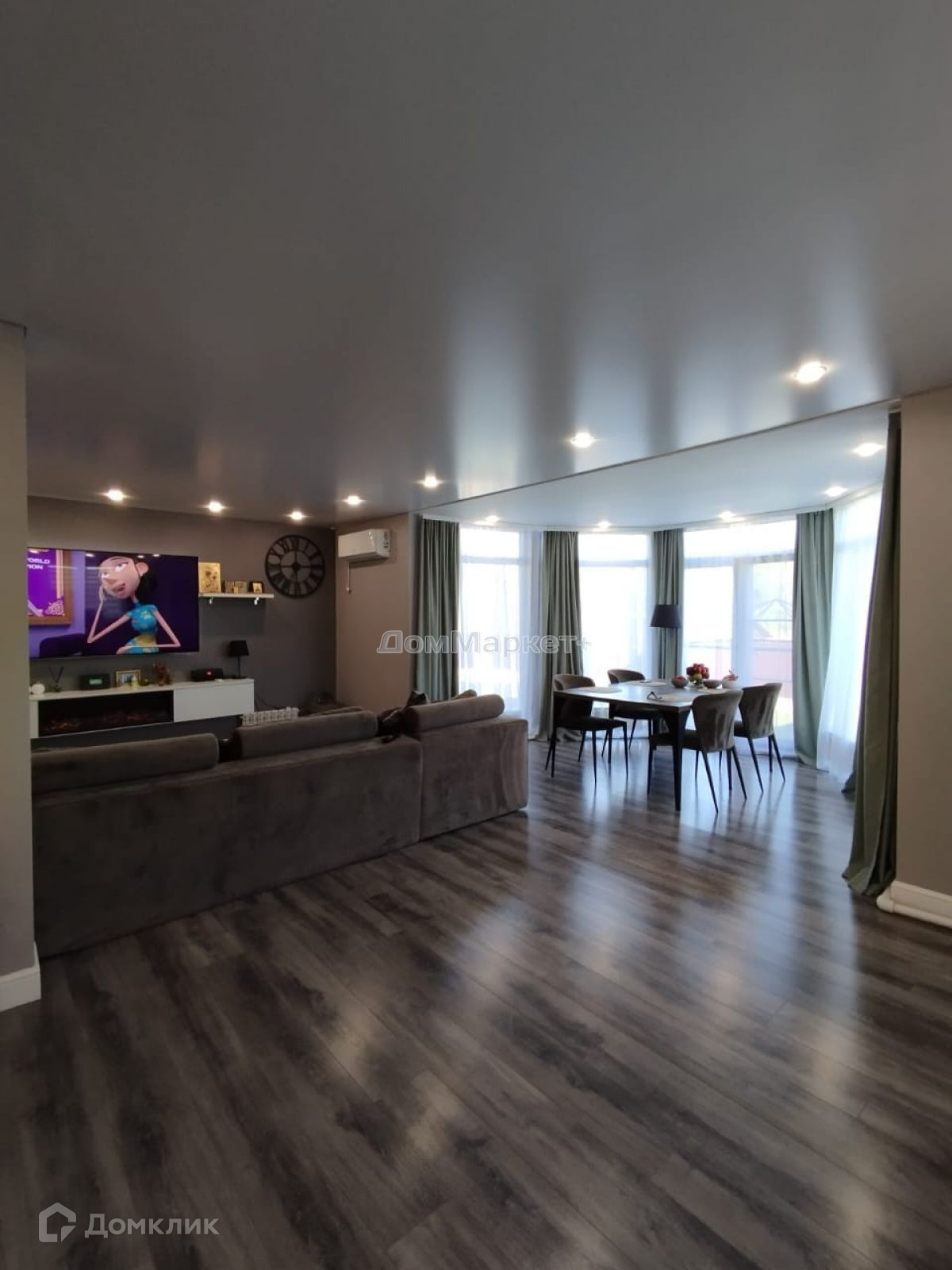 Кухня – гостинная: электрический камин,который включая добавляет домашнего уюта, встроенный кухонный гарнитур , со встроенной бытовой техникой , угловой диван , обеденная группа: стол,четыре стула, журнальный столик.