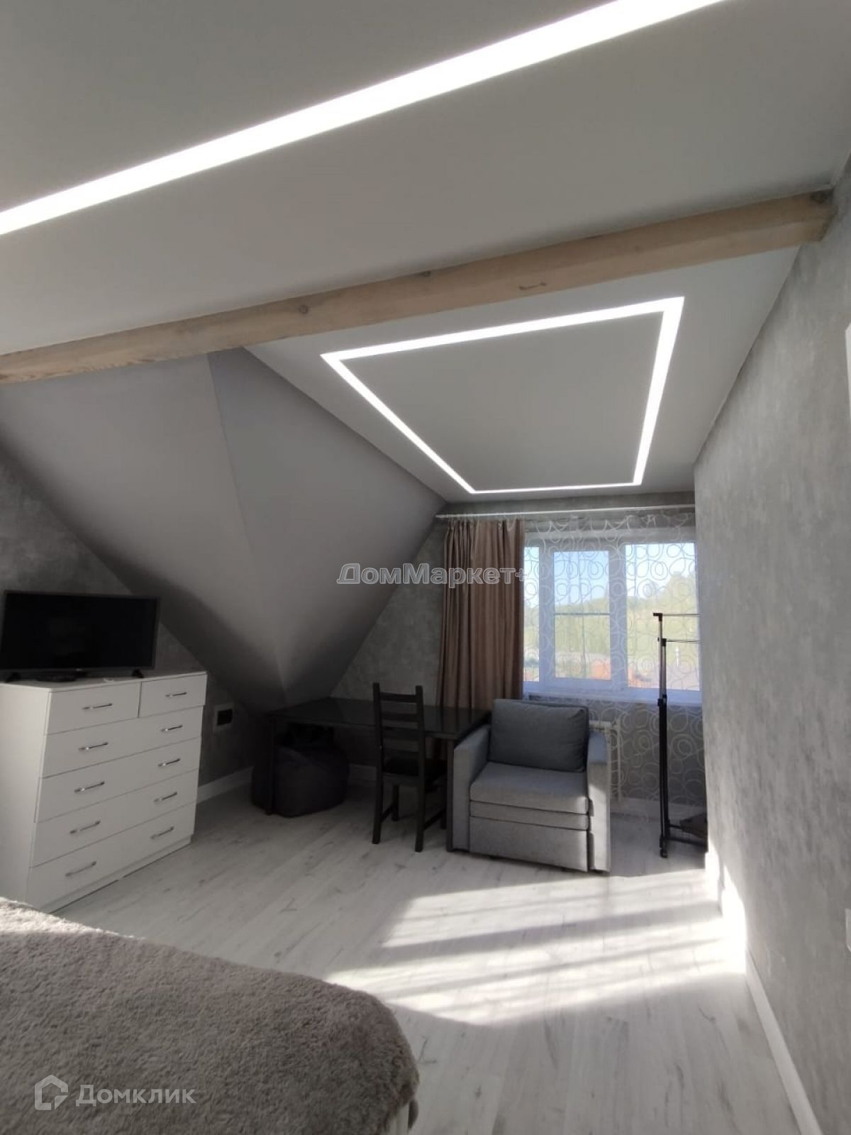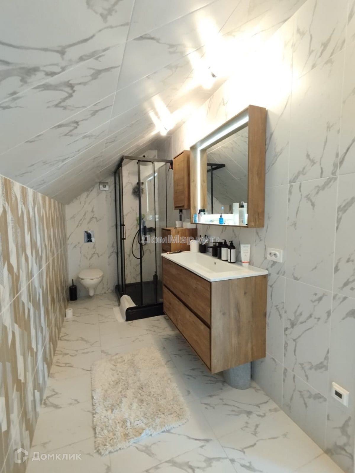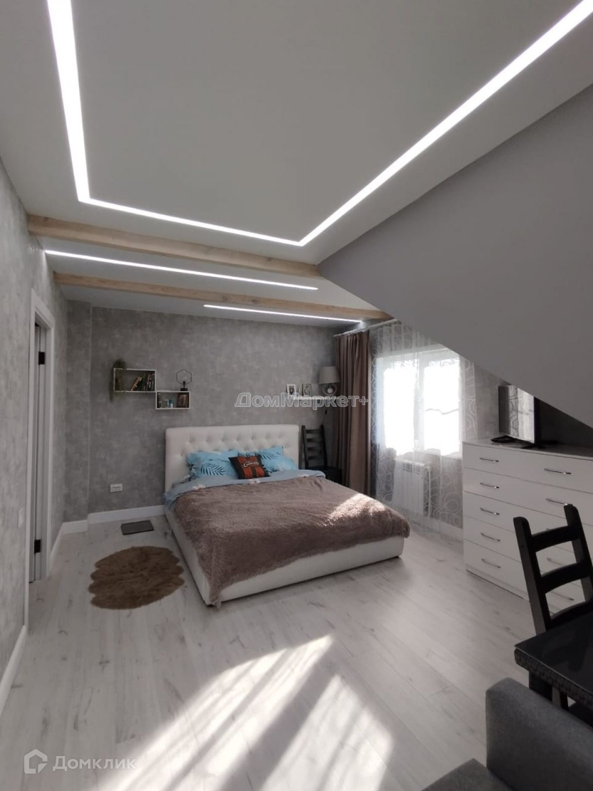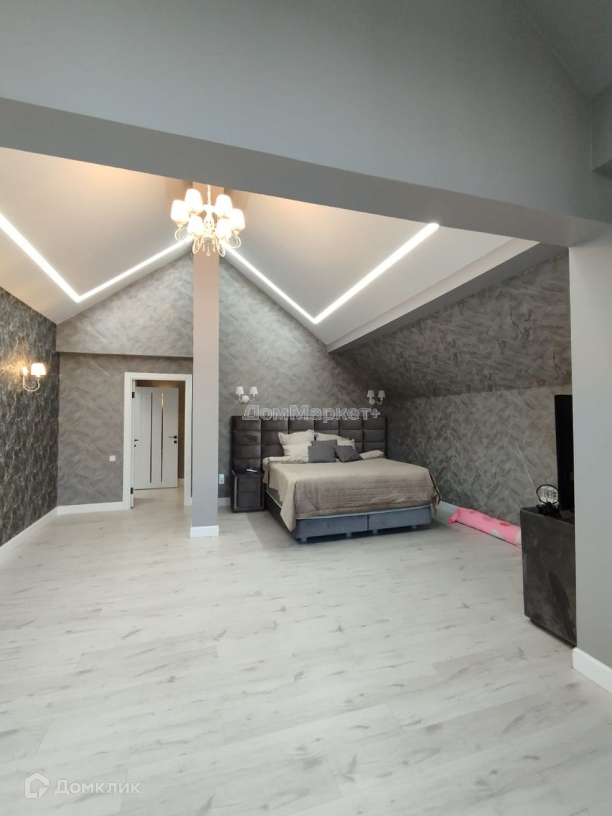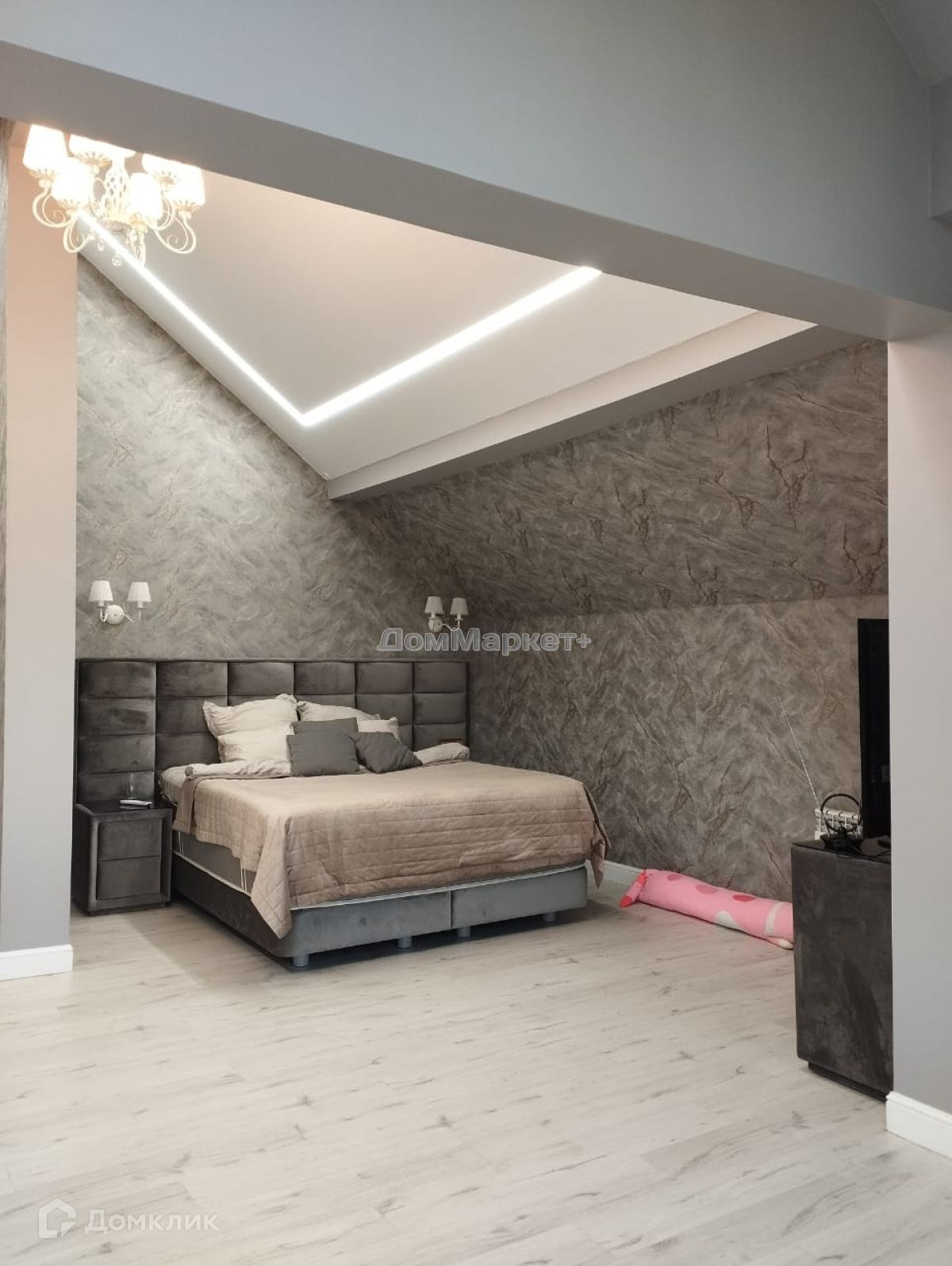 Мастер-спальня: кровать двух спальная , комод.,Имеется свой сан узел, пол и стены выложены керамогранитом,теплый электрический пол унитаз инсталяция, душевая кабина,,тумба с раковиной подвесная., зеркало с подсветкой.