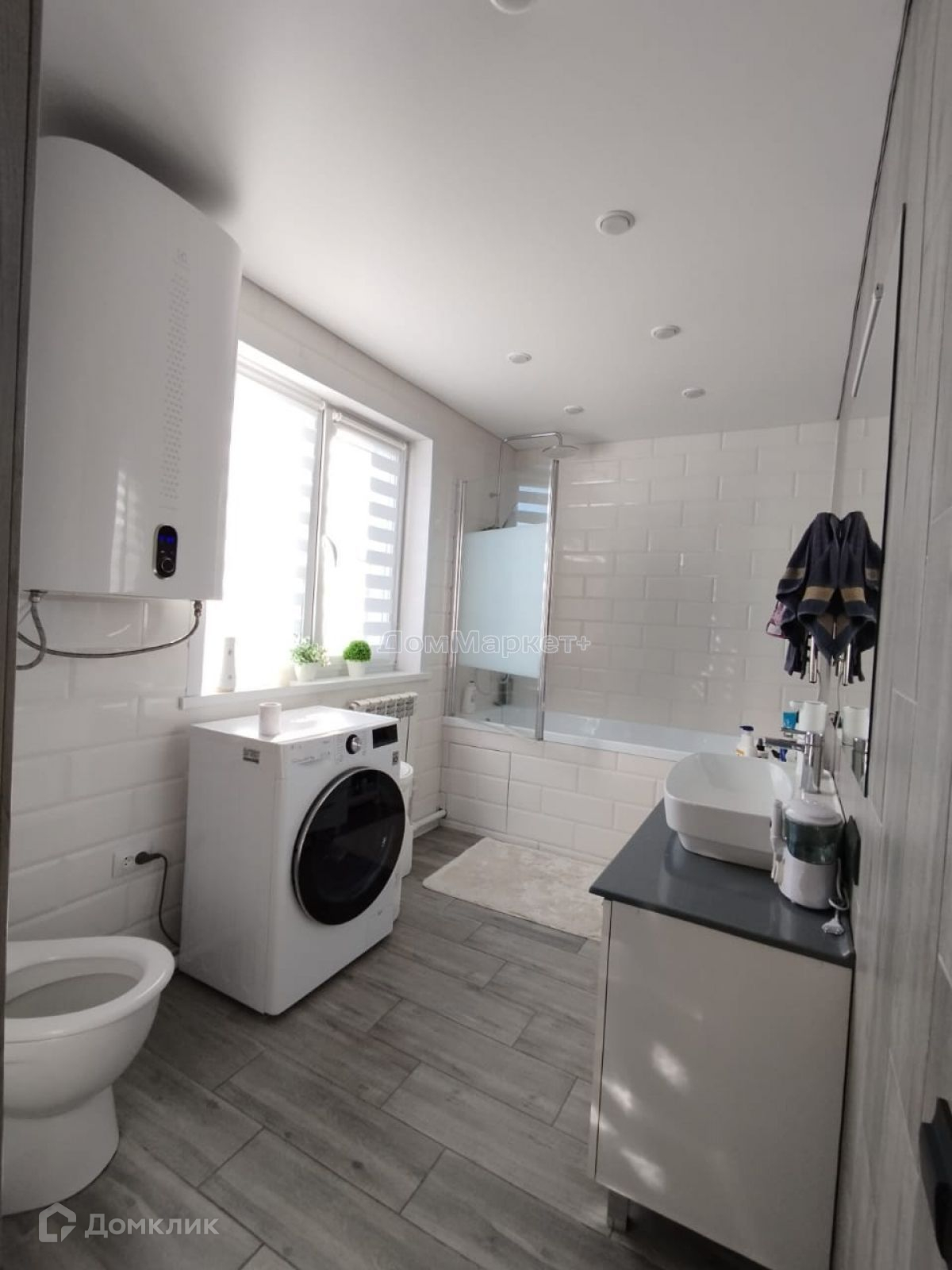 Ванная комната : стены кафель, пол керамогранит, теплый электрический пол, водоногреватель, унитаз, ванна, тумба с раковиной.