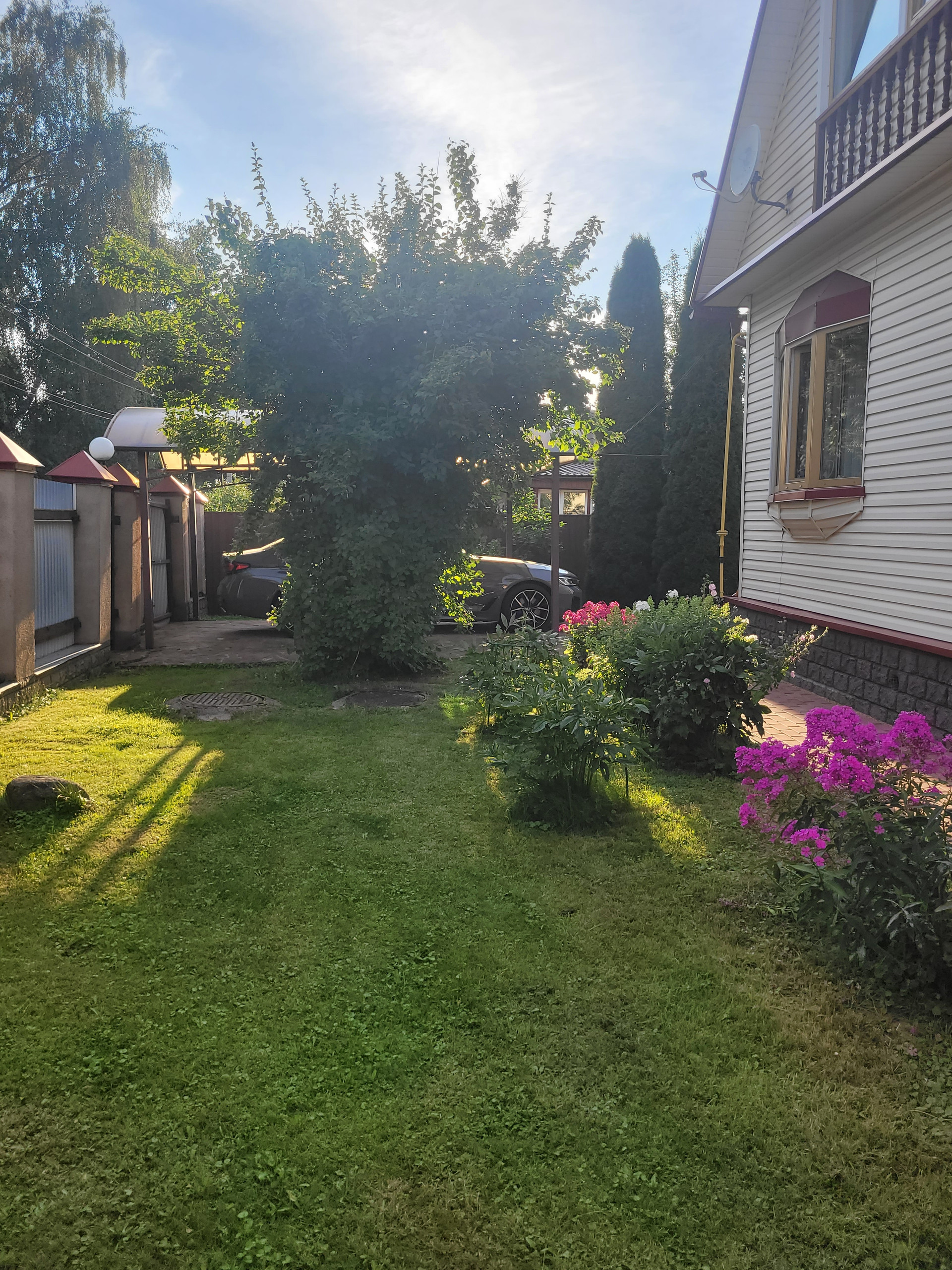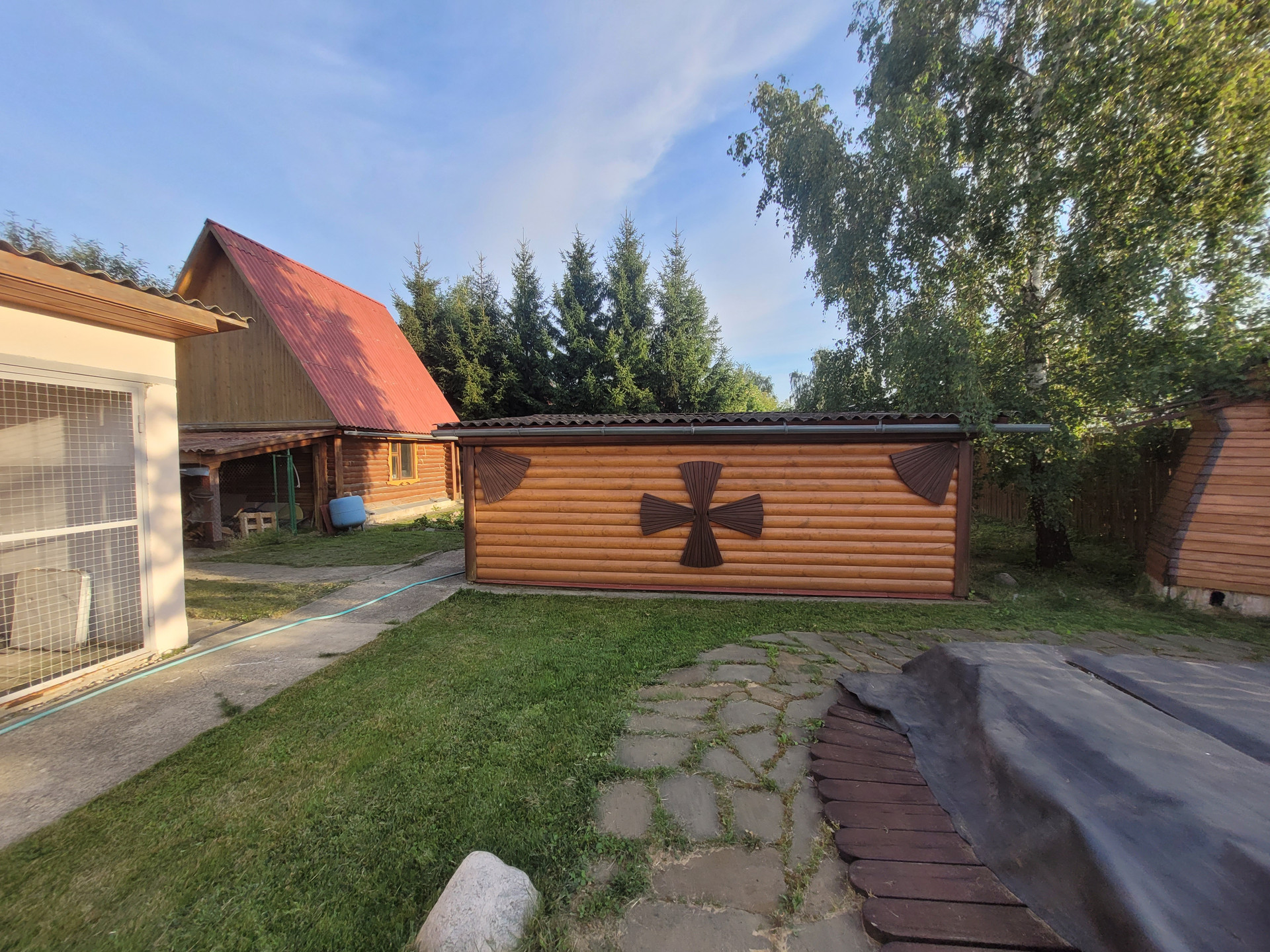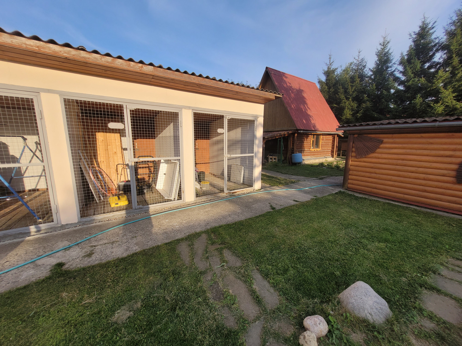 Участок, на котором находится дом, окружен по всему периметру капитальным забором. Автомобили можно оставить либо под навесом перед домом либо в гараже. На участке кроме дома, расположены: баня, пл. 54 м2, летний дом пл. 25м2, три хозяйственные постройки общей пл. 83,1 м2, вольер для собак . Участок благоустроен: туи при входе дают тень в жаркую погоду и придают уютный вид, различные плодовые деревья и кустарники дают хороший урожай яблок, груш, ягод. Мощность электричества составляет 25кВт. При этом выполнено два подключения: наземное и подземное, что позволяет распределить мощность между всеми постройками на участке, не перегружая сеть. Фасад дома облицован сайдингом, стены выполнены из бруса