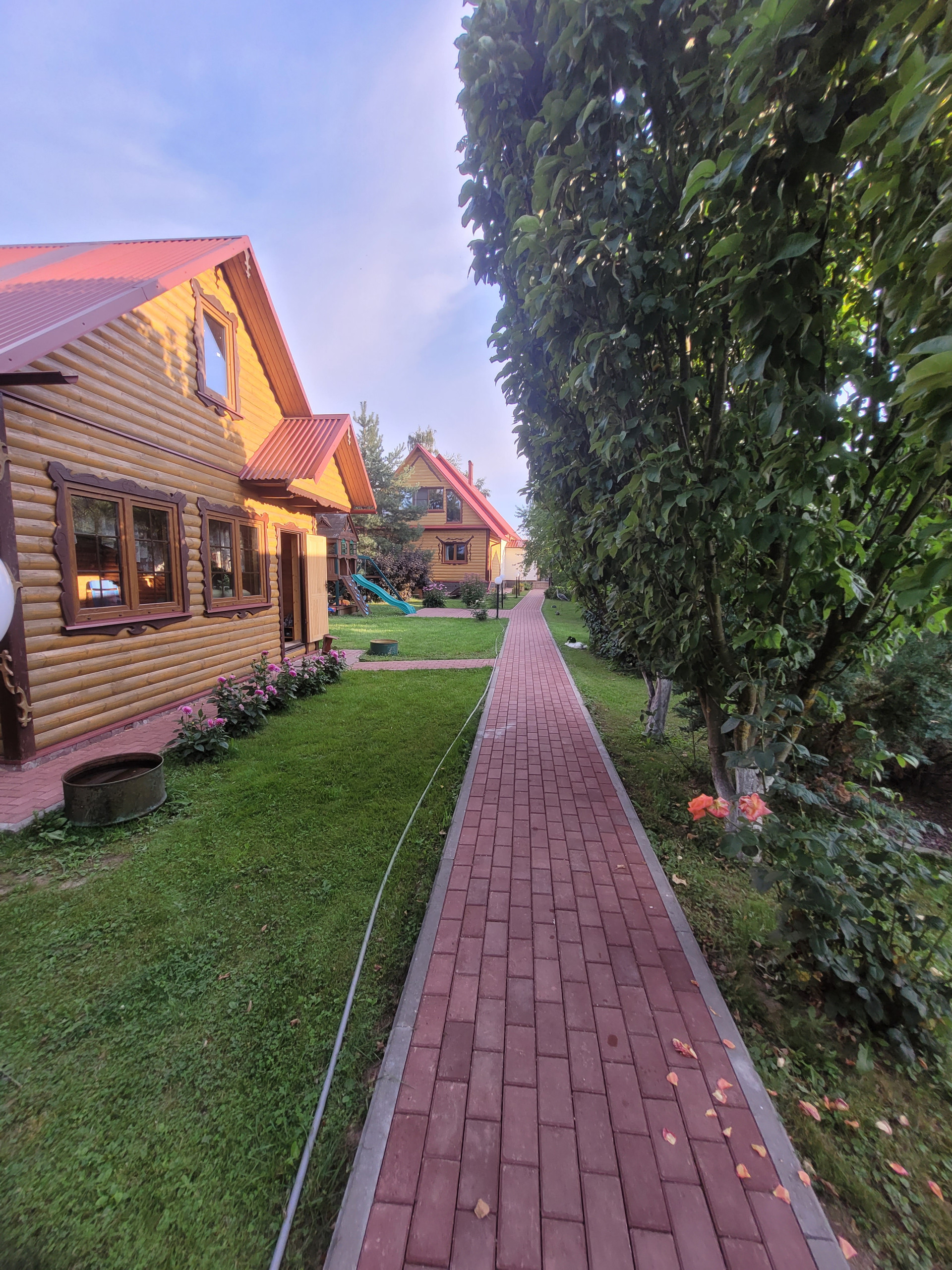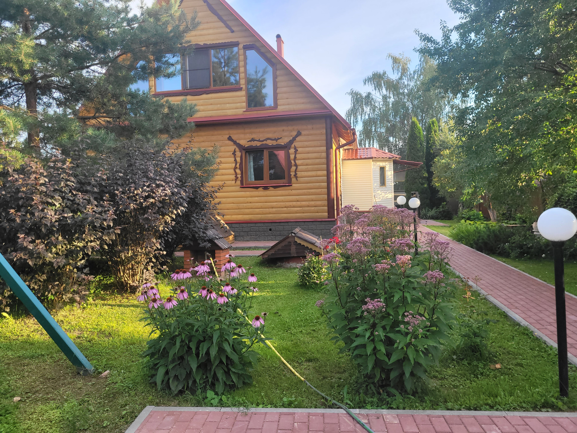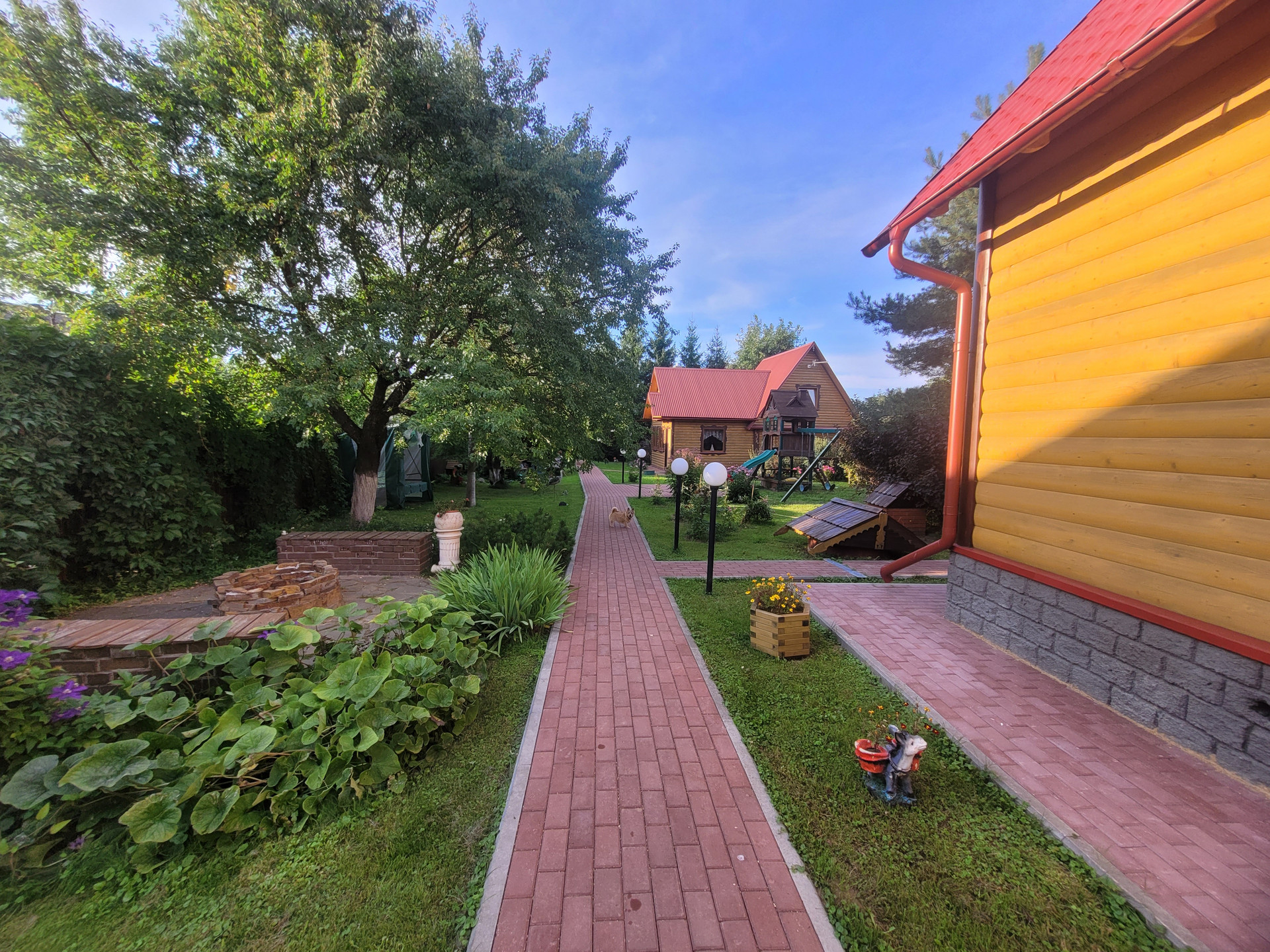 Участок, на котором находится дом, окружен по всему периметру капитальным забором. Автомобили можно оставить либо под навесом перед домом либо в гараже. На участке кроме дома, расположены: баня, пл. 54 м2, летний дом пл. 25м2, три хозяйственные постройки общей пл. 83,1 м2, вольер для собак . Участок благоустроен: туи при входе дают тень в жаркую погоду и придают уютный вид, различные плодовые деревья и кустарники дают хороший урожай яблок, груш, ягод. Мощность электричества составляет 25кВт. При этом выполнено два подключения: наземное и подземное, что позволяет распределить мощность между всеми постройками на участке, не перегружая сеть. Фасад дома облицован сайдингом, стены выполнены из бруса