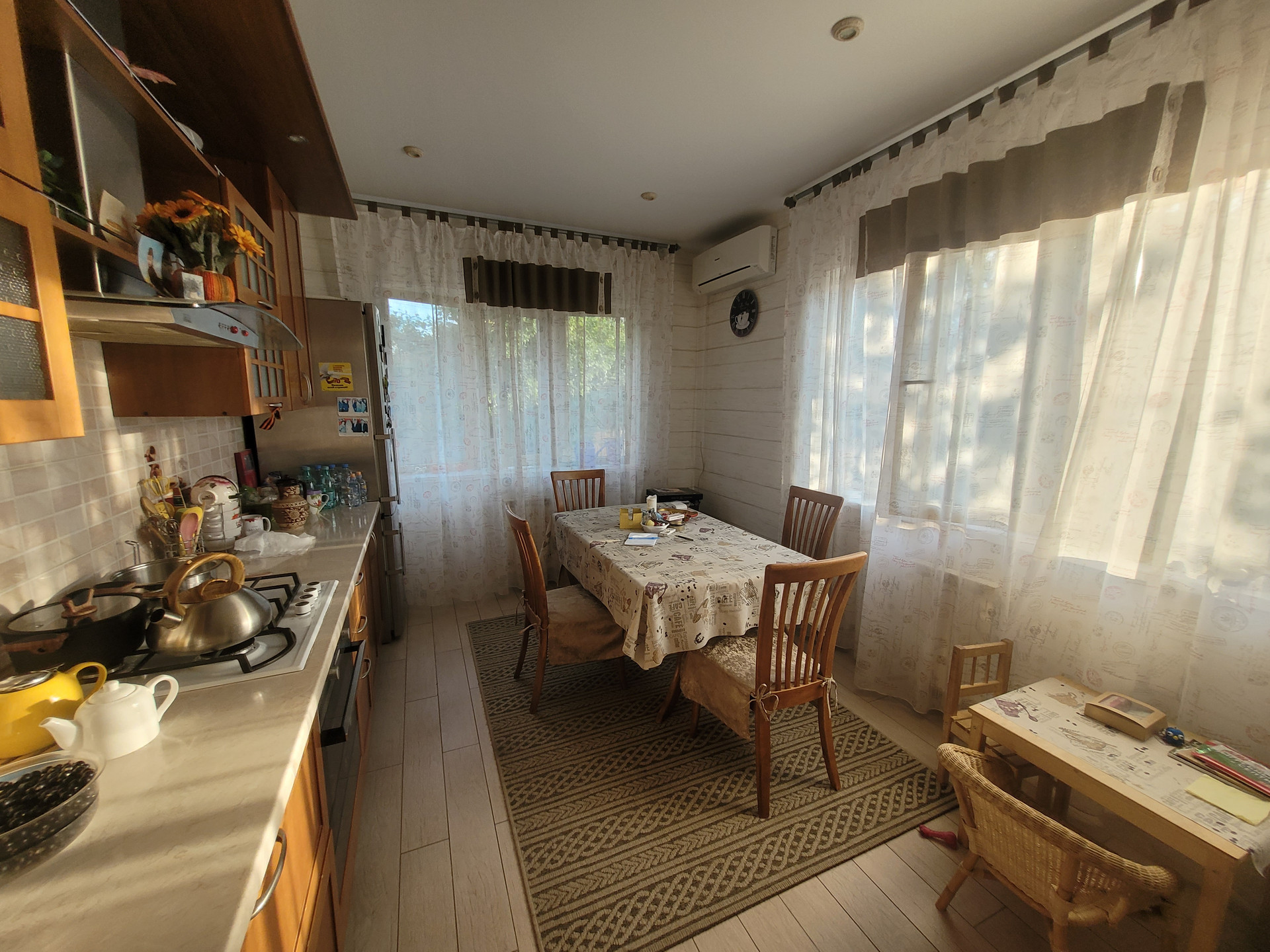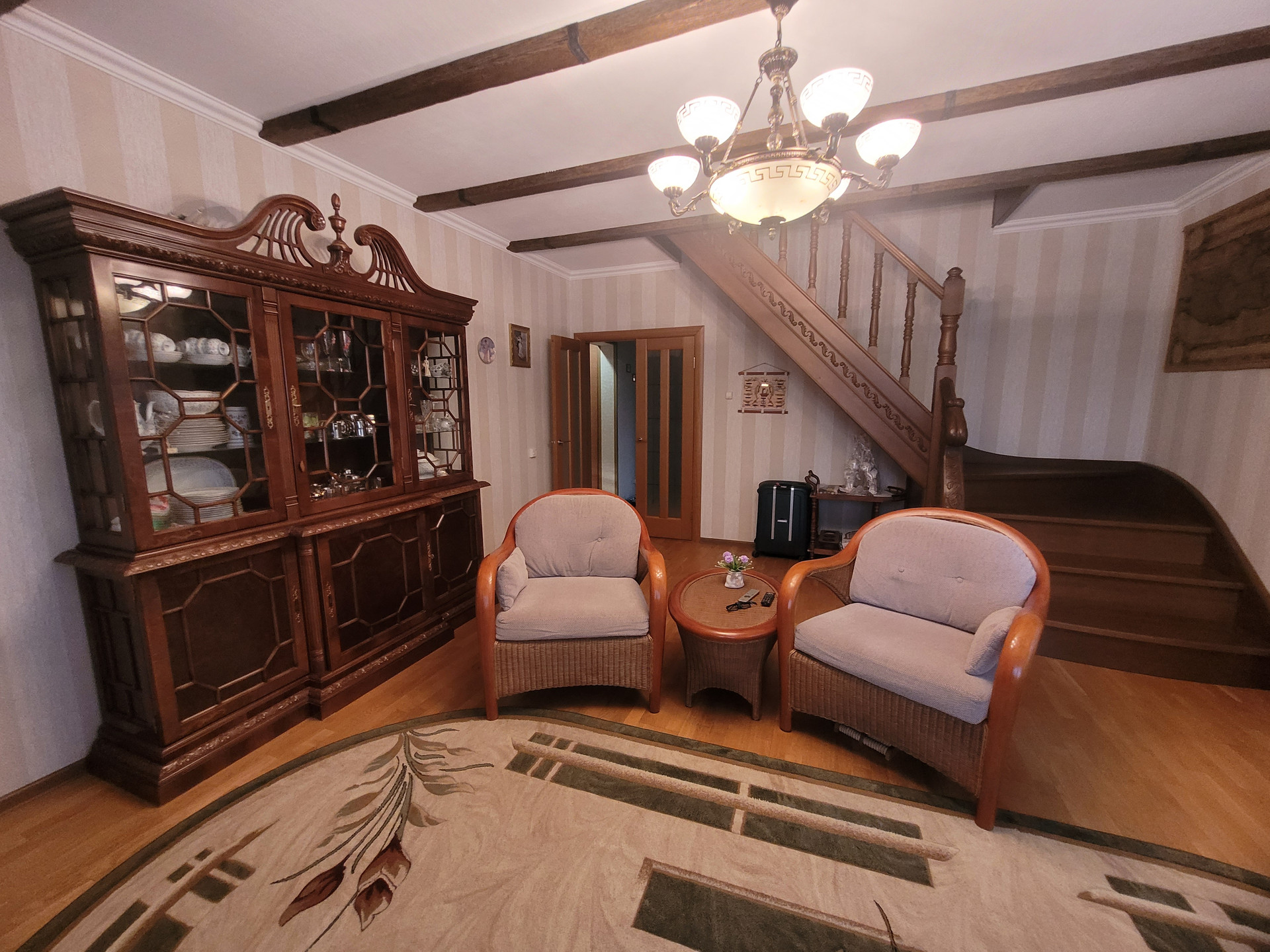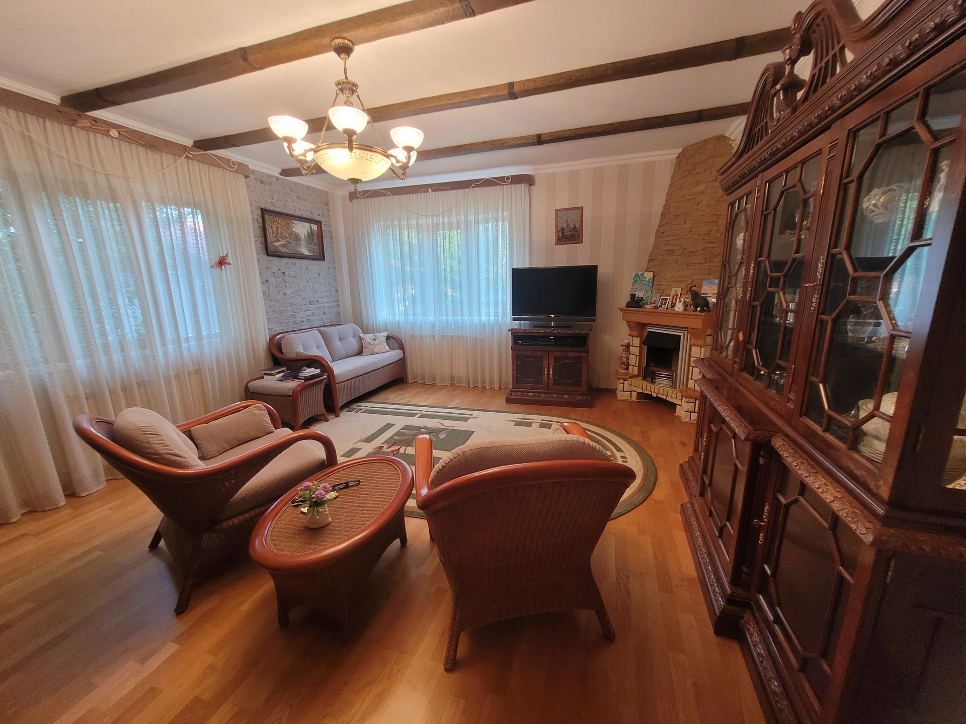 В цокольном этаже, высотой 2,2 м предусмотрена зона отдыха,погреб,зал для бильярда. Вся техника и аппаратура (котлы, бойлеры), расположенные в доме и бане-производства государств Евросоюза. Стены цокольного этажа выполнены из бетонных блоков и дополнительно усилены кирпичом. На первом этаже расположены гостинная, три жилых комнаты, санузел с теплым полом, подсобные помещения, на втором этаже расположены две комнаты, общей площадью 54,6 м2, одна из которых выполняет роль личного кабинета с панорамным видом на все владение, вторая служит спальней. На втором этаже также расположен просторный санузел. После трудовых будней отдохнуть и восстановить силы приятно в бане, которая может послужить и уютным гостевым домом, с дорогим камином производства Финляндии, прошедший проверку временем и сохранивший при этом первозданный вид. На участке найдется место для занятий представителям разных поколений и увлечений.